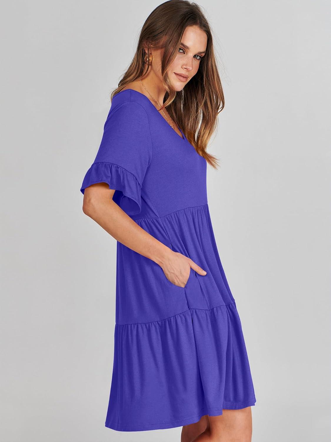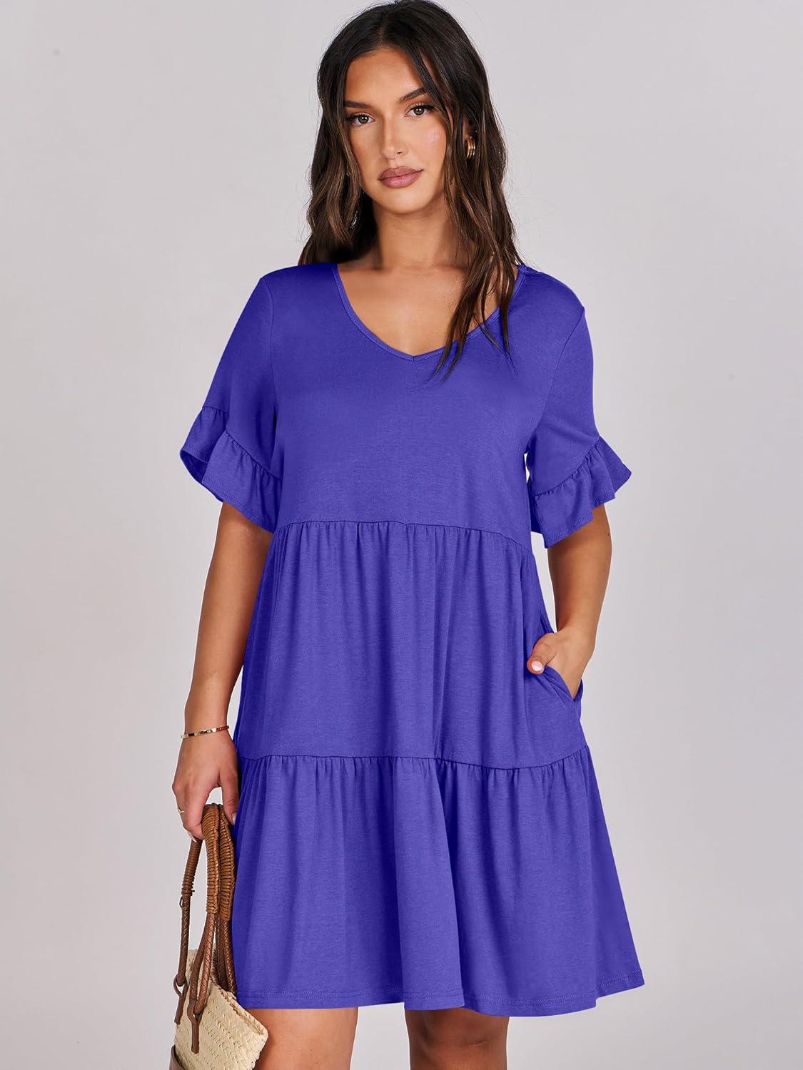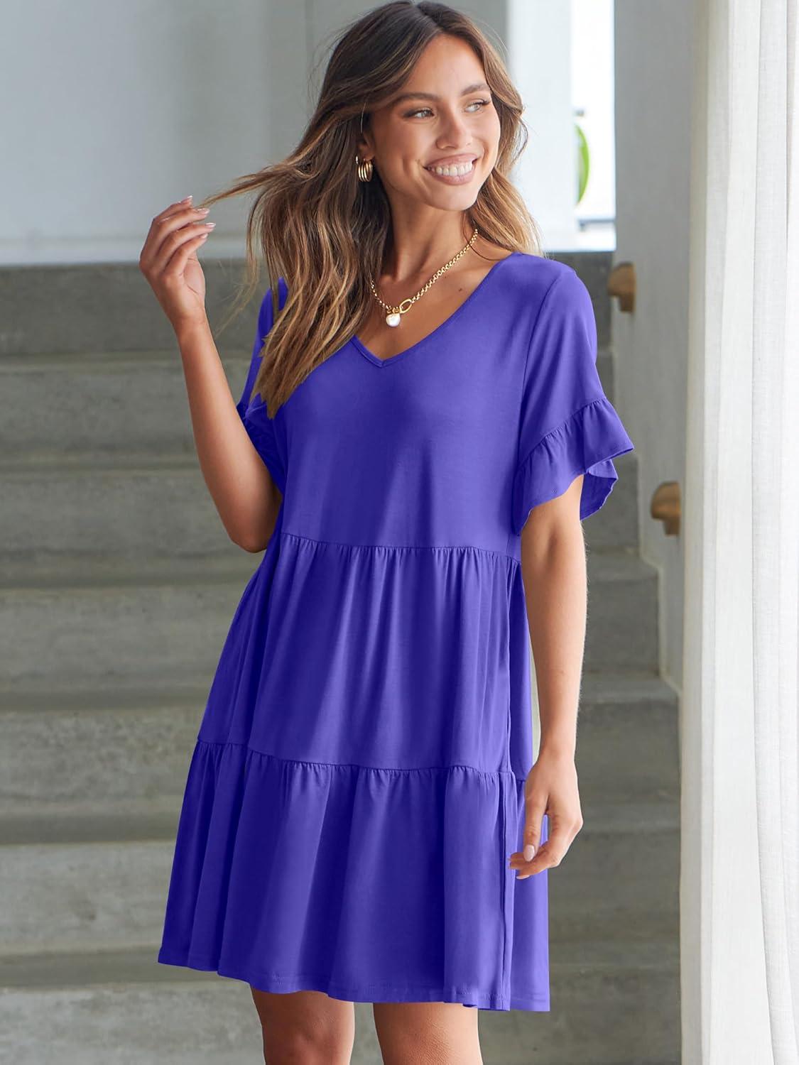 ANRABESS Dresses for Women Summer 2025 V Neck Ruffle Sleeve A Line Tiered Flowy Casual Trendy Mini Beach Dress with Pockets(Royal Blue)