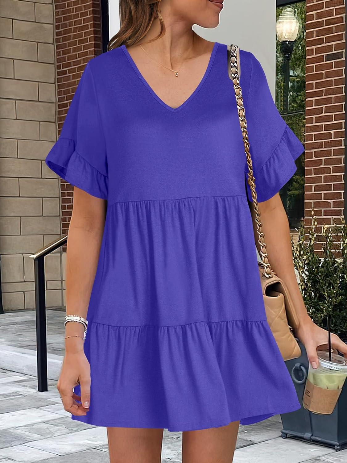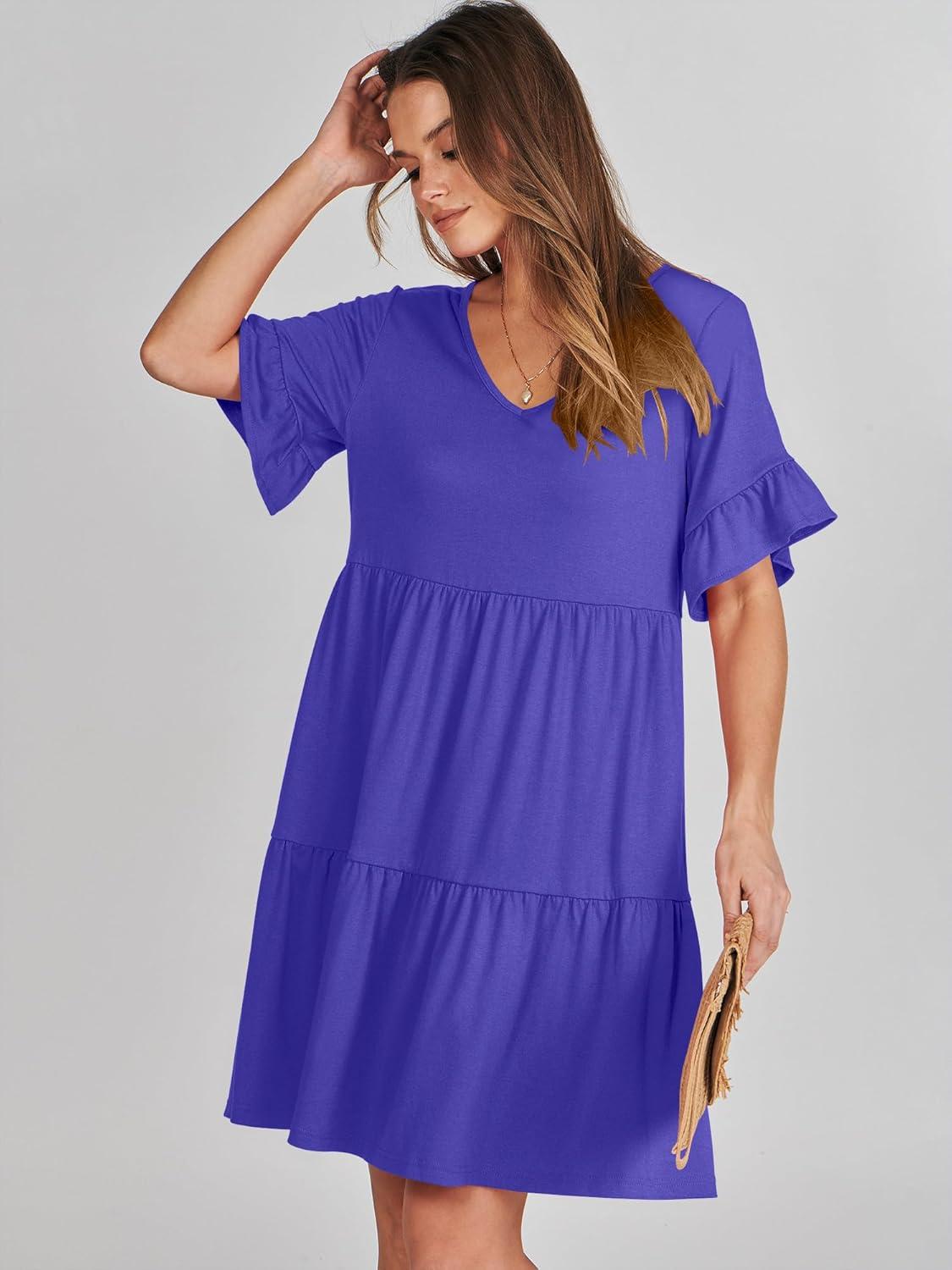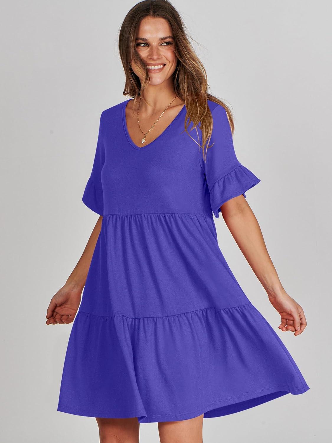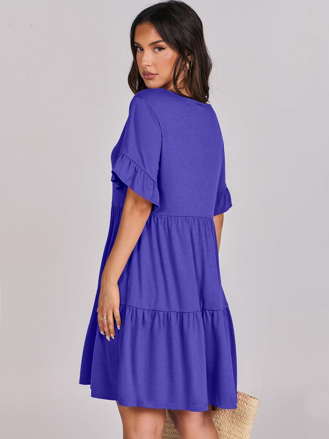 ANRABESS Dresses for Women Summer 2025 V Neck Ruffle Sleeve A Line Tiered Flowy Casual Trendy Mini Beach Dress with Pockets(Royal Blue)