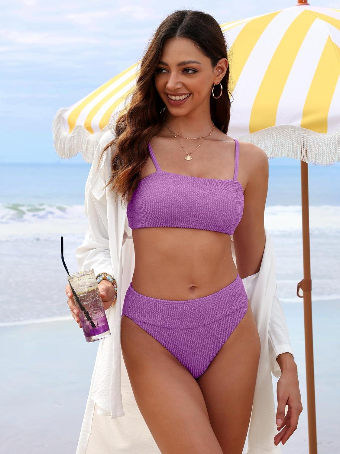 ANRABESS High Waisted Bikini Sets for Women Tummy Control 2 Piece Swimsuits Ribbed Textured Bathing Suits Beach Swimwear(Purple)