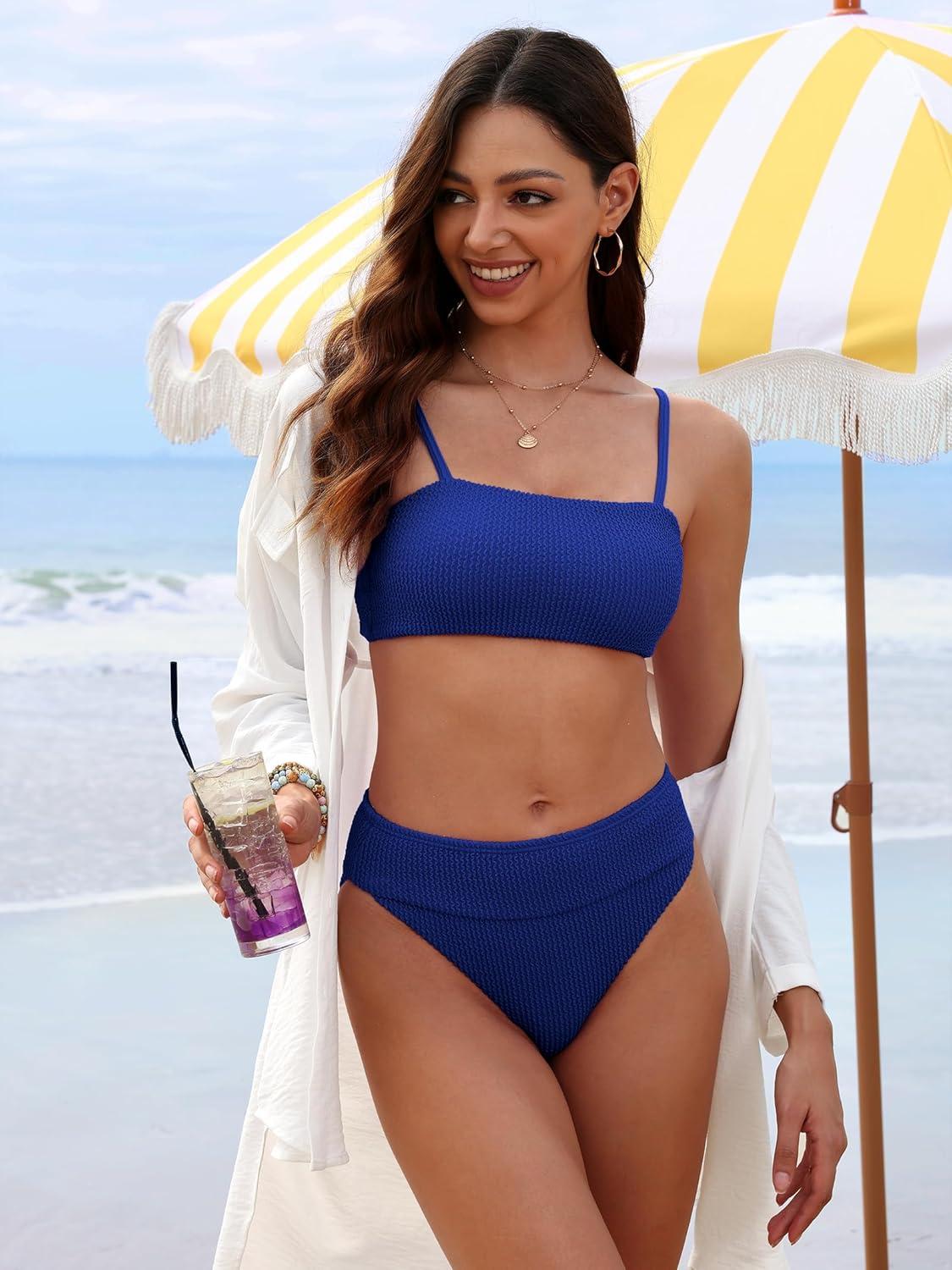ANRABESS High Waisted Bikini Sets for Women Tummy Control 2 Piece Swimsuits Ribbed Textured Bathing Suits Beach Swimwear(Royal Blue)