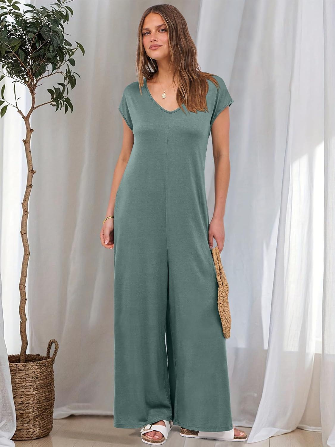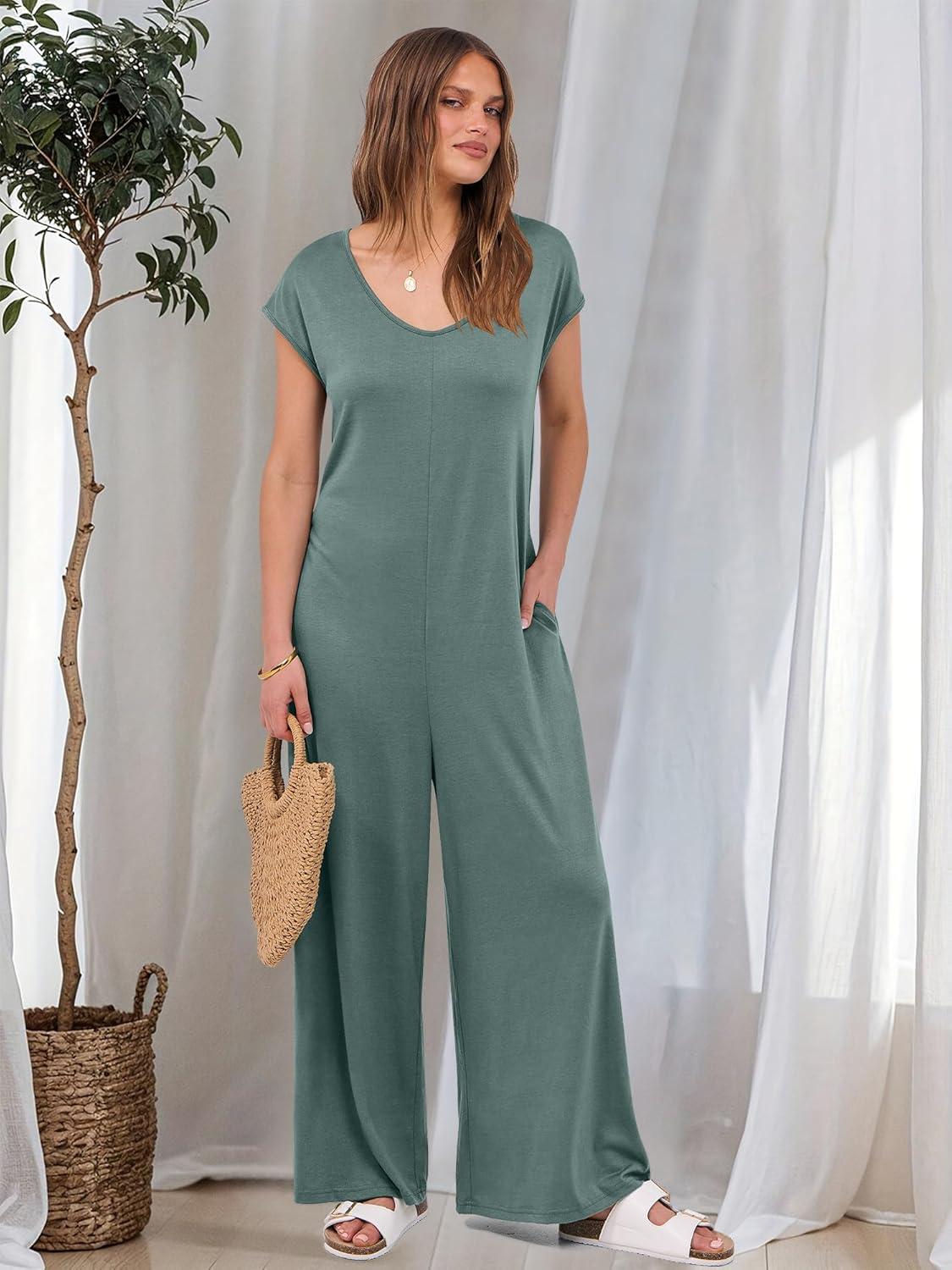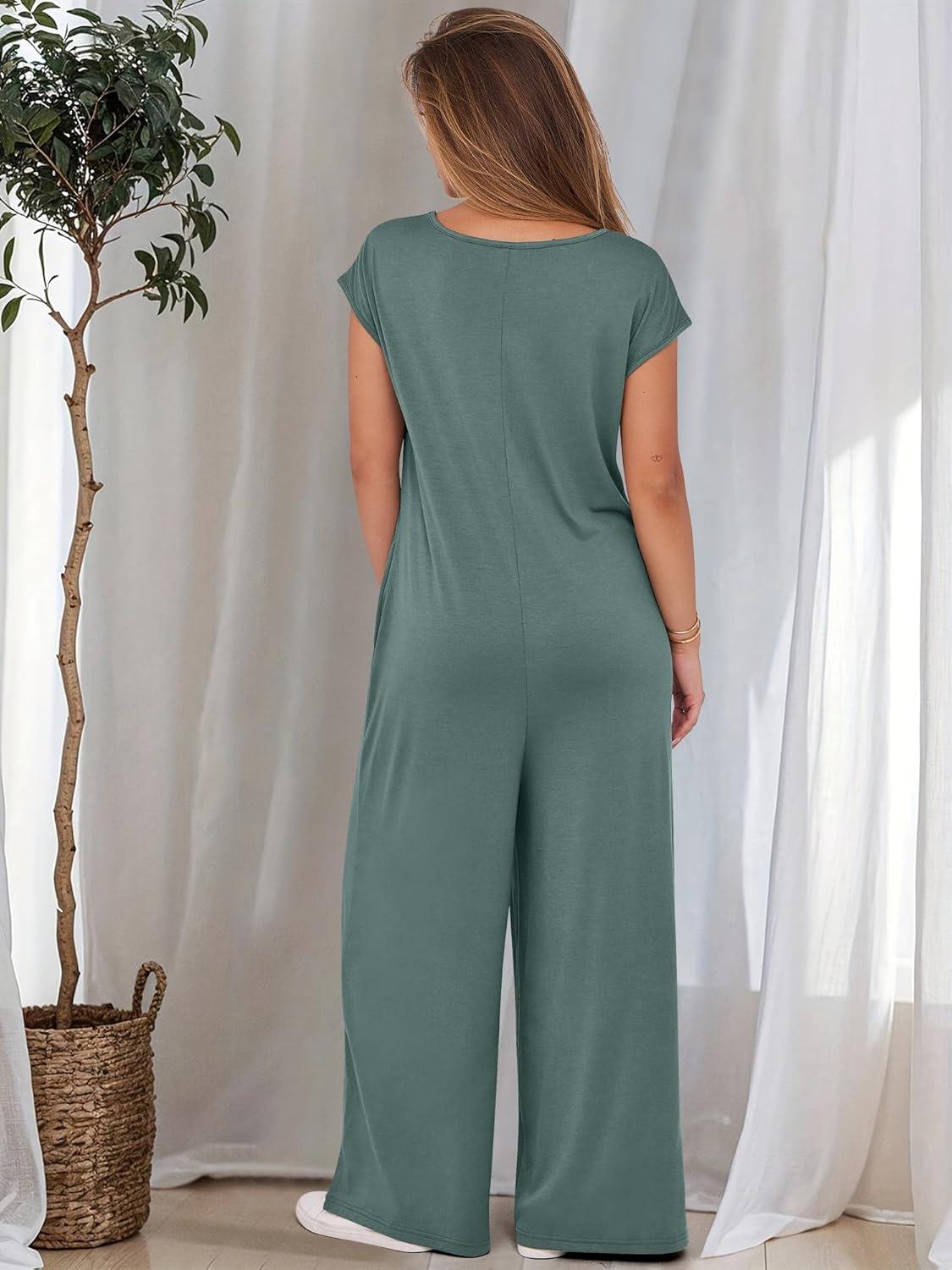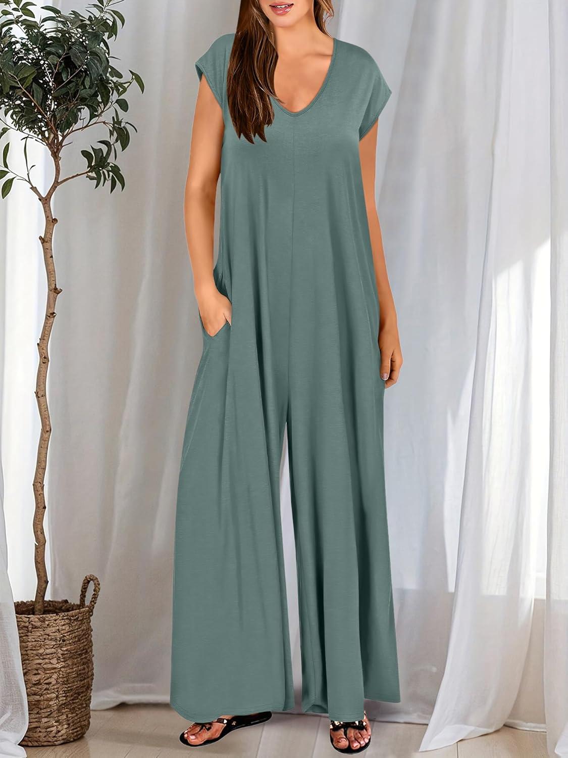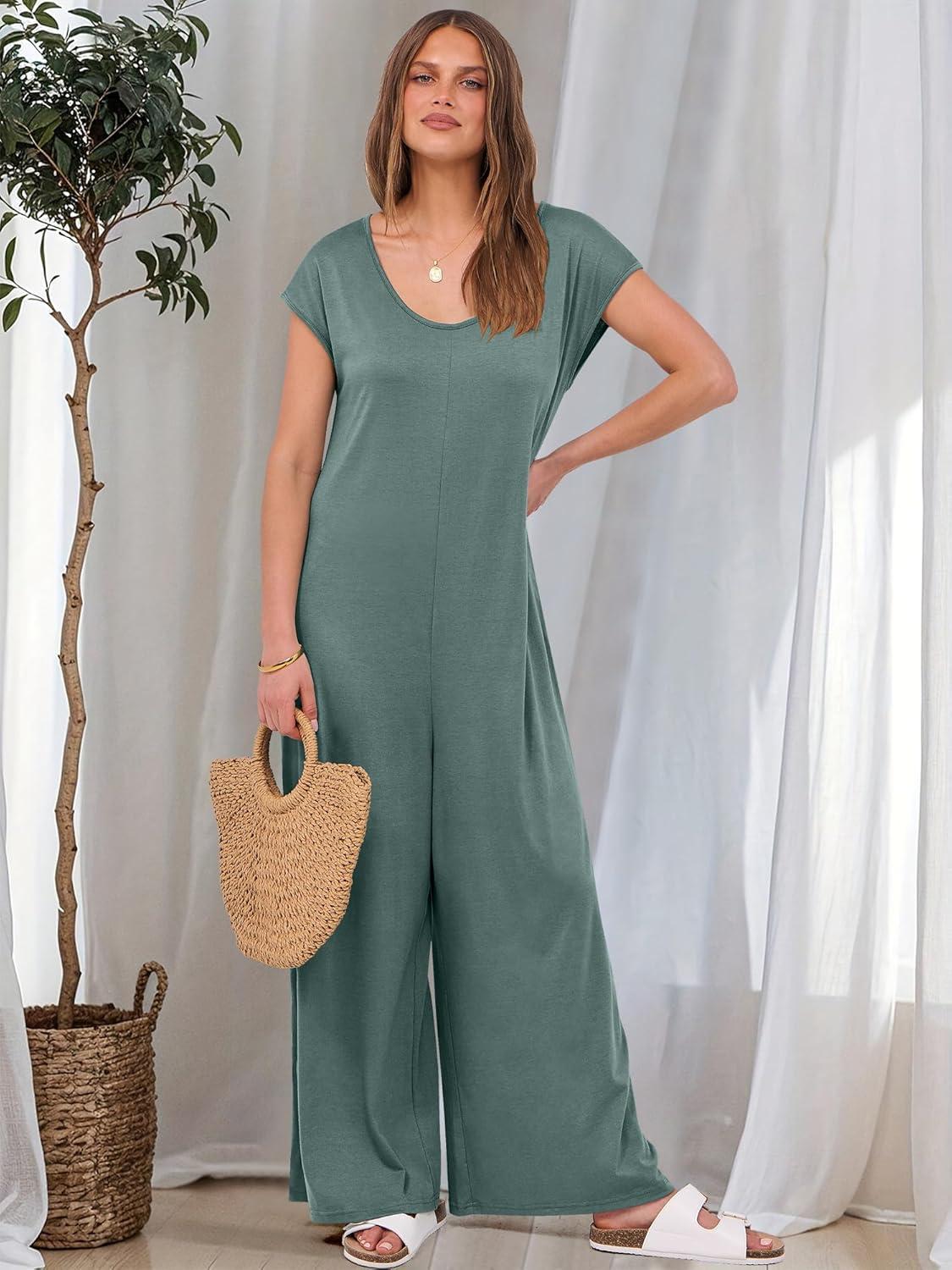 ANRABESS Jumpsuits for Women 2025 Summer Casual Loose Cap Sleeve Crewneck Wide Leg Rompers Jumper One Piece Beach Outfits(Green)