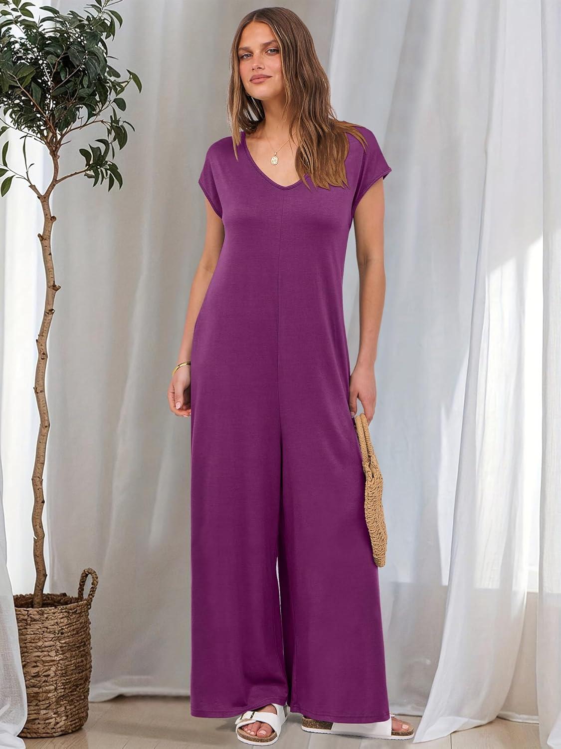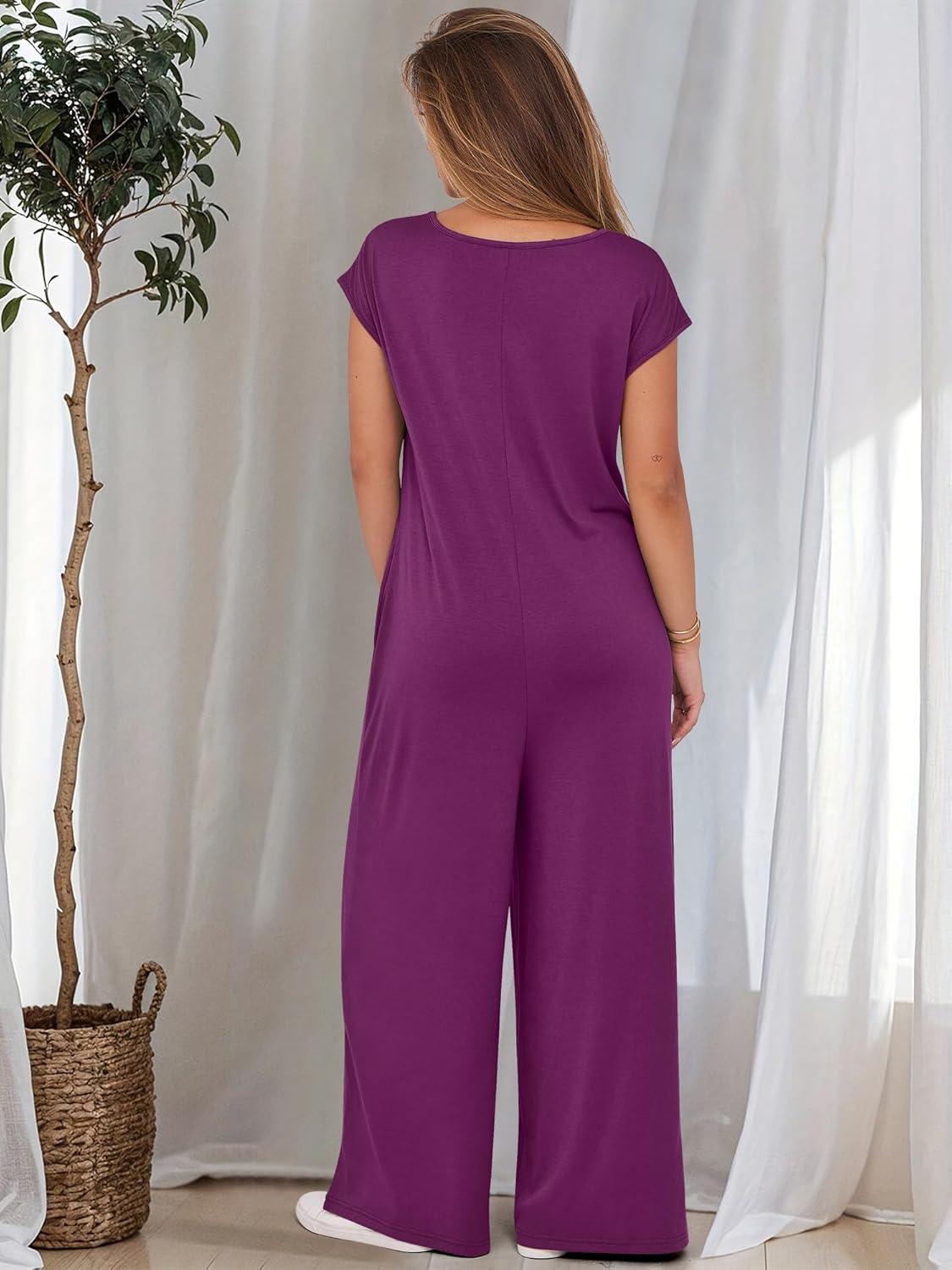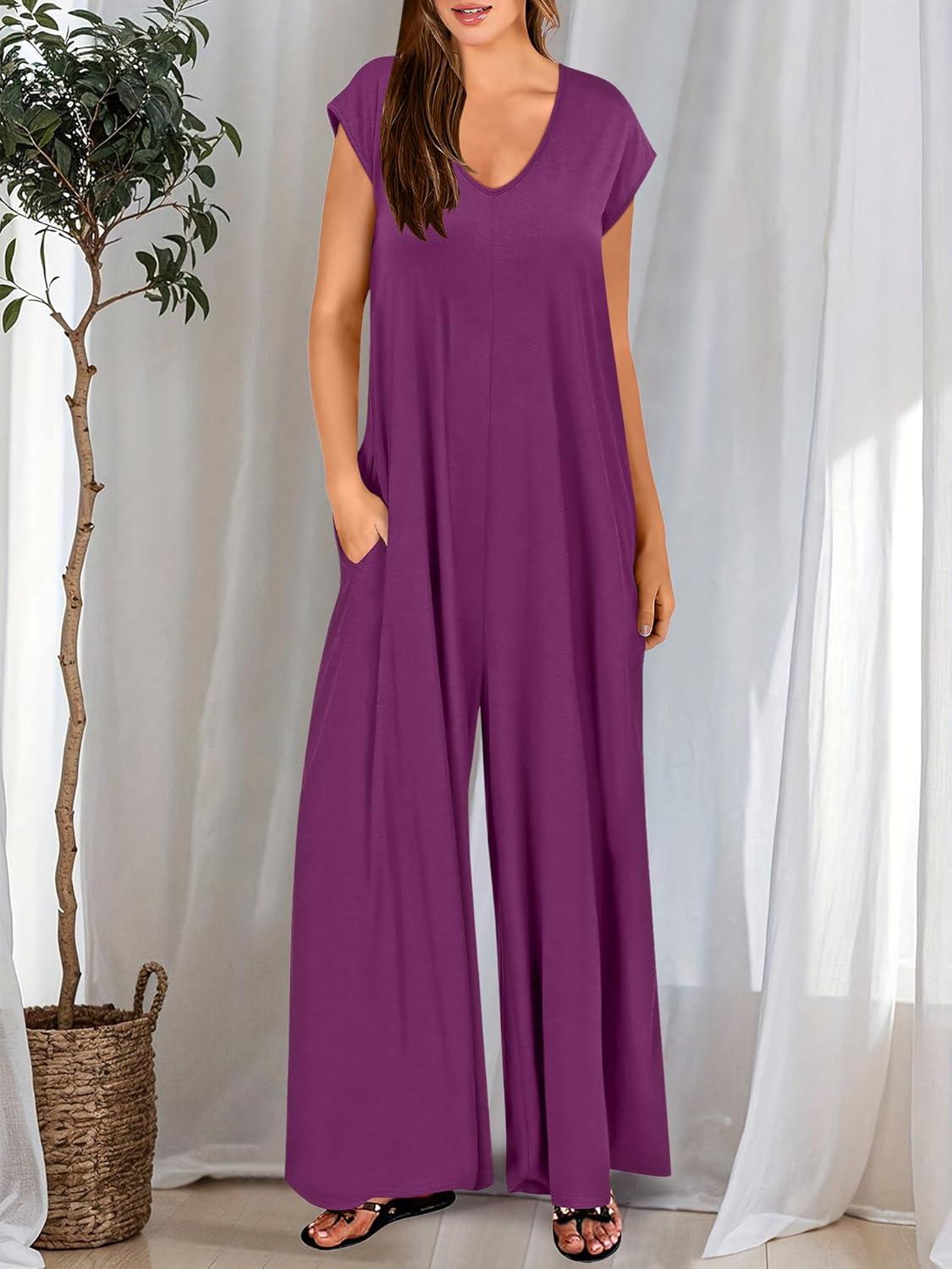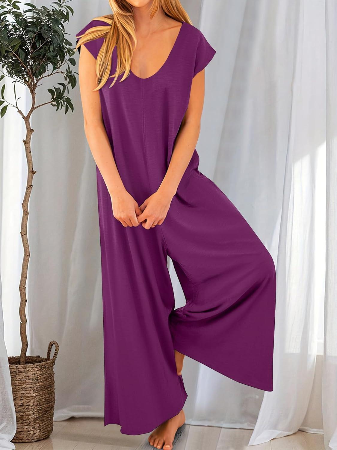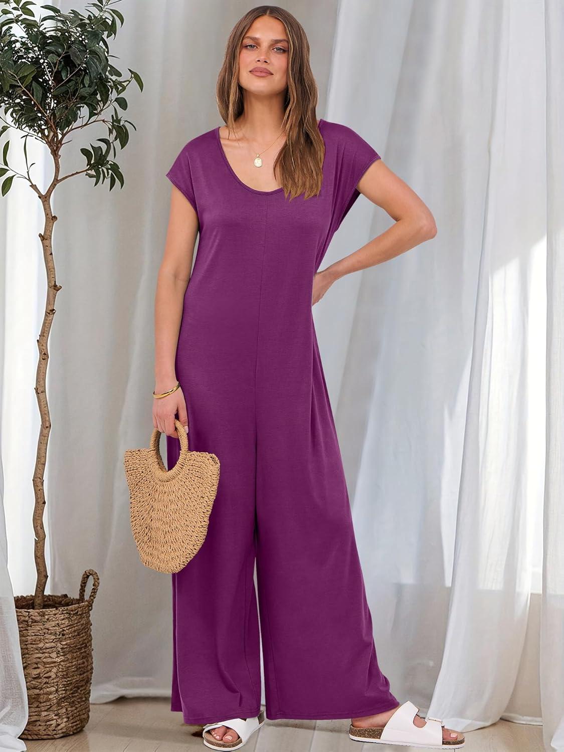 ANRABESS Jumpsuits for Women 2025 Summer Casual Loose Cap Sleeve Crewneck Wide Leg Rompers Jumper One Piece Beach Outfits(Purple Red)