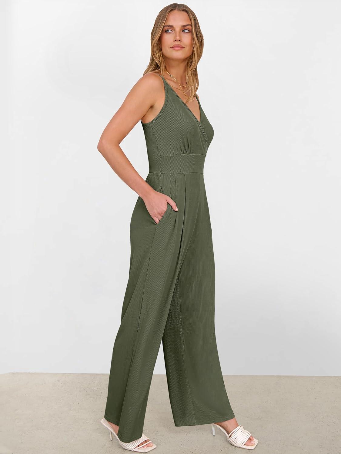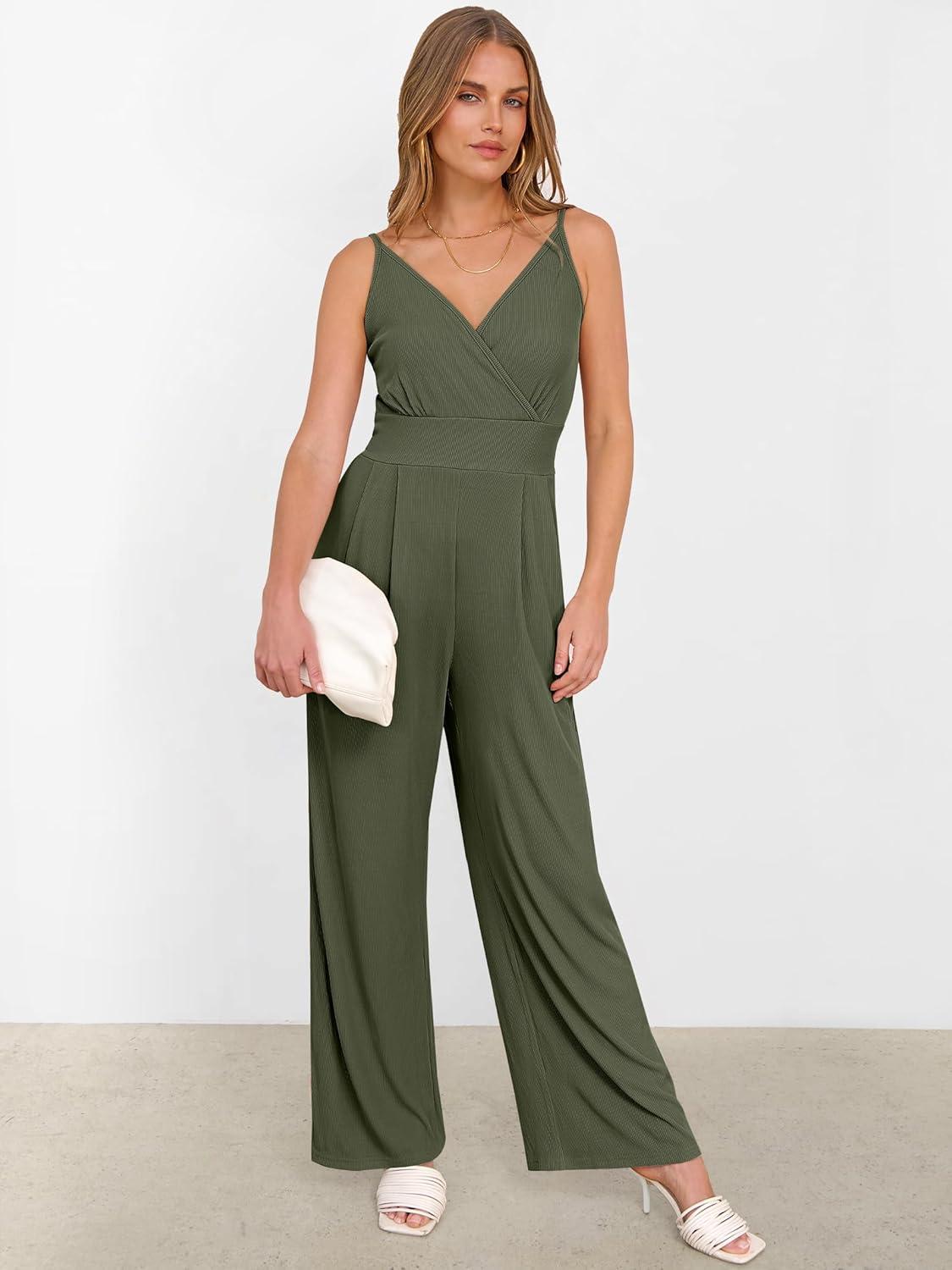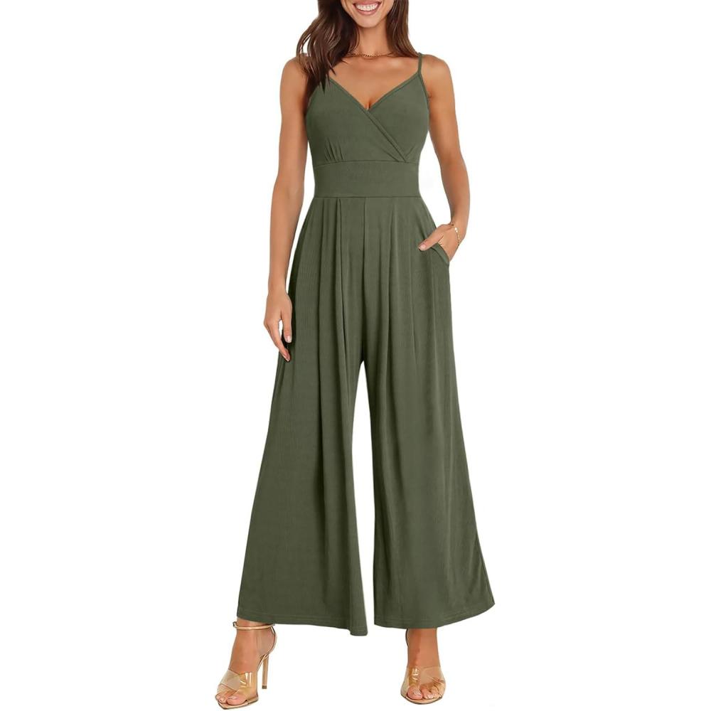 ANRABESS Jumpsuits for Women 2025 Summer Dressy Spaghetti Strap Ribbed V Neck Wide Leg Overalls Flowy Romper Jumpers Outfits(Army Green)