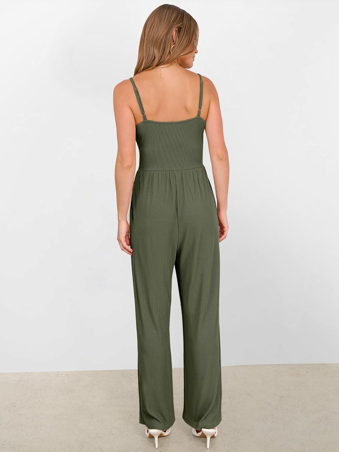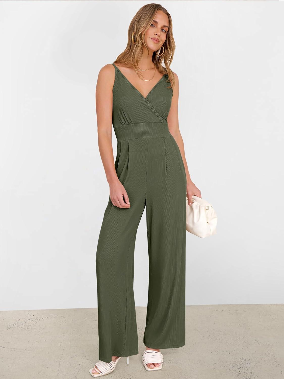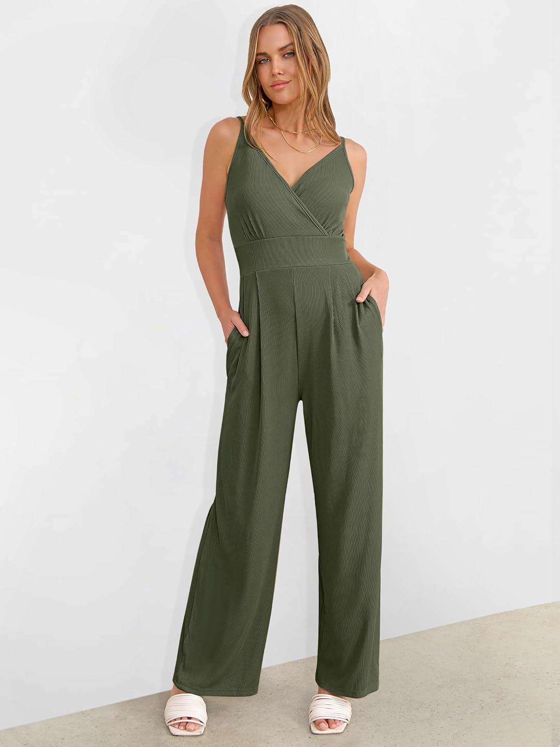 ANRABESS Jumpsuits for Women 2025 Summer Dressy Spaghetti Strap Ribbed V Neck Wide Leg Overalls Flowy Romper Jumpers Outfits(Army Green)