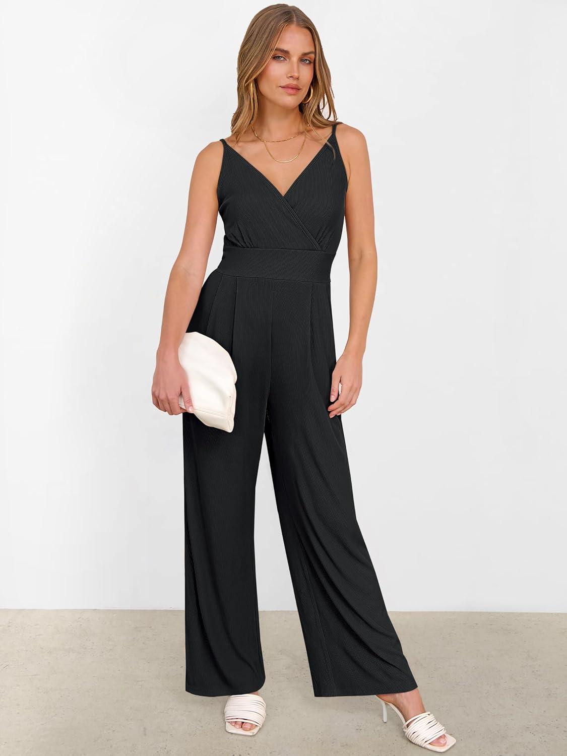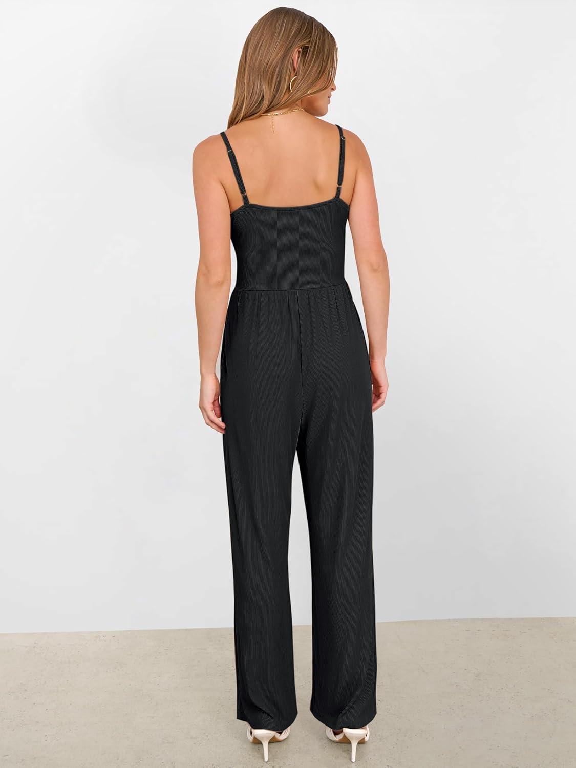 ANRABESS Jumpsuits for Women 2025 Summer Dressy Spaghetti Strap Ribbed V Neck Wide Leg Overalls Flowy Romper Jumpers Outfits(Black)