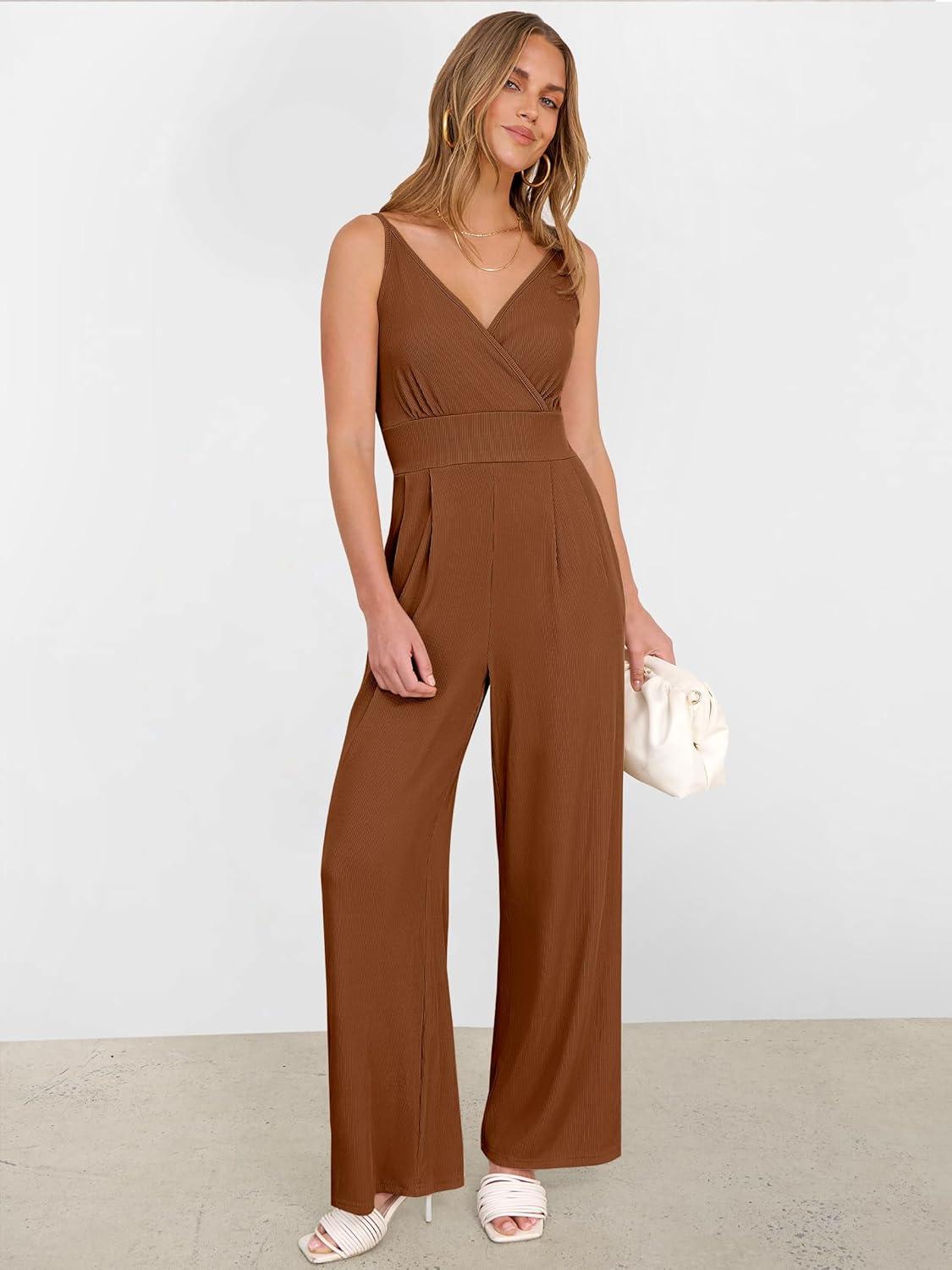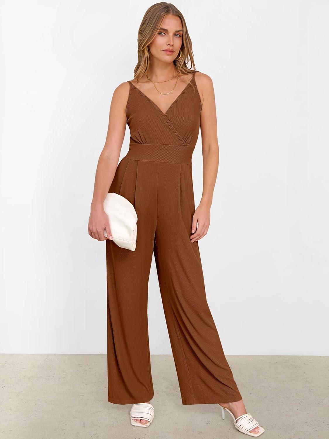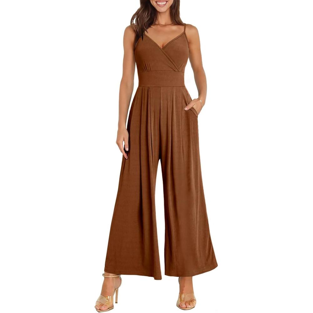 ANRABESS Jumpsuits for Women 2025 Summer Dressy Spaghetti Strap Ribbed V Neck Wide Leg Overalls Flowy Romper Jumpers Outfits(Caramel)
