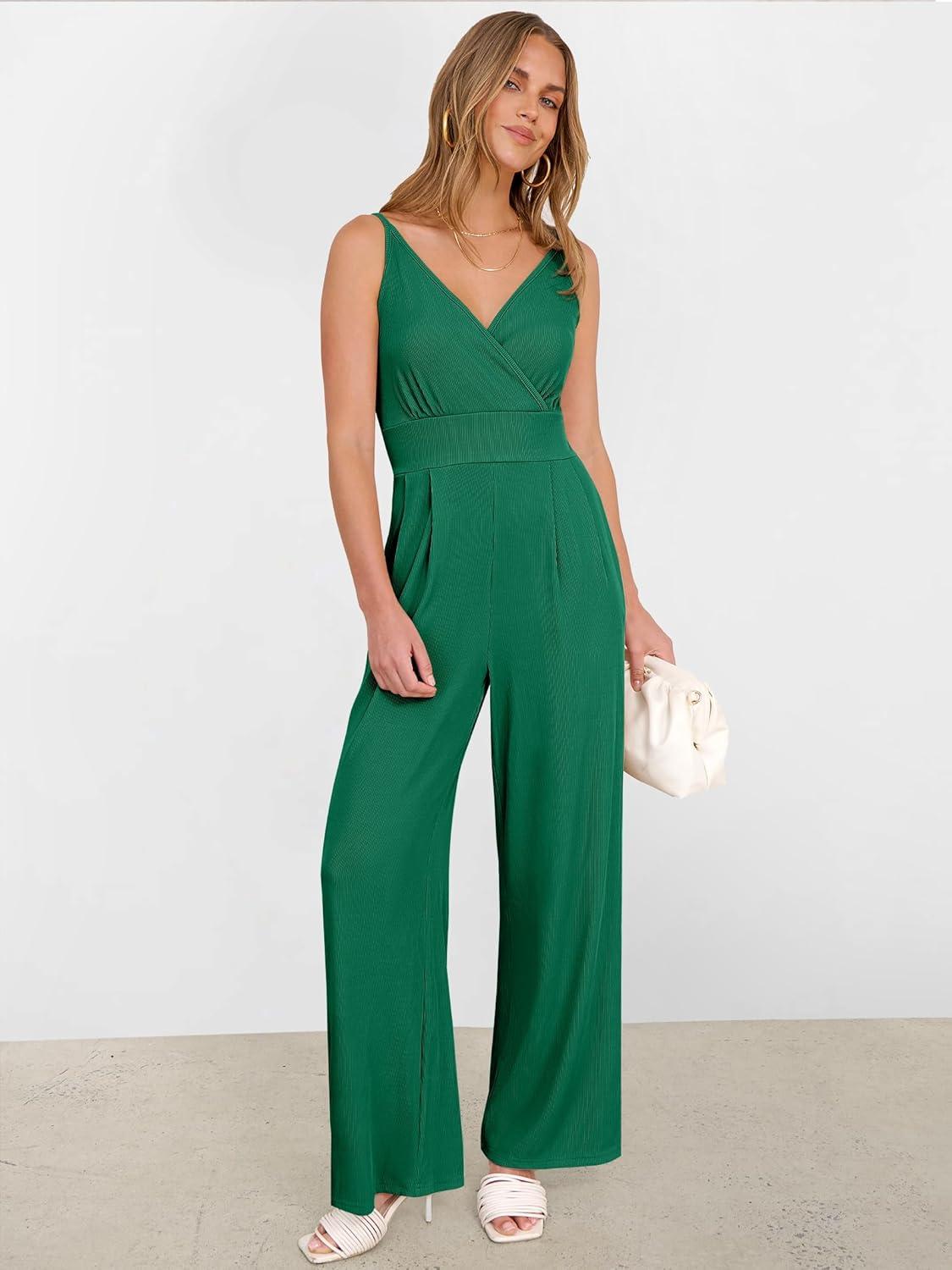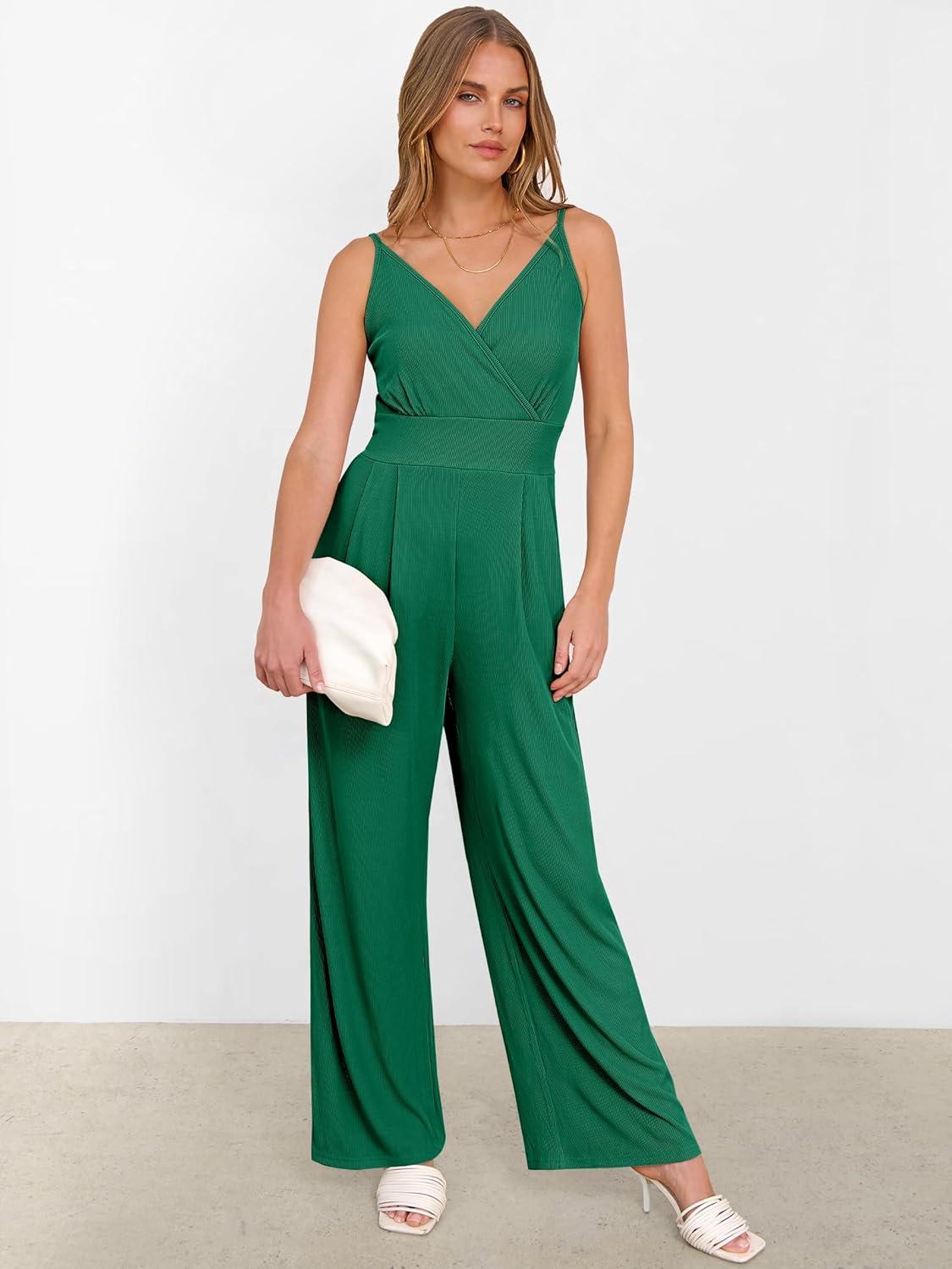 ANRABESS Jumpsuits for Women 2025 Summer Dressy Spaghetti Strap Ribbed V Neck Wide Leg Overalls Flowy Romper Jumpers Outfits(Deep Green)