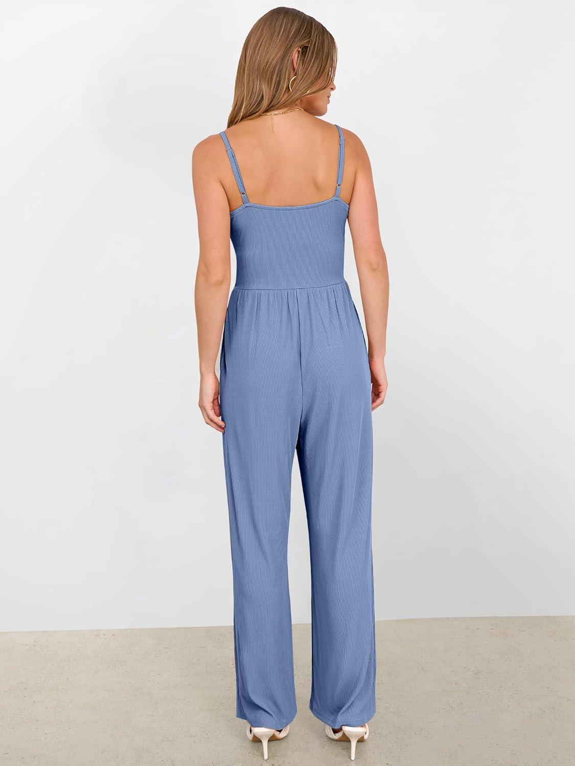 ANRABESS Jumpsuits for Women 2025 Summer Dressy Spaghetti Strap Ribbed V Neck Wide Leg Overalls Flowy Romper Jumpers Outfits(Dusty Blue)