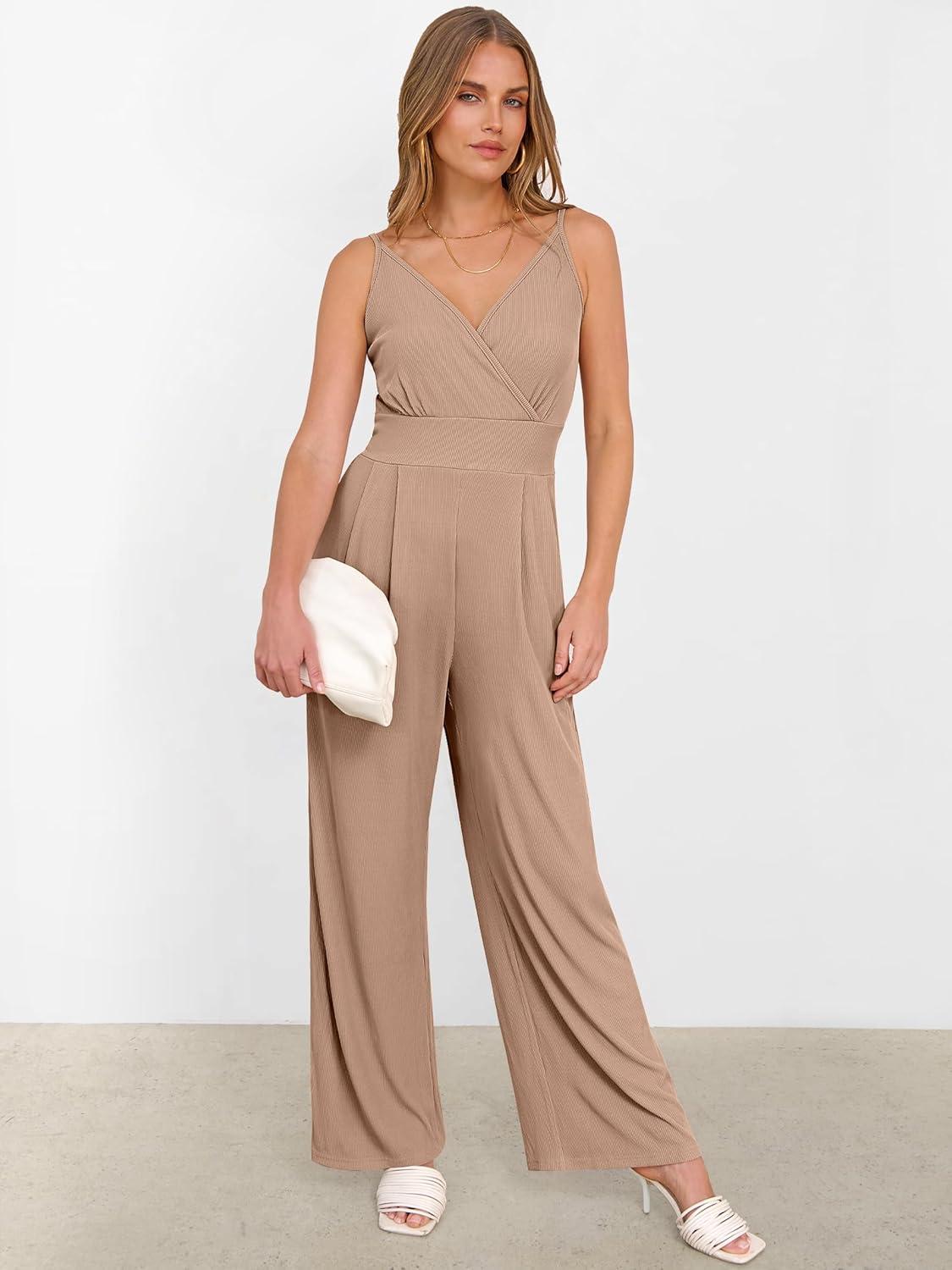 imageANRABESS Jumpsuits for Women 2025 Summer Dressy Spaghetti Strap Ribbed V Neck Wide Leg Overalls Flowy Romper Jumpers OutfitsLight Brown
