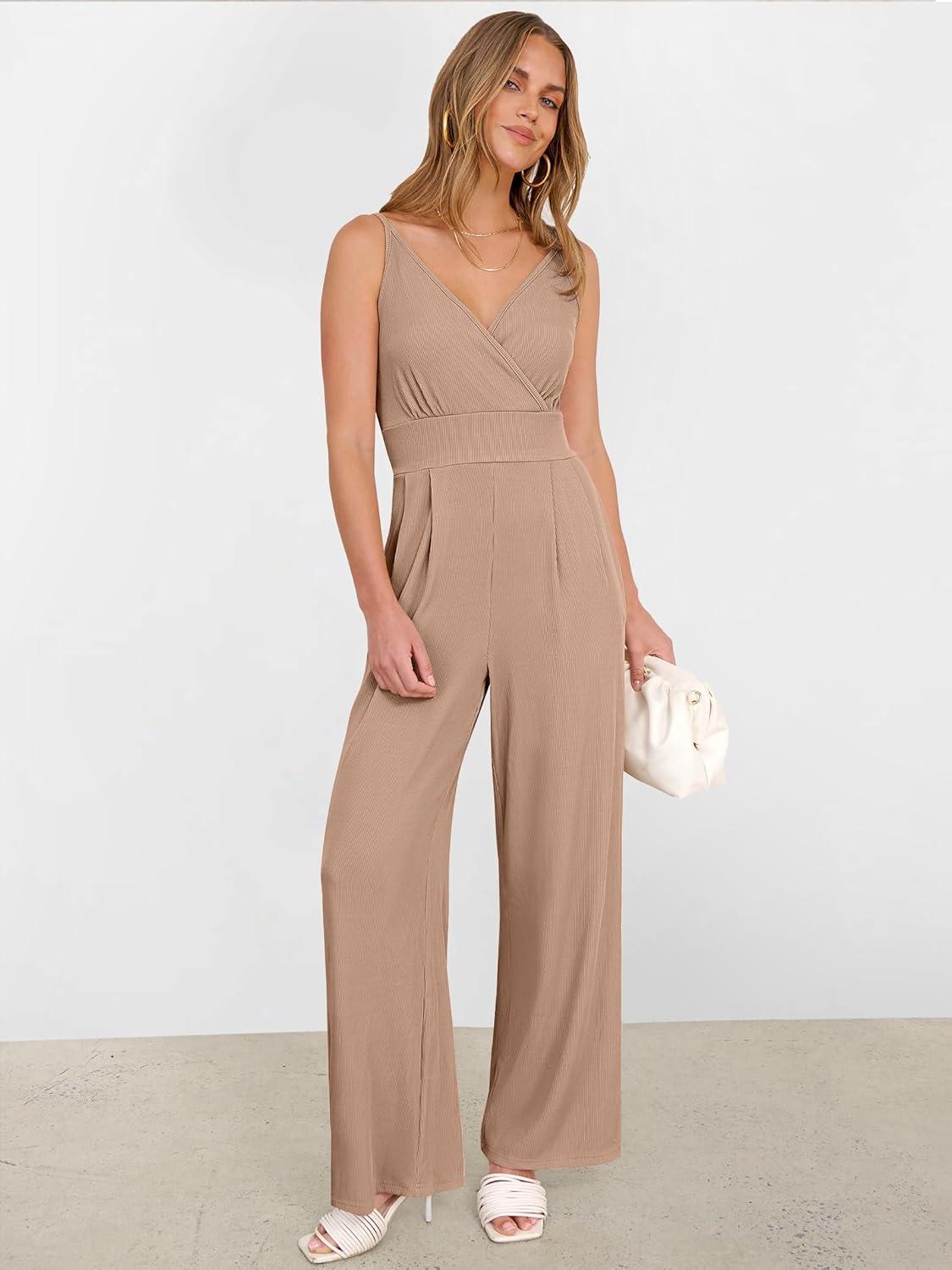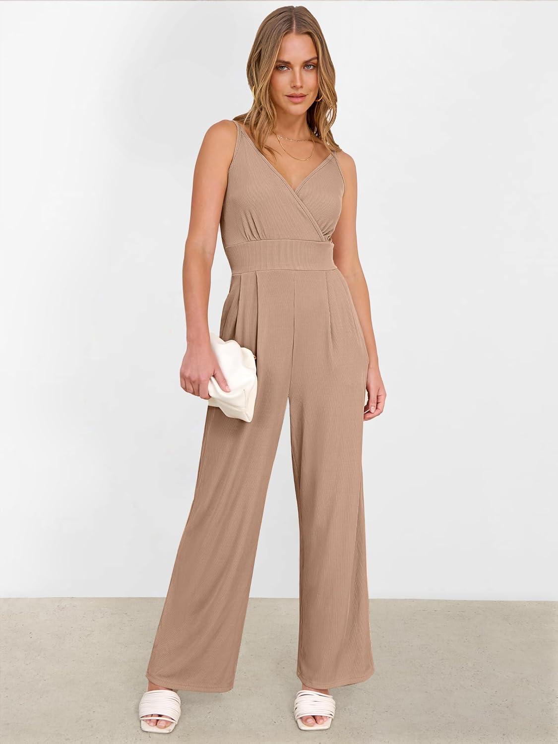 ANRABESS Jumpsuits for Women 2025 Summer Dressy Spaghetti Strap Ribbed V Neck Wide Leg Overalls Flowy Romper Jumpers Outfits(Light Brown)