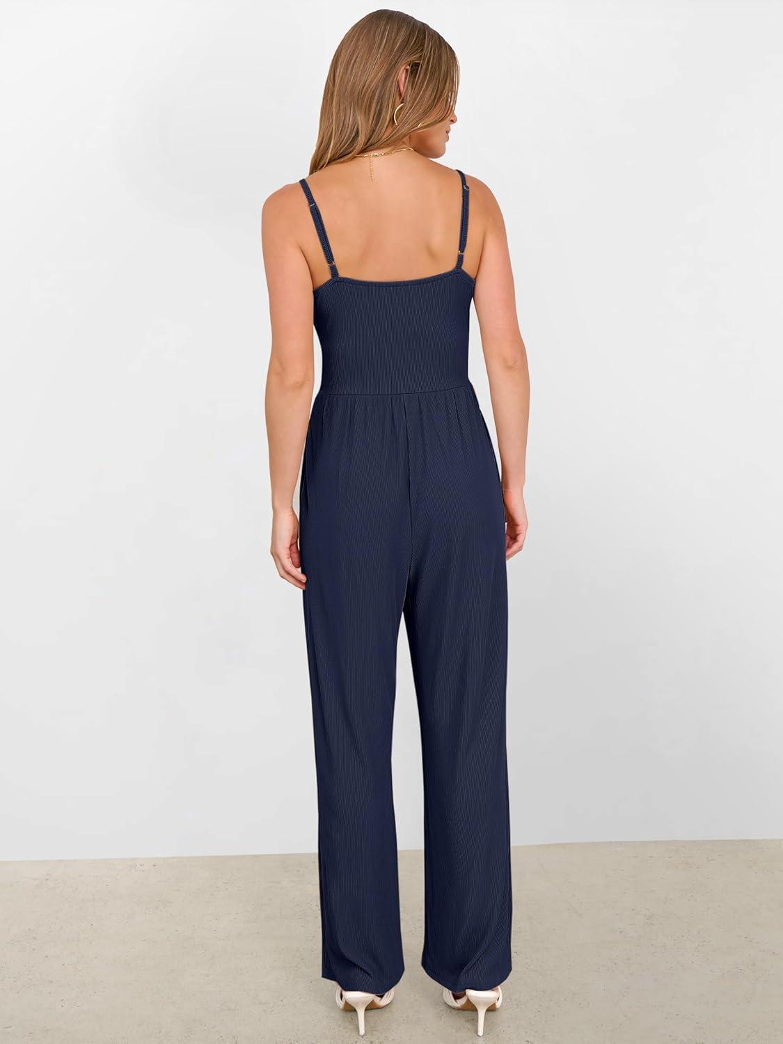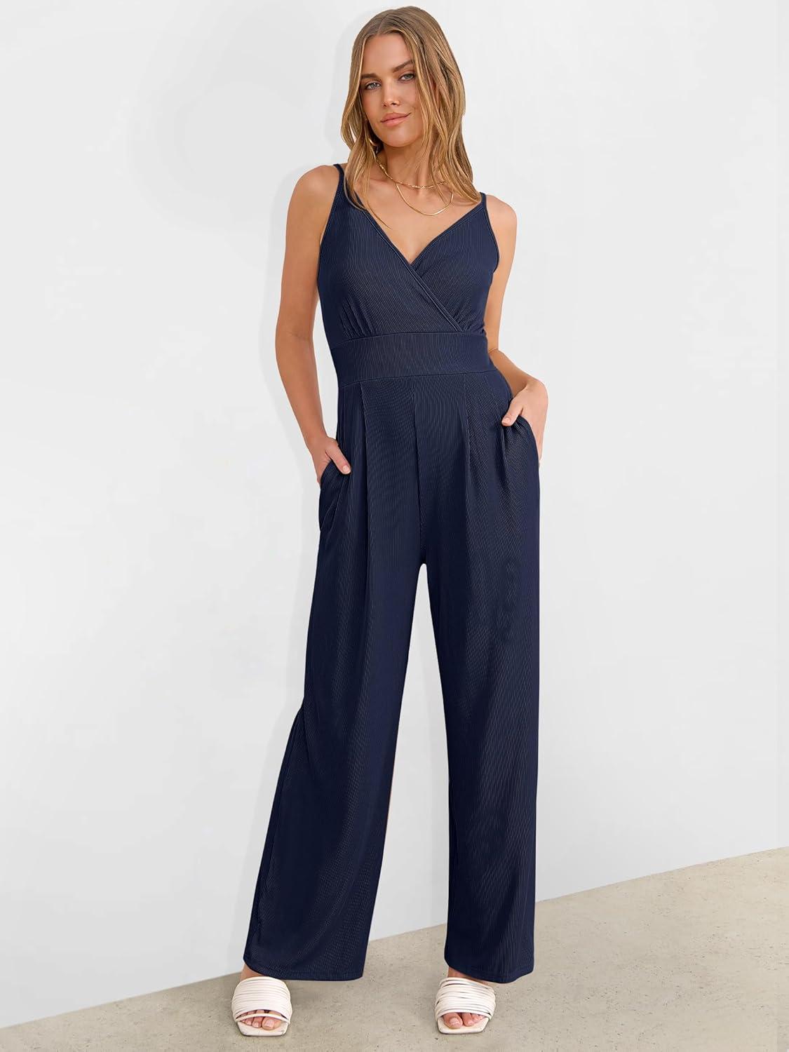 ANRABESS Jumpsuits for Women 2025 Summer Dressy Spaghetti Strap Ribbed V Neck Wide Leg Overalls Flowy Romper Jumpers Outfits(Navy Blue)