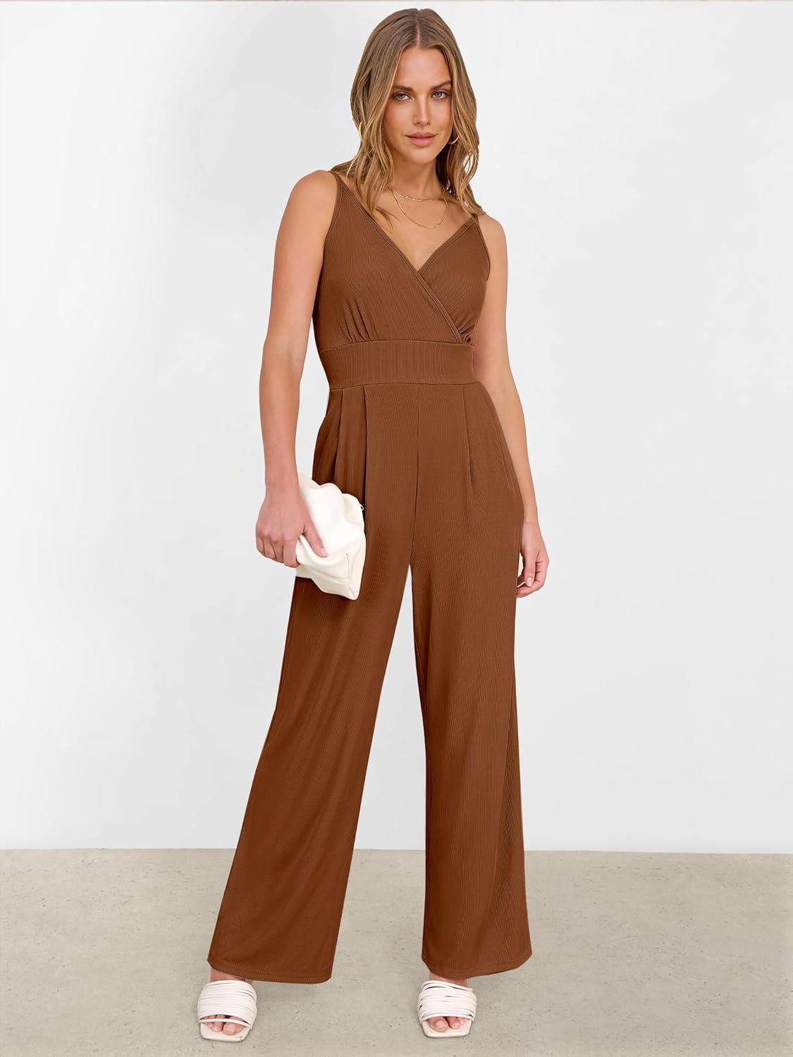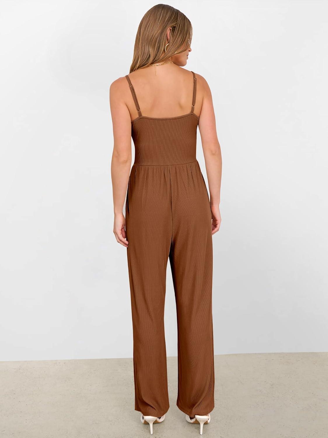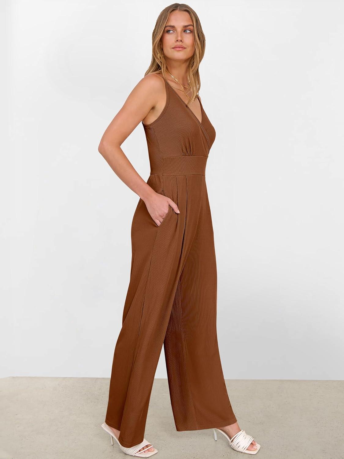 ANRABESS Jumpsuits for Women 2026 Summer Dressy Spaghetti Strap Ribbed V Neck Wide Leg Overalls Flowy Romper Jumpers Outfits(Caramel)
