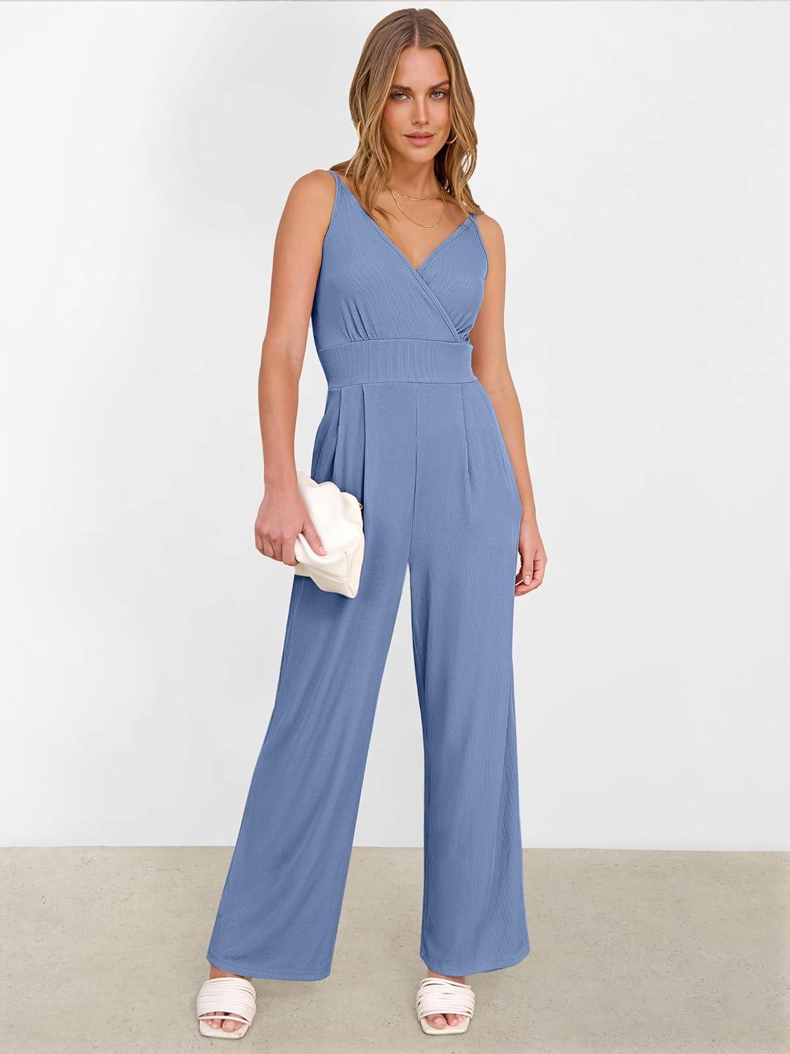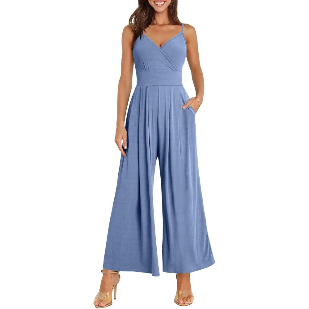 ANRABESS Jumpsuits for Women 2026 Summer Dressy Spaghetti Strap Ribbed V Neck Wide Leg Overalls Flowy Romper Jumpers Outfits(Dusty Blue)