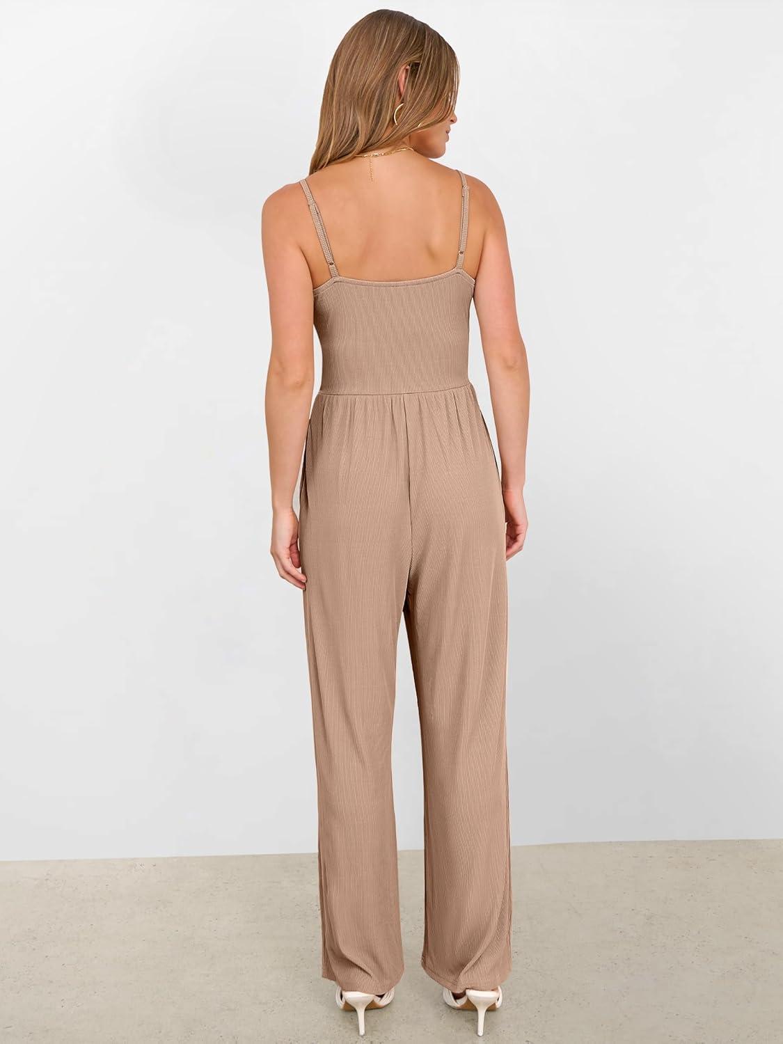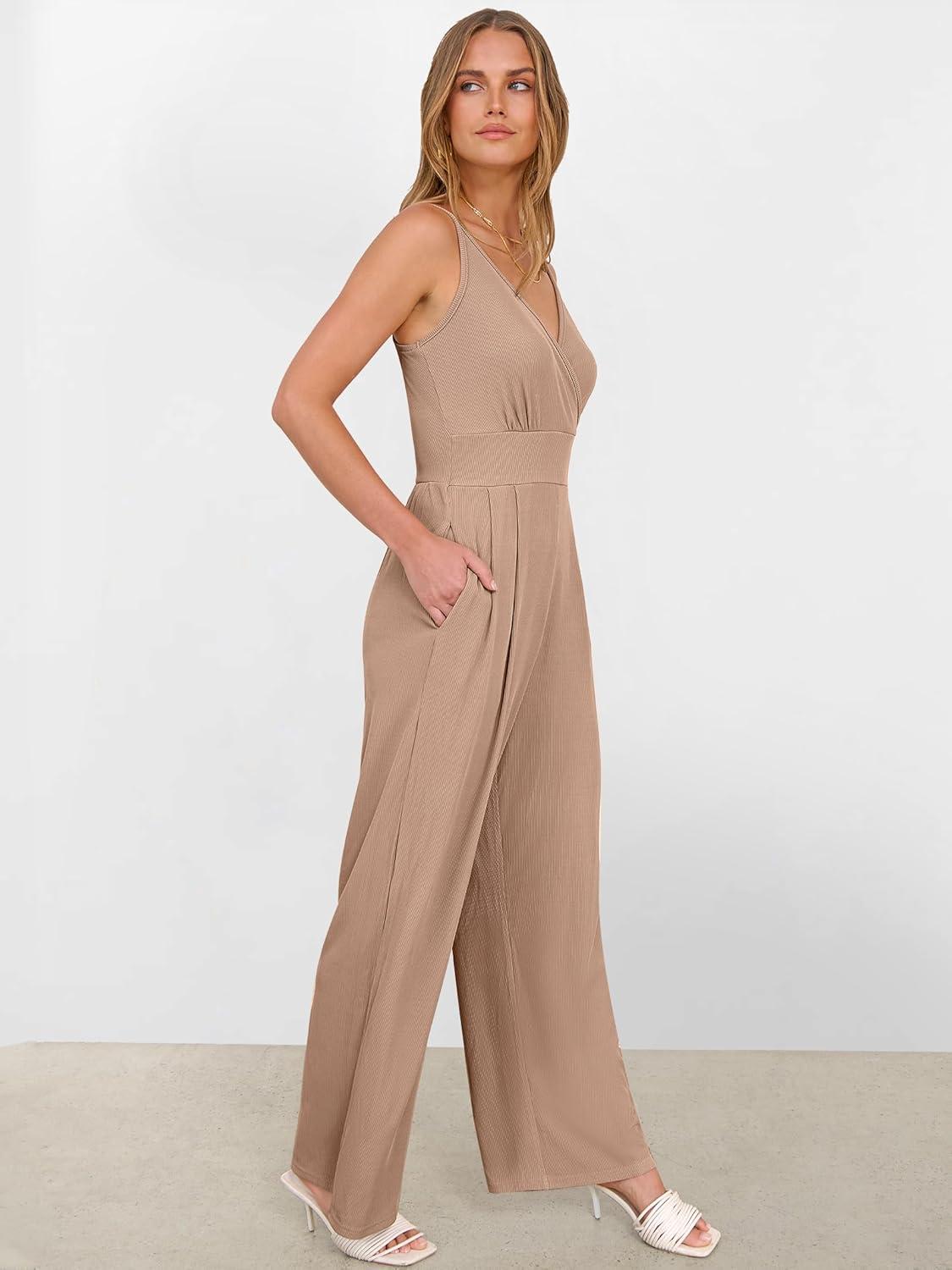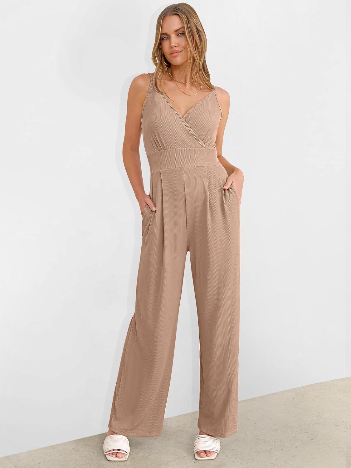 ANRABESS Jumpsuits for Women 2026 Summer Dressy Spaghetti Strap Ribbed V Neck Wide Leg Overalls Flowy Romper Jumpers Outfits(Light Brown)