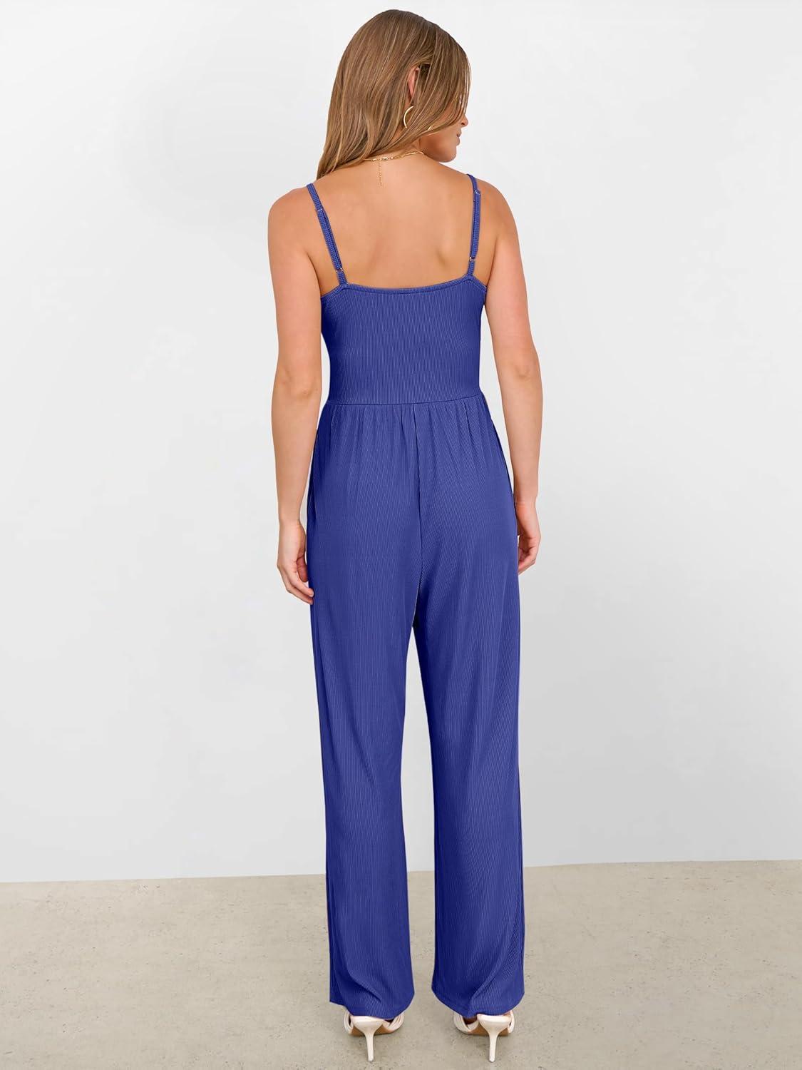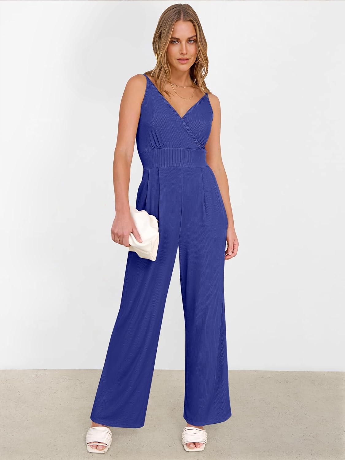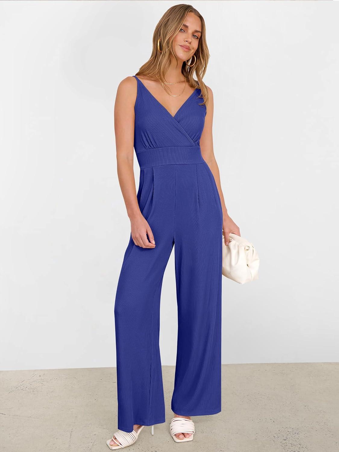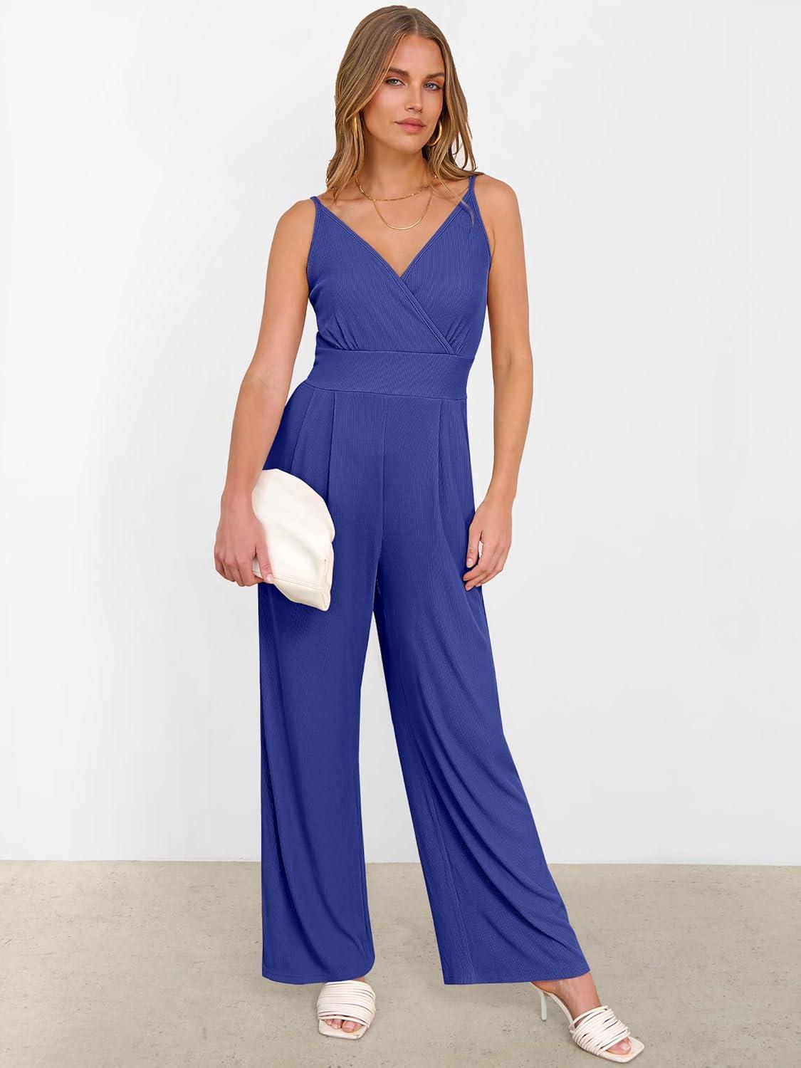 ANRABESS Jumpsuits for Women 2026 Summer Dressy Spaghetti Strap Ribbed V Neck Wide Leg Overalls Flowy Romper Jumpers Outfits(Royal Blue)