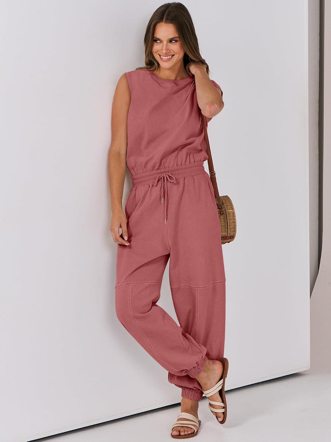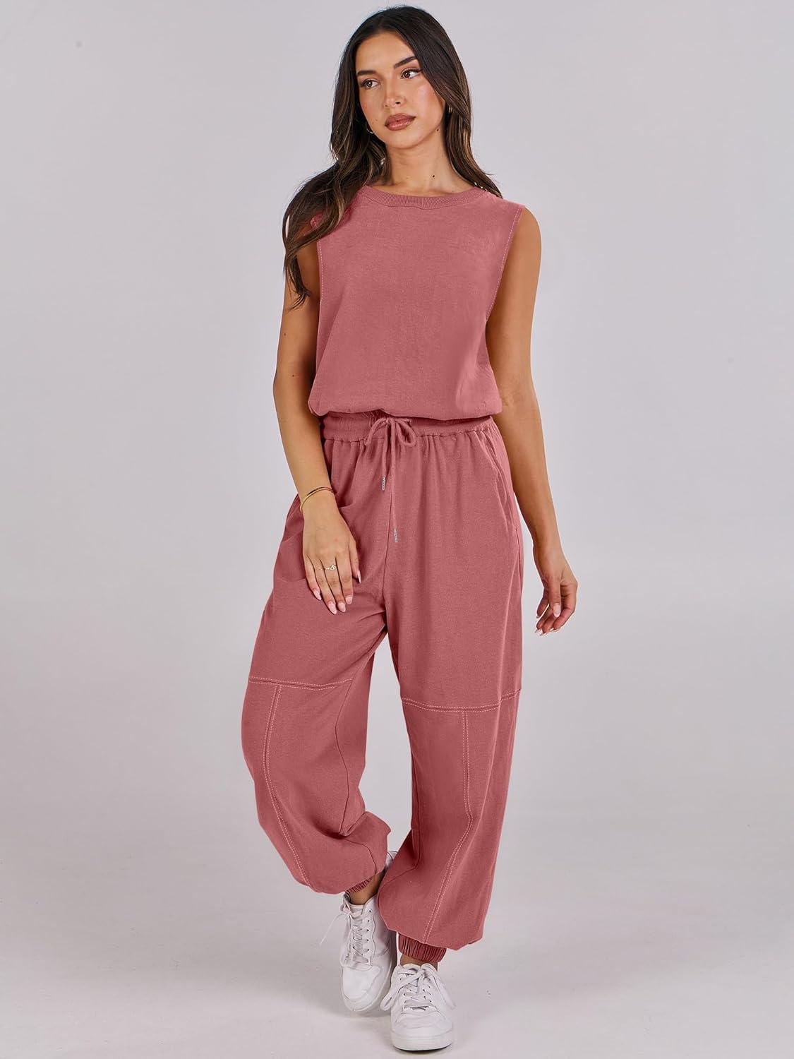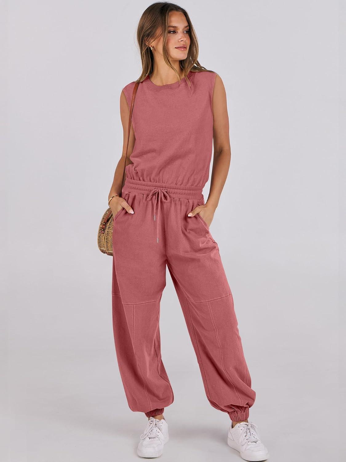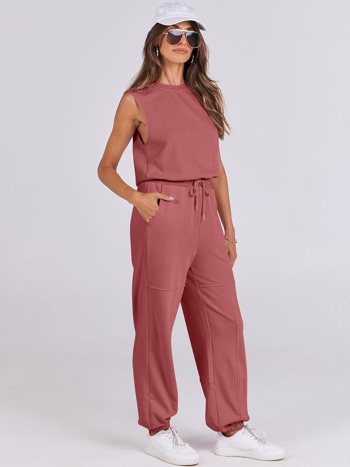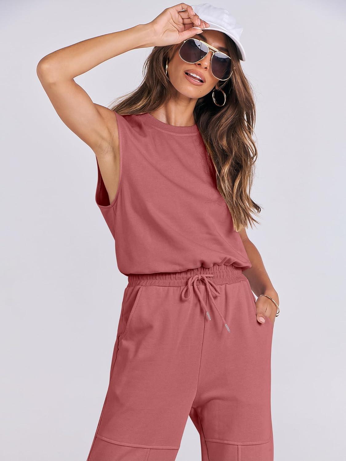 ANRABESS Jumpsuits for Women Casual Summer Sleeveless 2025 Romper One Piece Outfit Active Workout Lounge Jumpsuits Pockets(Rust)