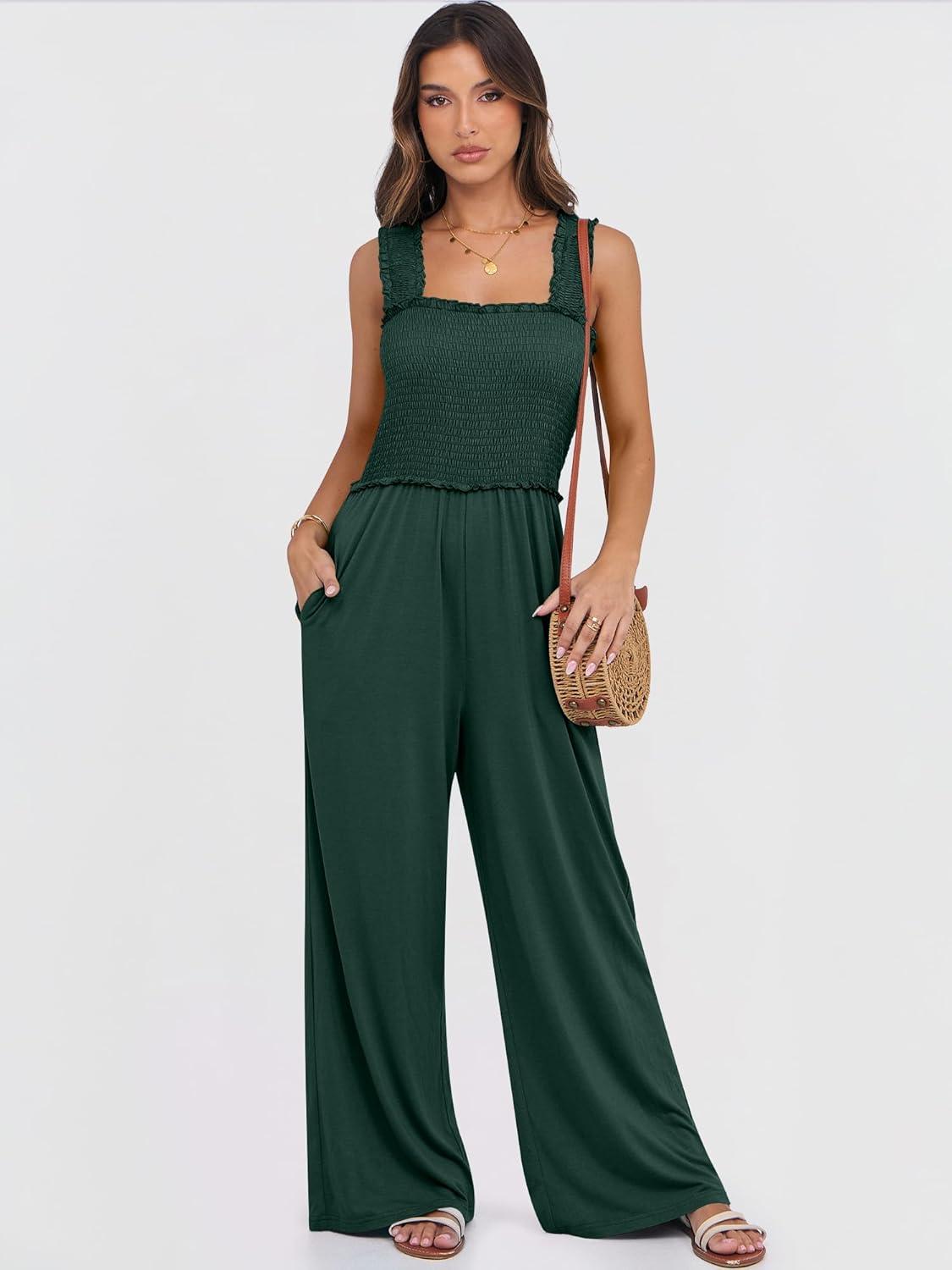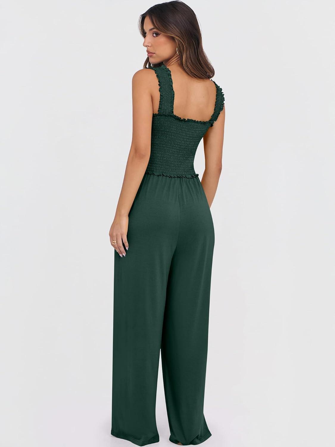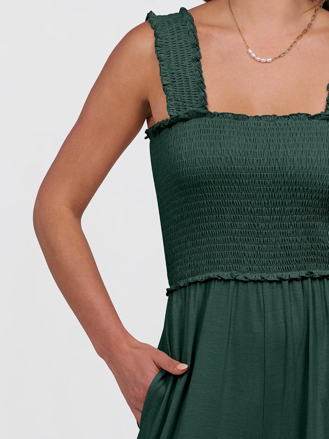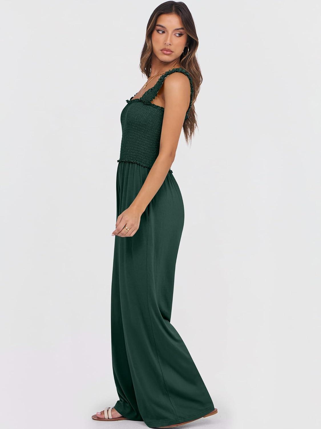 ANRABESS Jumpsuits for Women Dressy Casual Smocked Sleeveless Wide Leg Longe Rompers One Piece 2026 Summer Vacation Outfits(Deep Green)