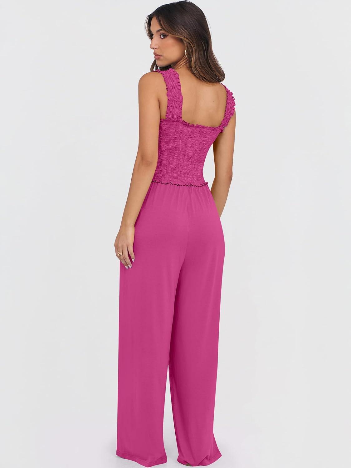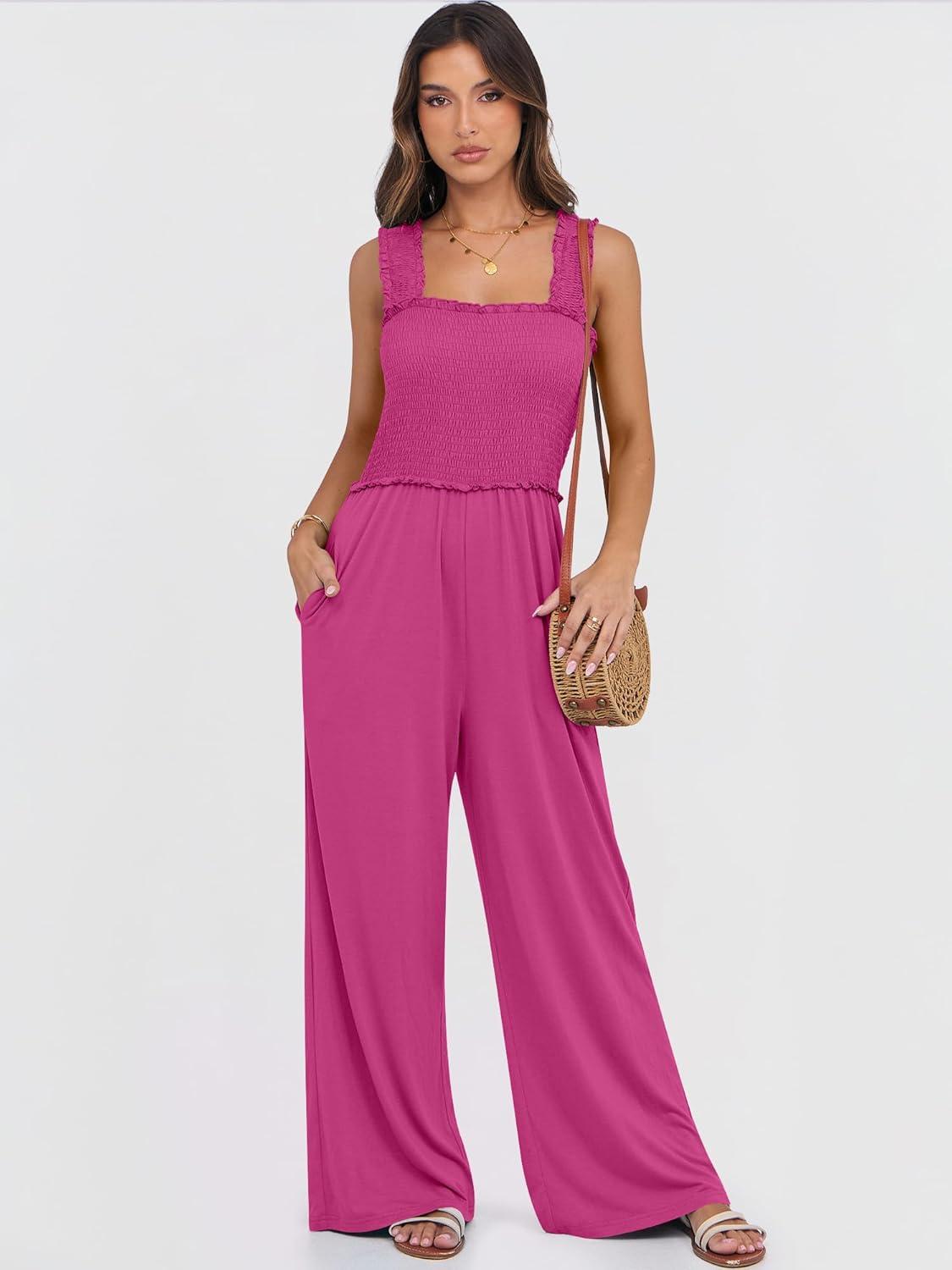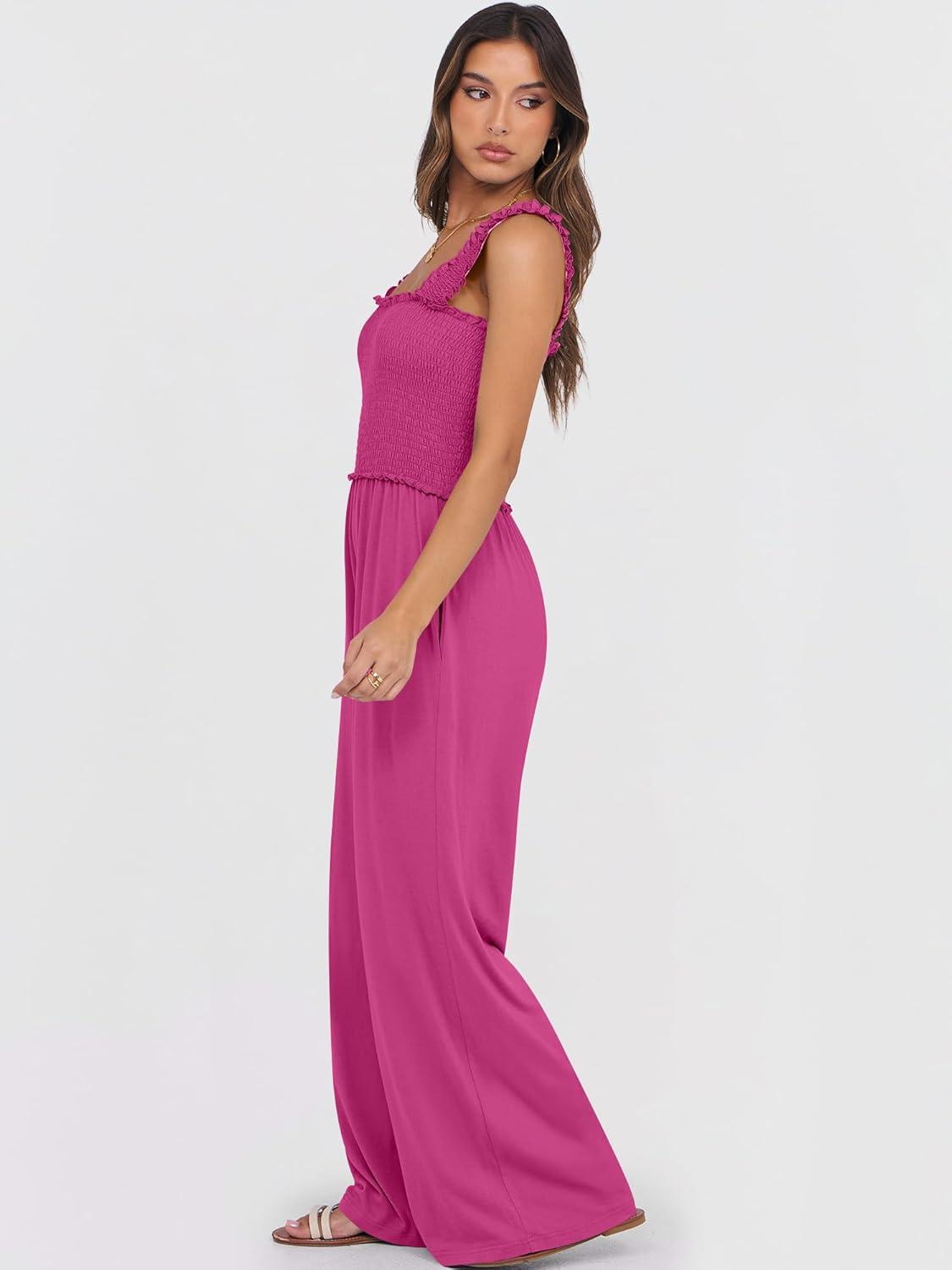 ANRABESS Jumpsuits for Women Dressy Casual Smocked Sleeveless Wide Leg Longe Rompers One Piece 2026 Summer Vacation Outfits(Hot Pink)