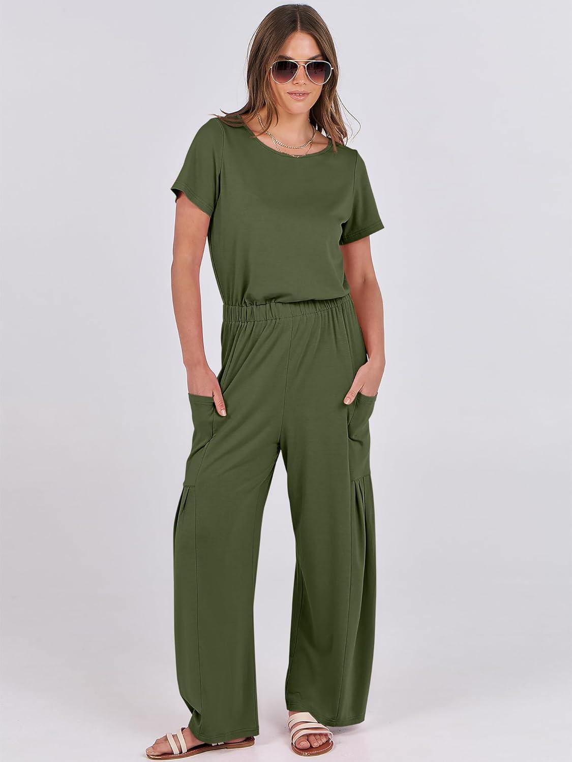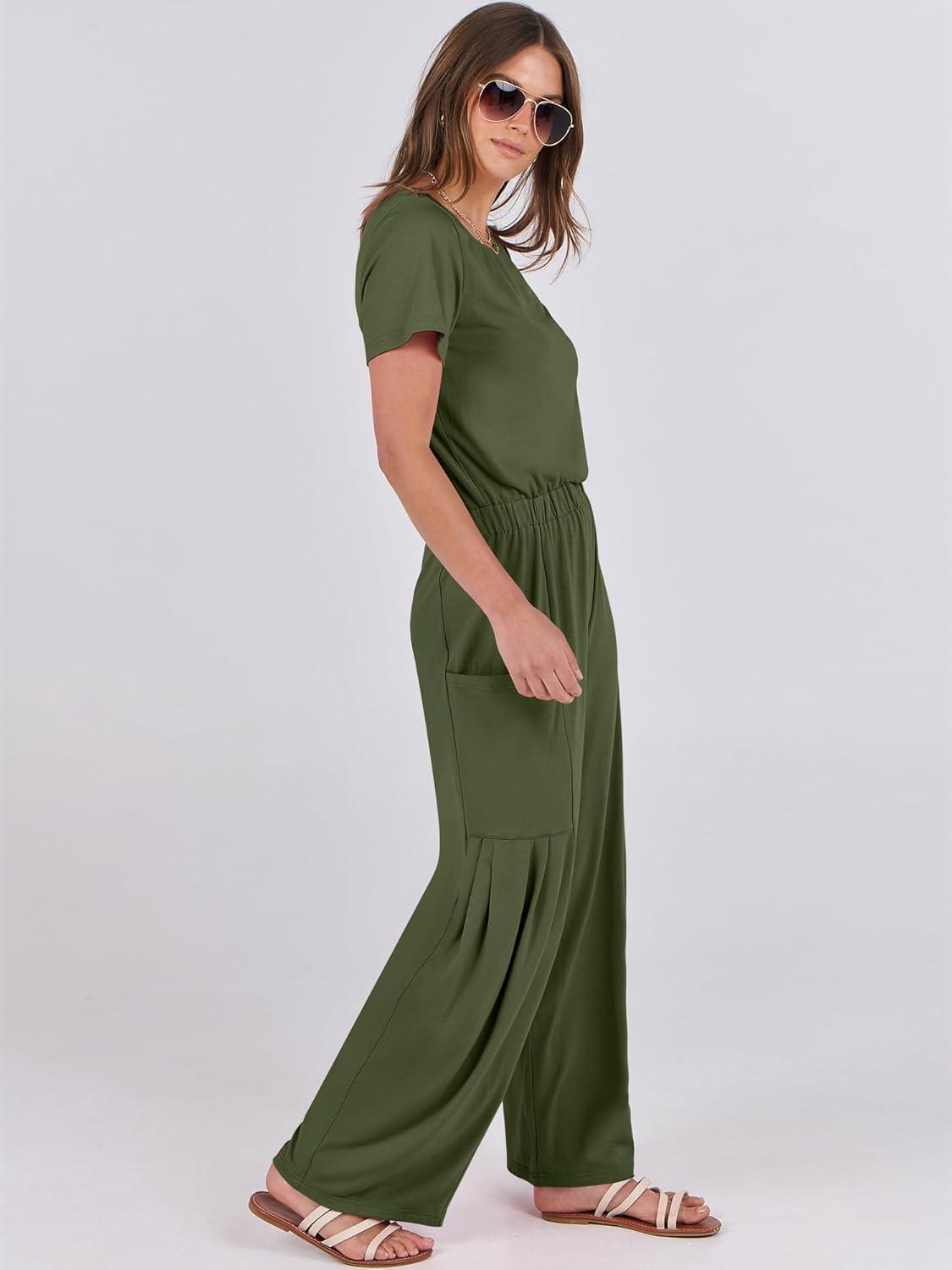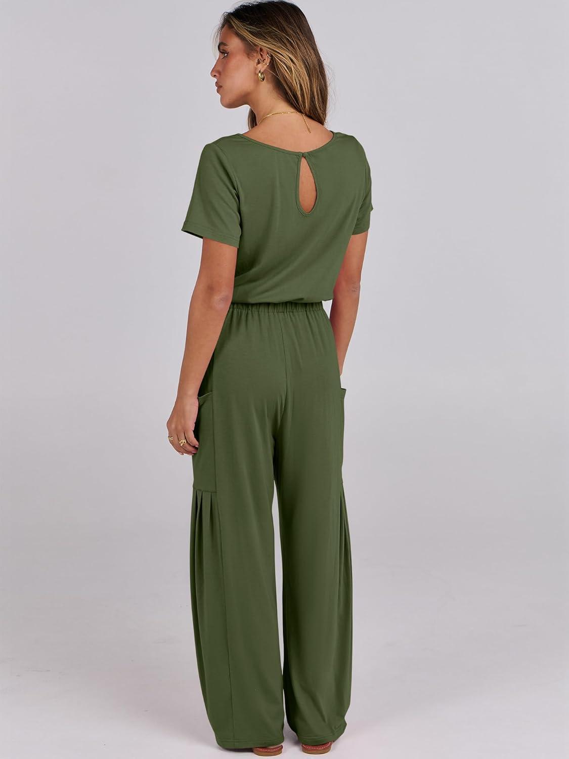 ANRABESS Jumpsuits for Women Short Sleeve Wide Leg Casual Summer One Piece Jumper Rompers 2025 Beach Vacation Travel Outfits(Army Green)