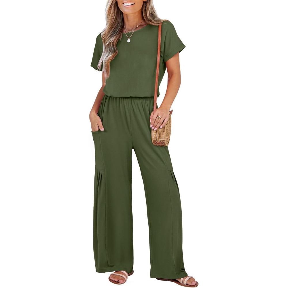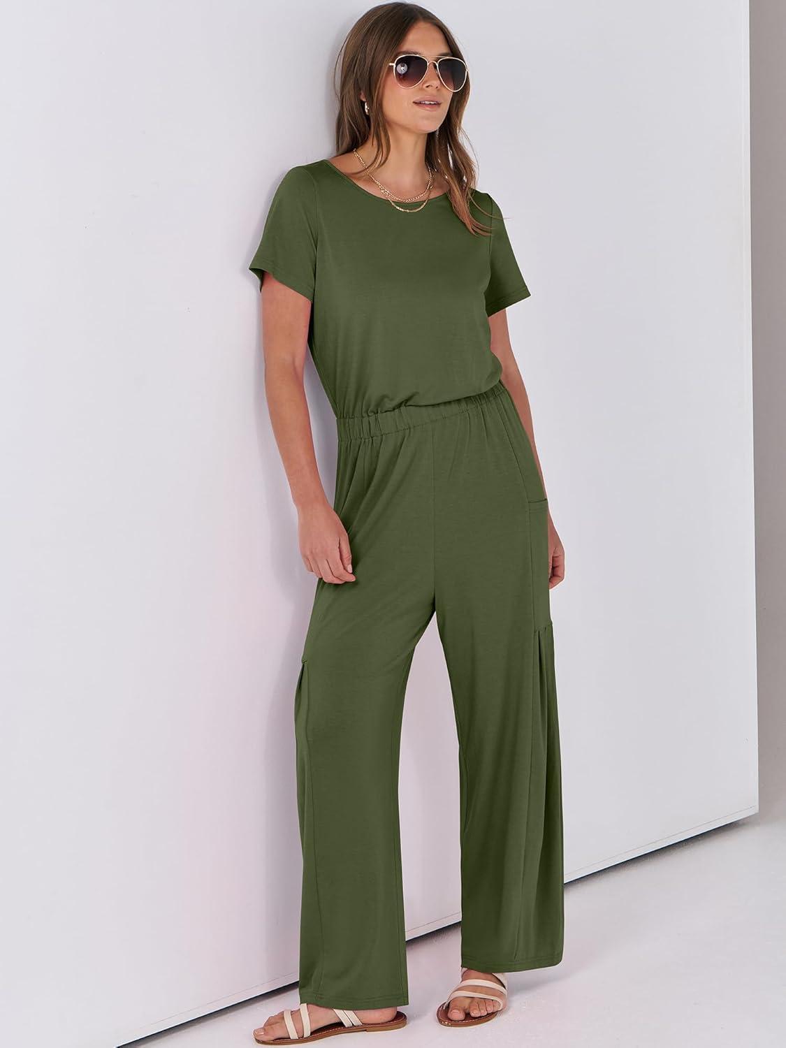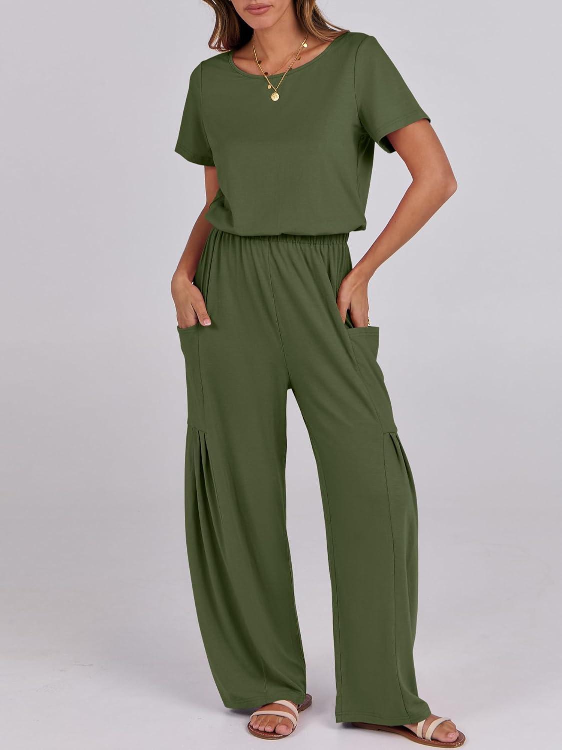 ANRABESS Jumpsuits for Women Short Sleeve Wide Leg Casual Summer One Piece Jumper Rompers 2025 Beach Vacation Travel Outfits(Army Green)