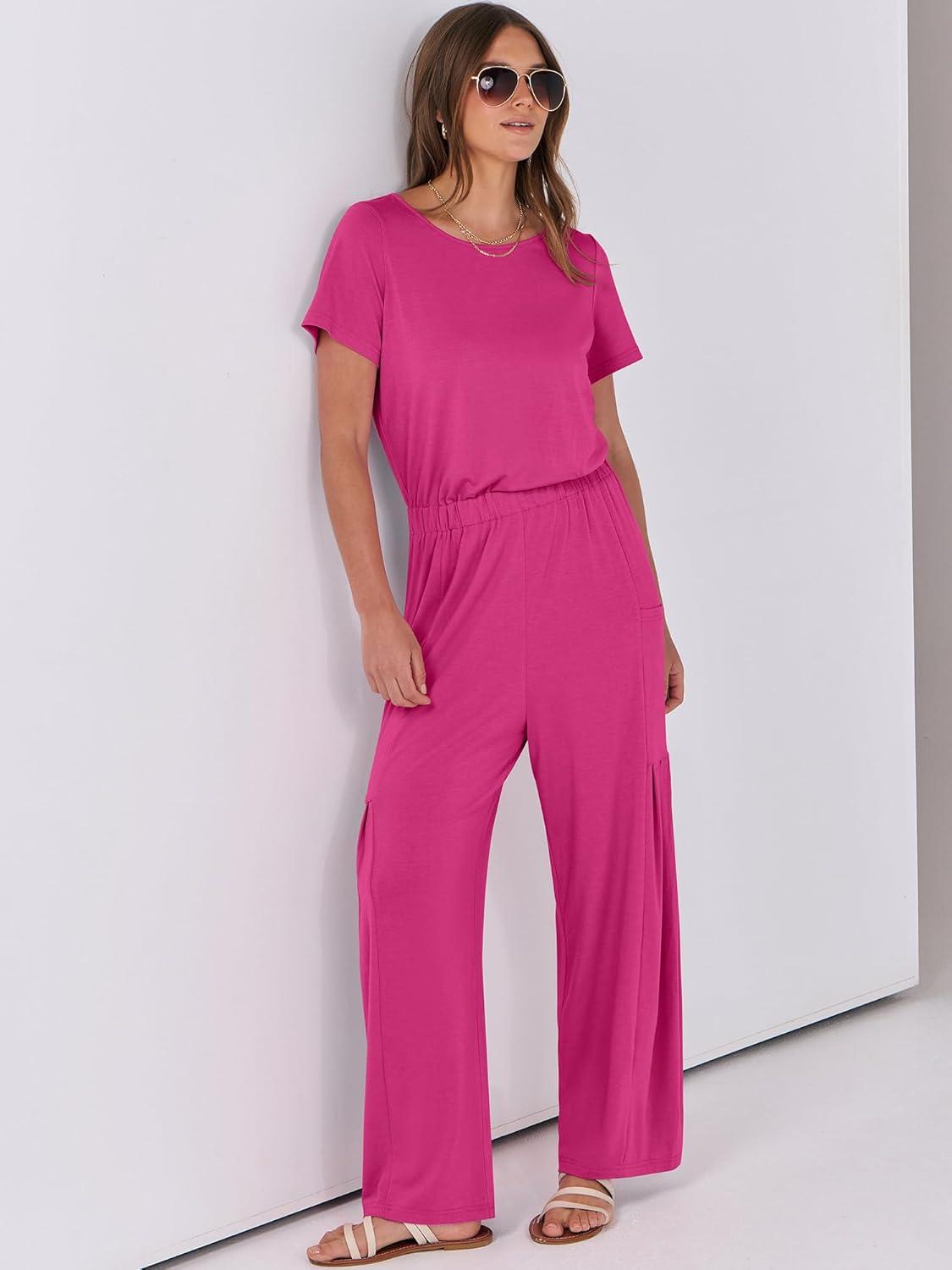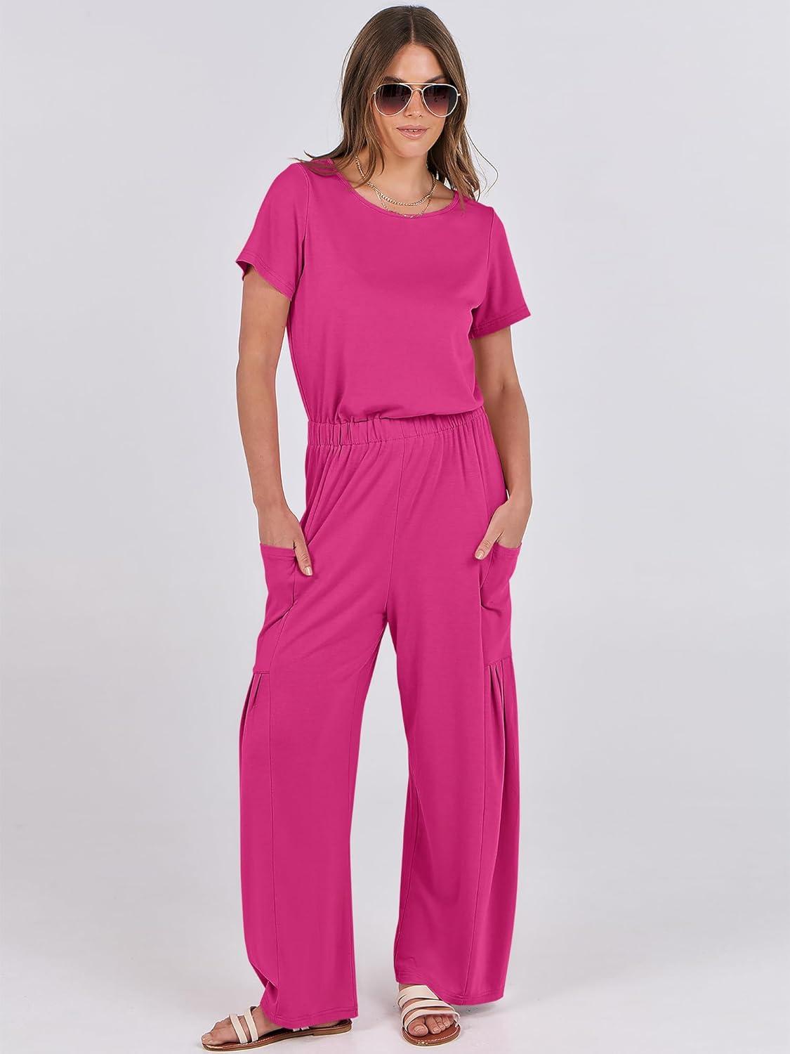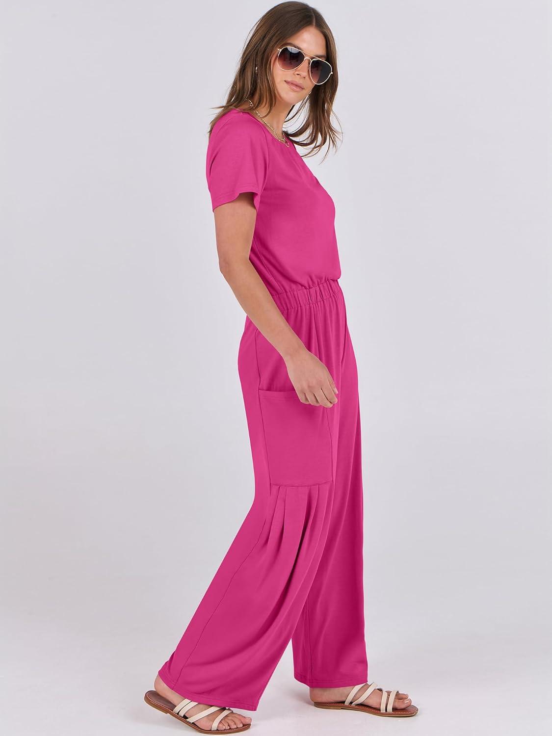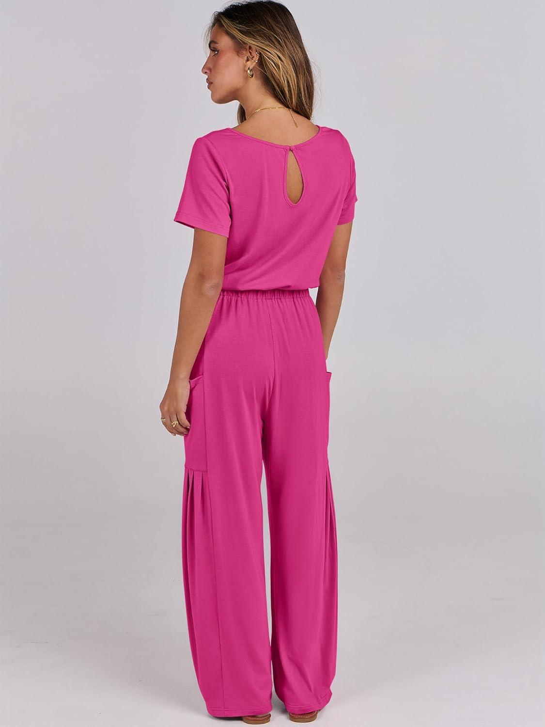 ANRABESS Jumpsuits for Women Short Sleeve Wide Leg Casual Summer One Piece Jumper Rompers 2025 Beach Vacation Travel Outfits(Hot Pink)