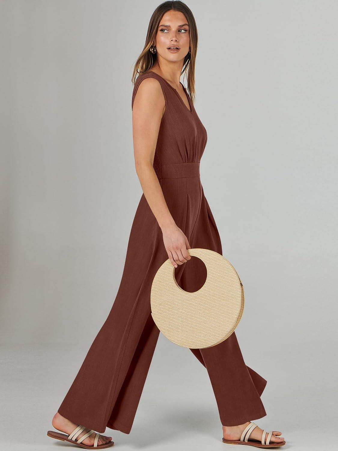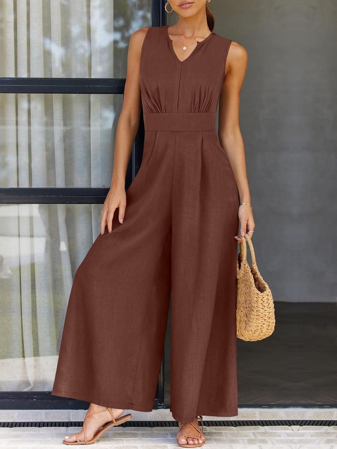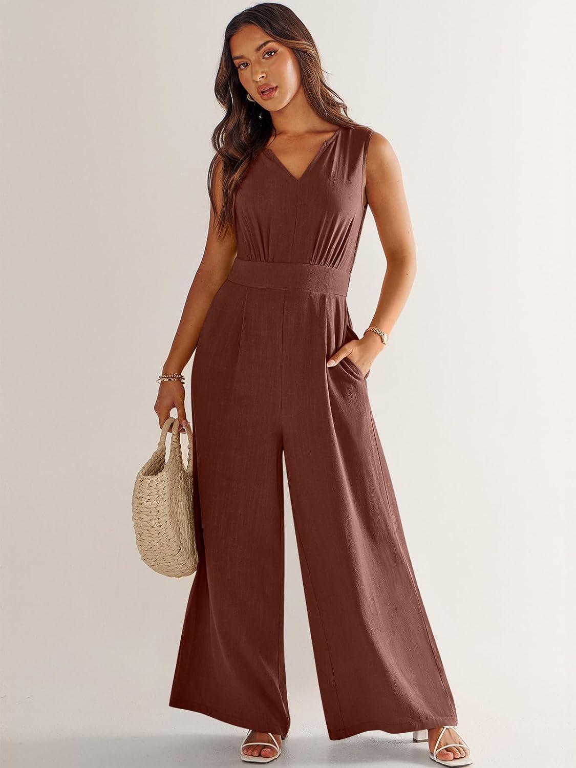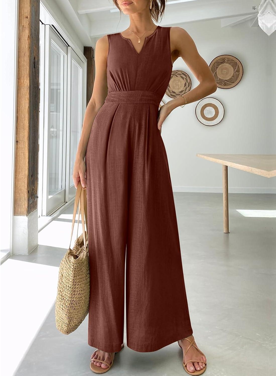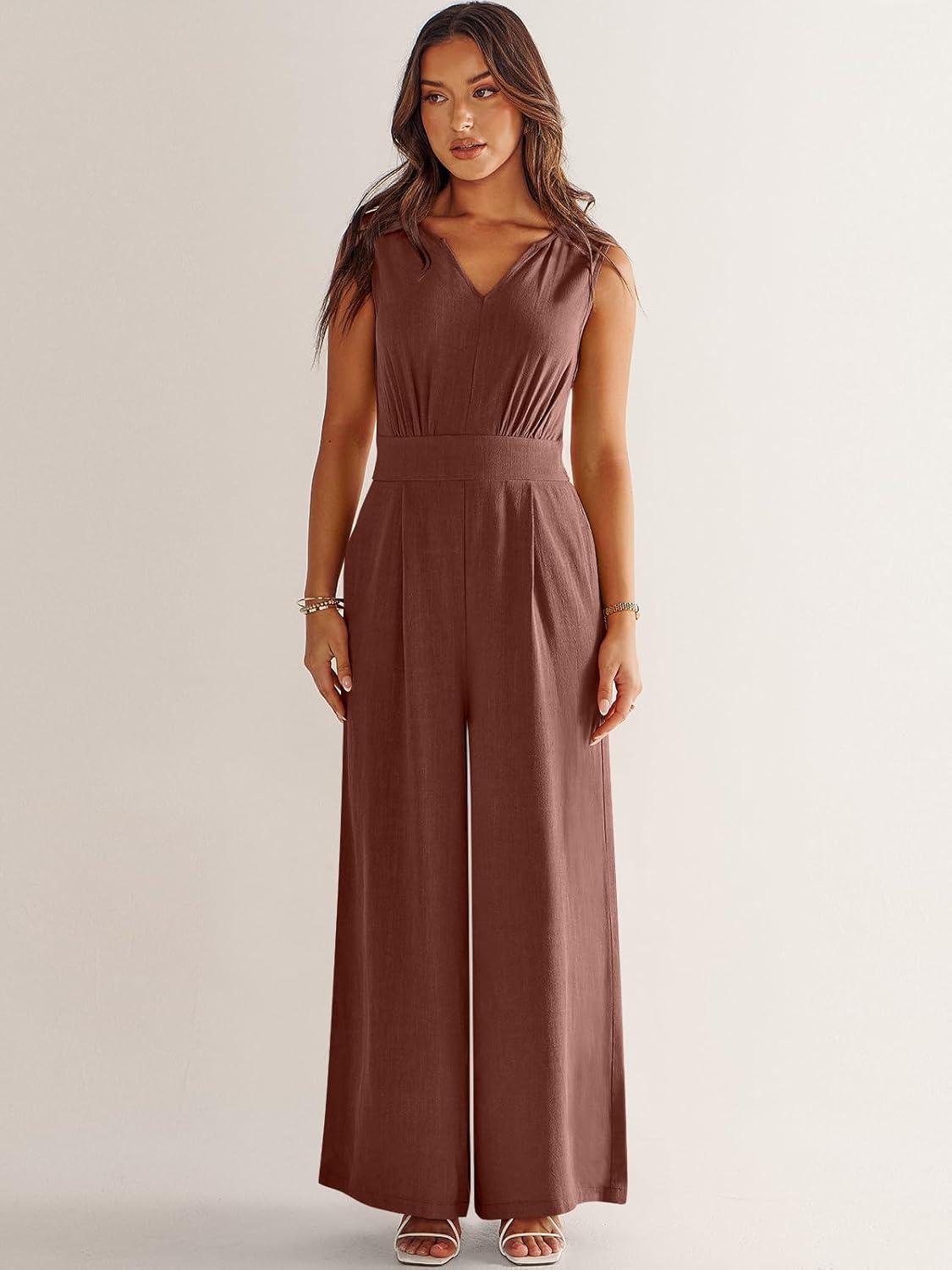 ANRABESS Jumpsuits for Women Summer Dressy Casual Linen Romper Sleeveless V Neck High Waist Wide Leg Beach Vacation Outfits(Brown Red)