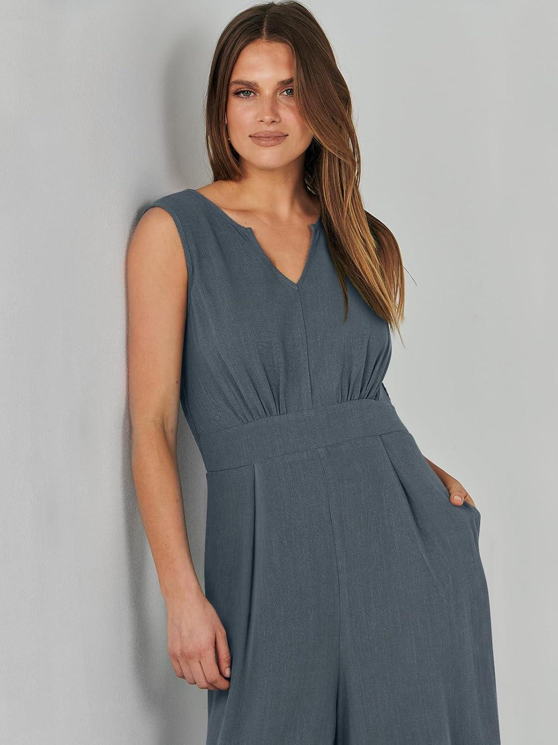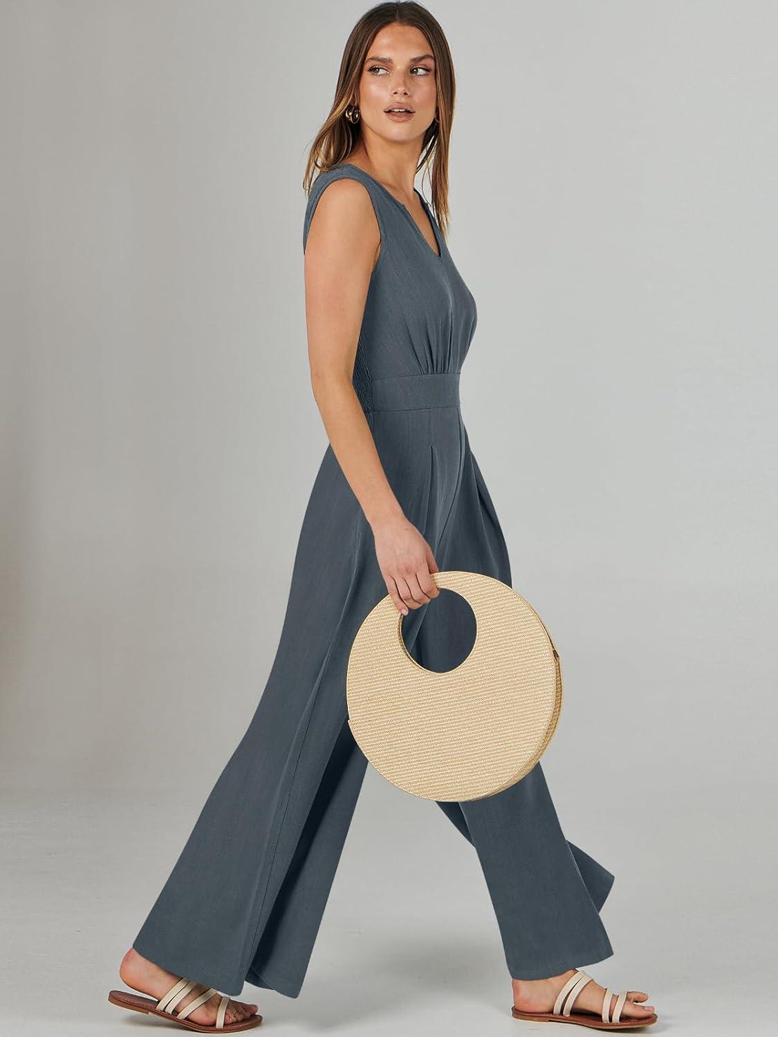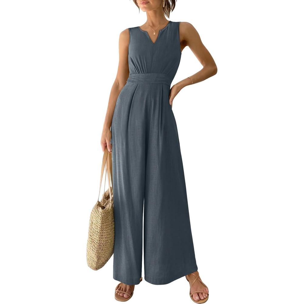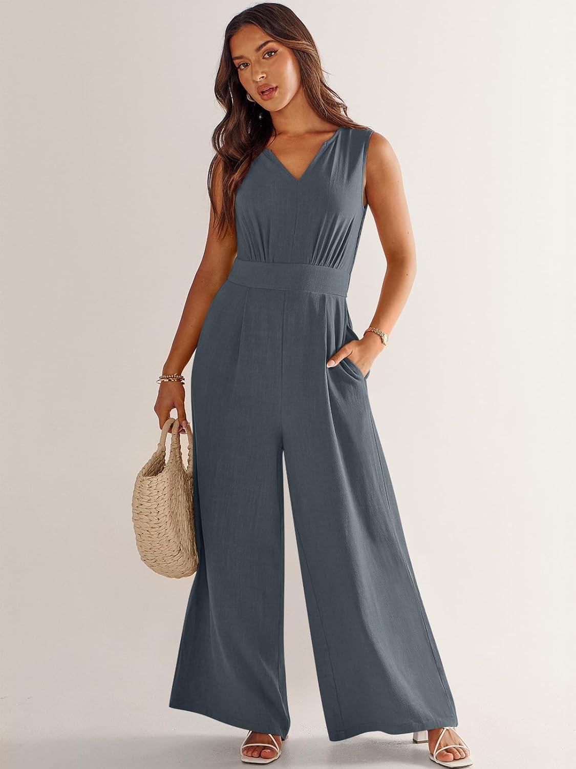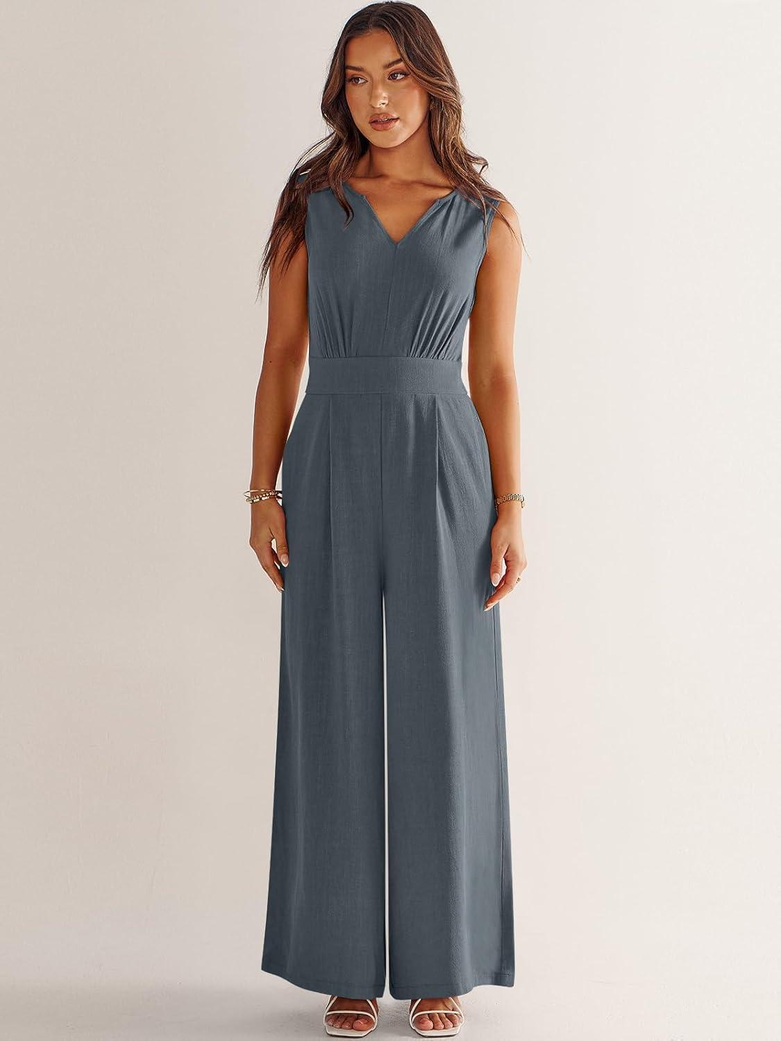 ANRABESS Jumpsuits for Women Summer Dressy Casual Linen Romper Sleeveless V Neck High Waist Wide Leg Beach Vacation Outfits(Deep Grey)