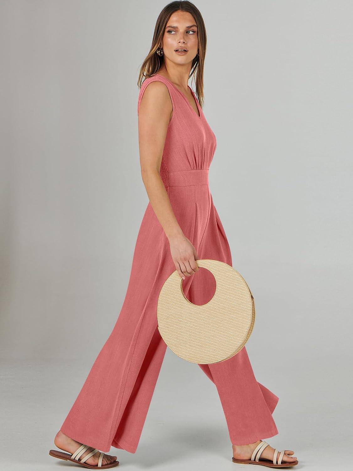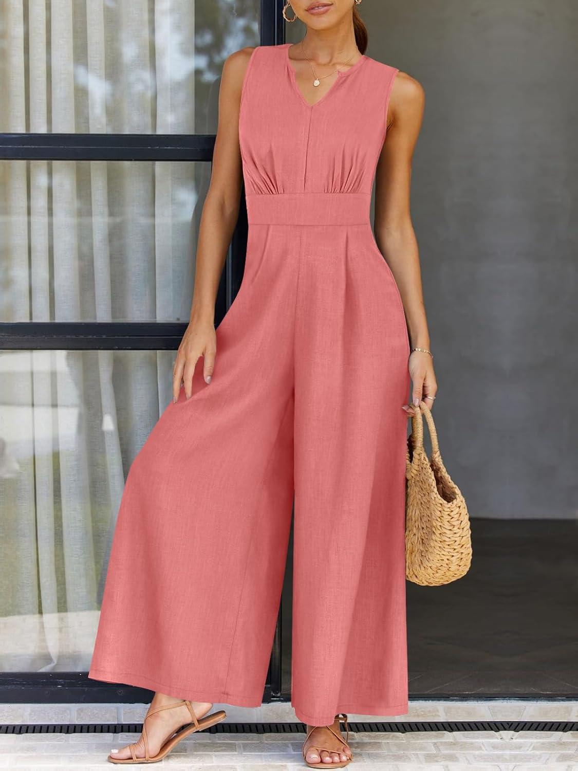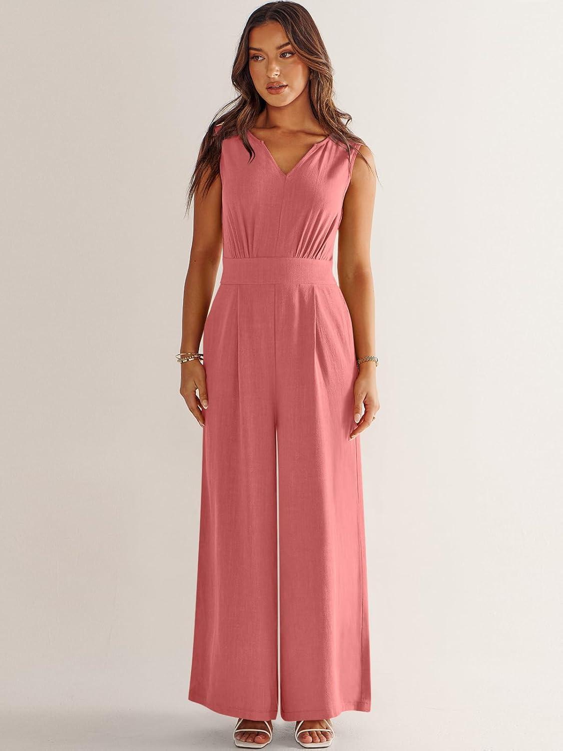 ANRABESS Jumpsuits for Women Summer Dressy Casual Linen Romper Sleeveless V Neck High Waist Wide Leg Beach Vacation Outfits(Pink)