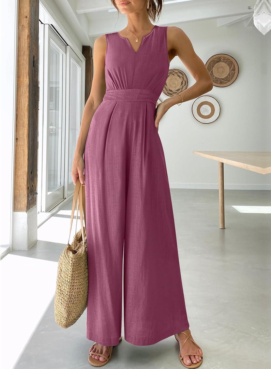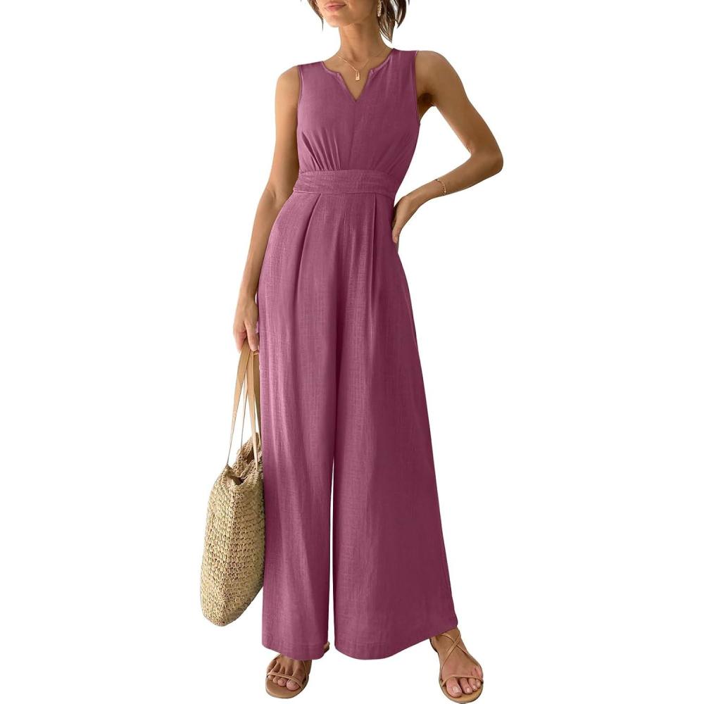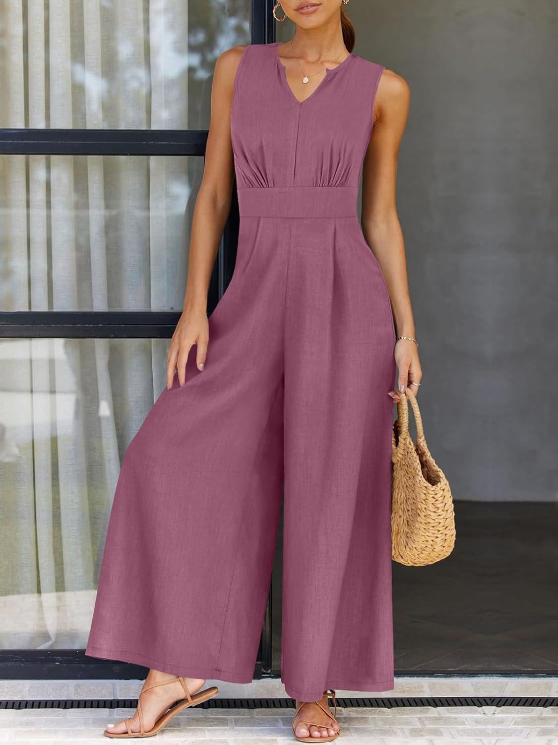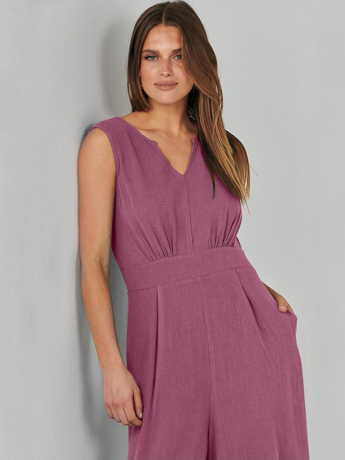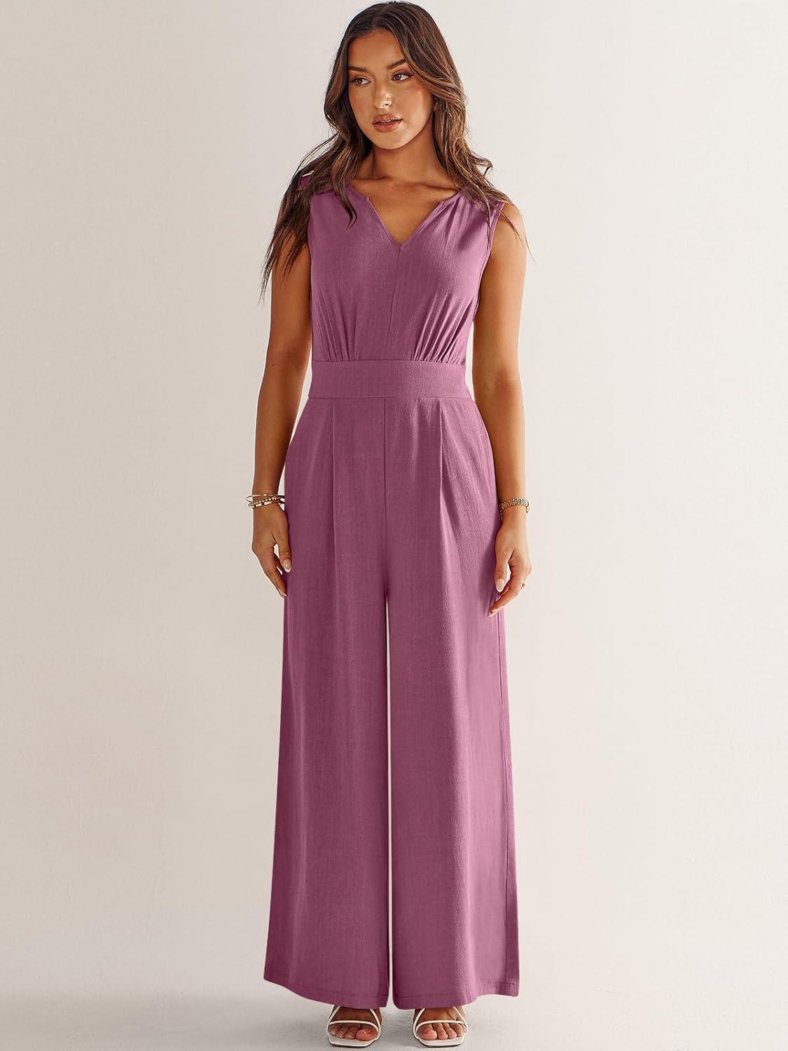 ANRABESS Jumpsuits for Women Summer Dressy Casual Linen Romper Sleeveless V Neck High Waist Wide Leg Beach Vacation Outfits(Rose)