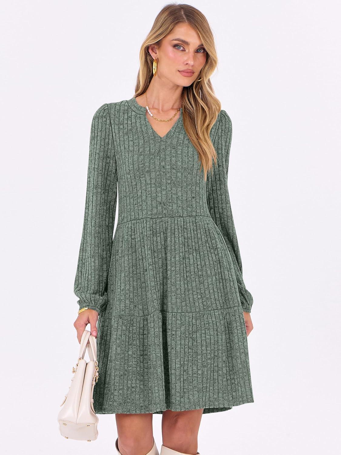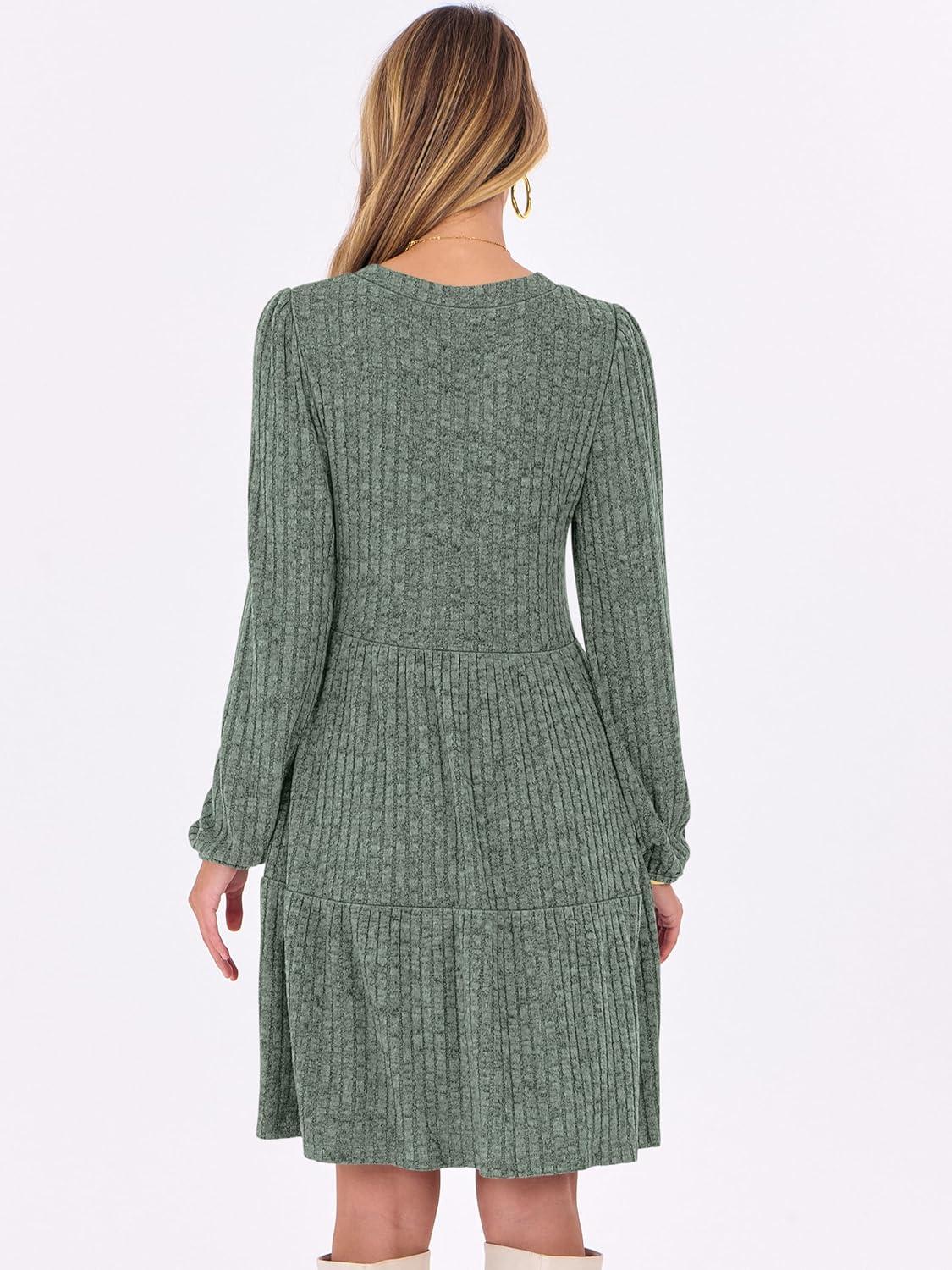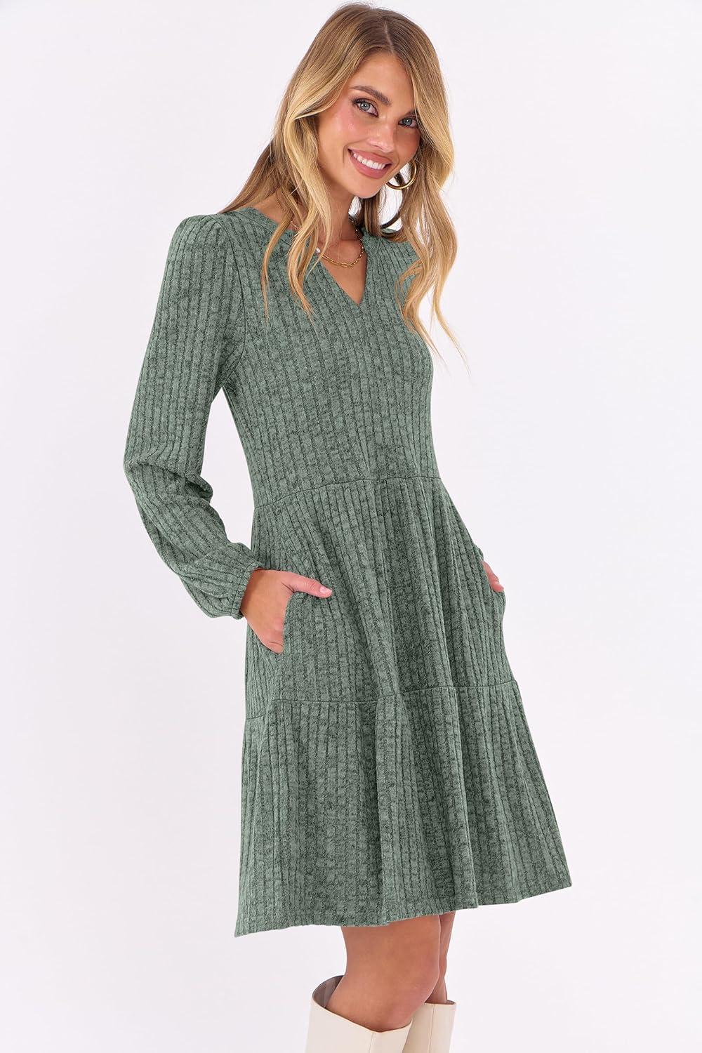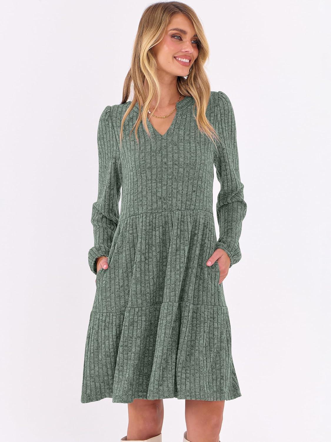 ANRABESS Long Sleeve Dress for Women Fall Fashion Outfits 2025 Casual V Neck Rib Knit Babydoll Sweater Dresses with Pockets(Grey Green)