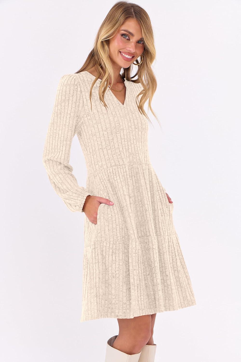 ANRABESS Long Sleeve Dress for Women Fall Fashion Outfits 2025 Casual V Neck Ribbed Knit Short Sweater Dresses with Pockets(Light Khaki)