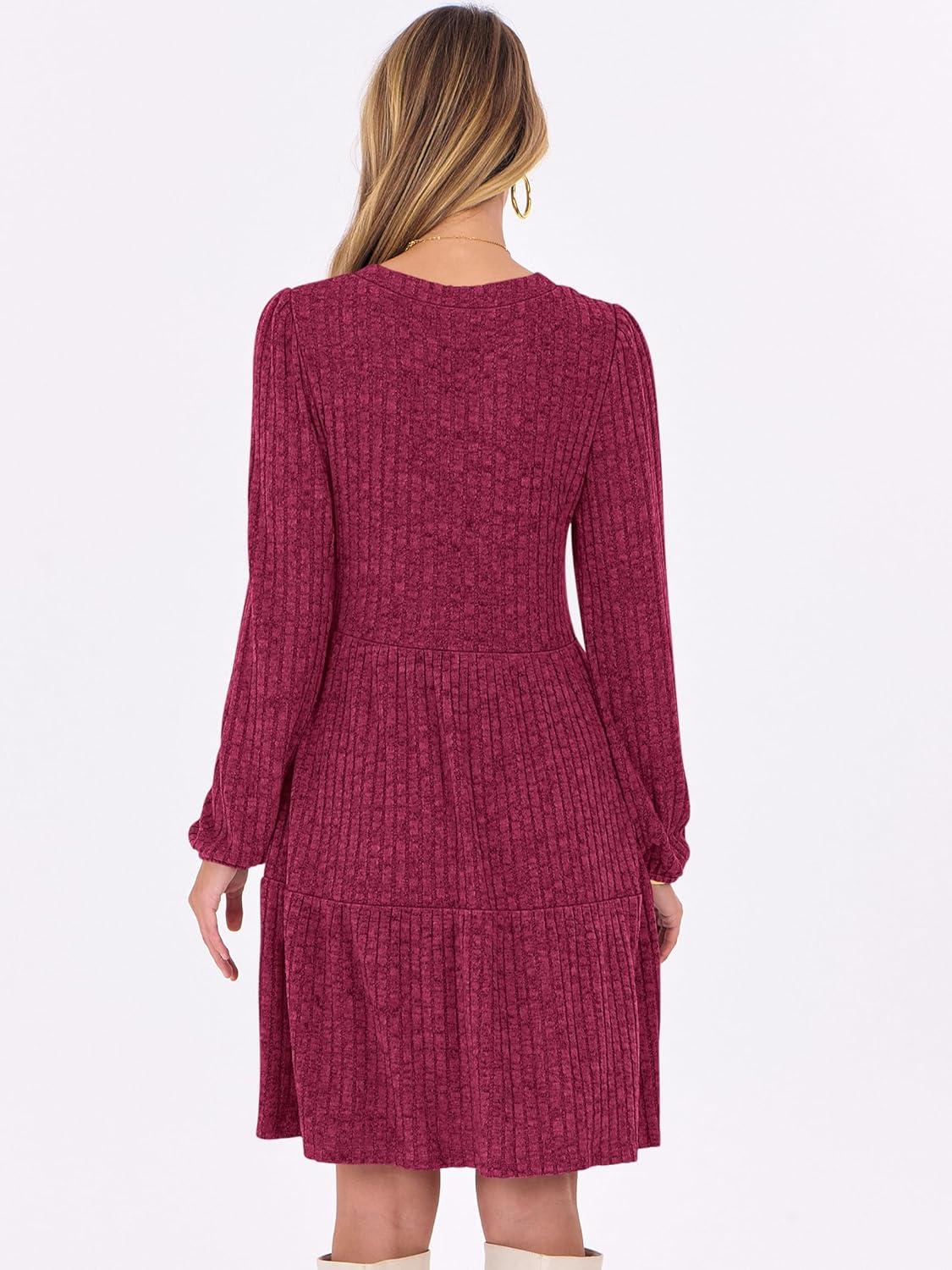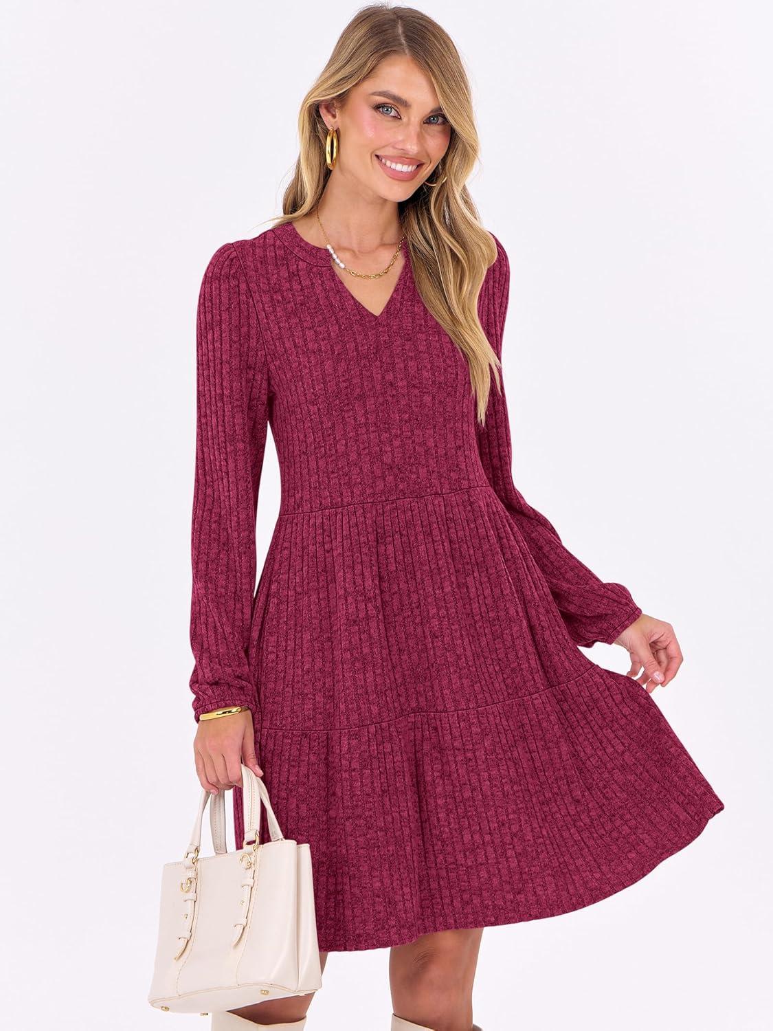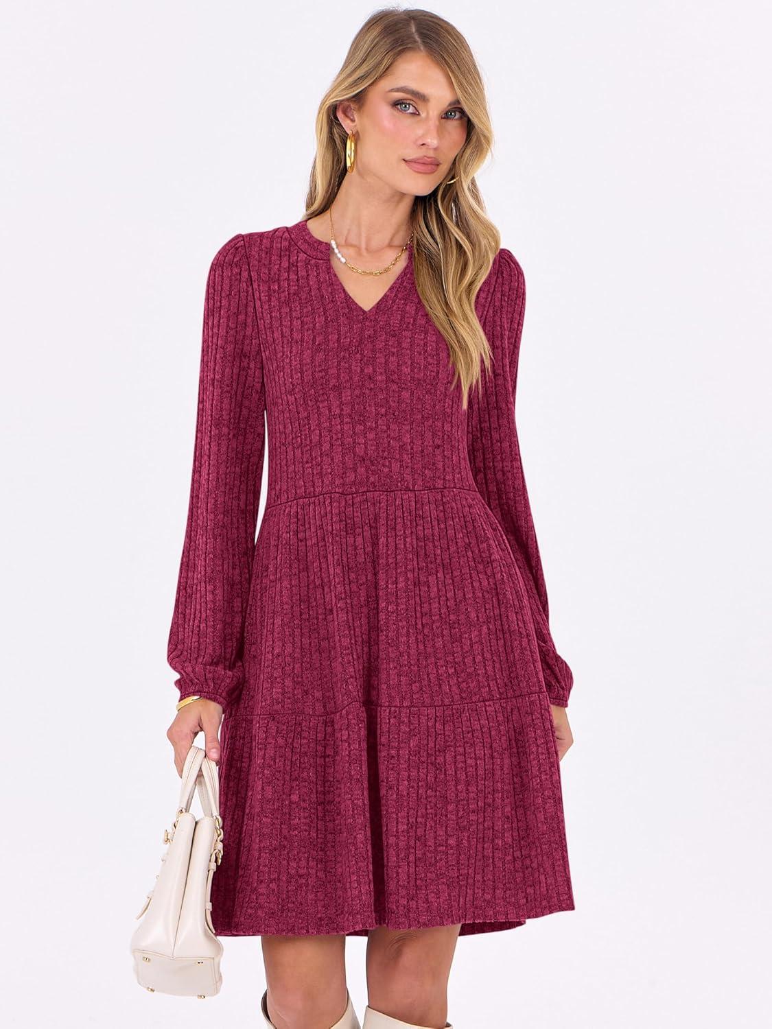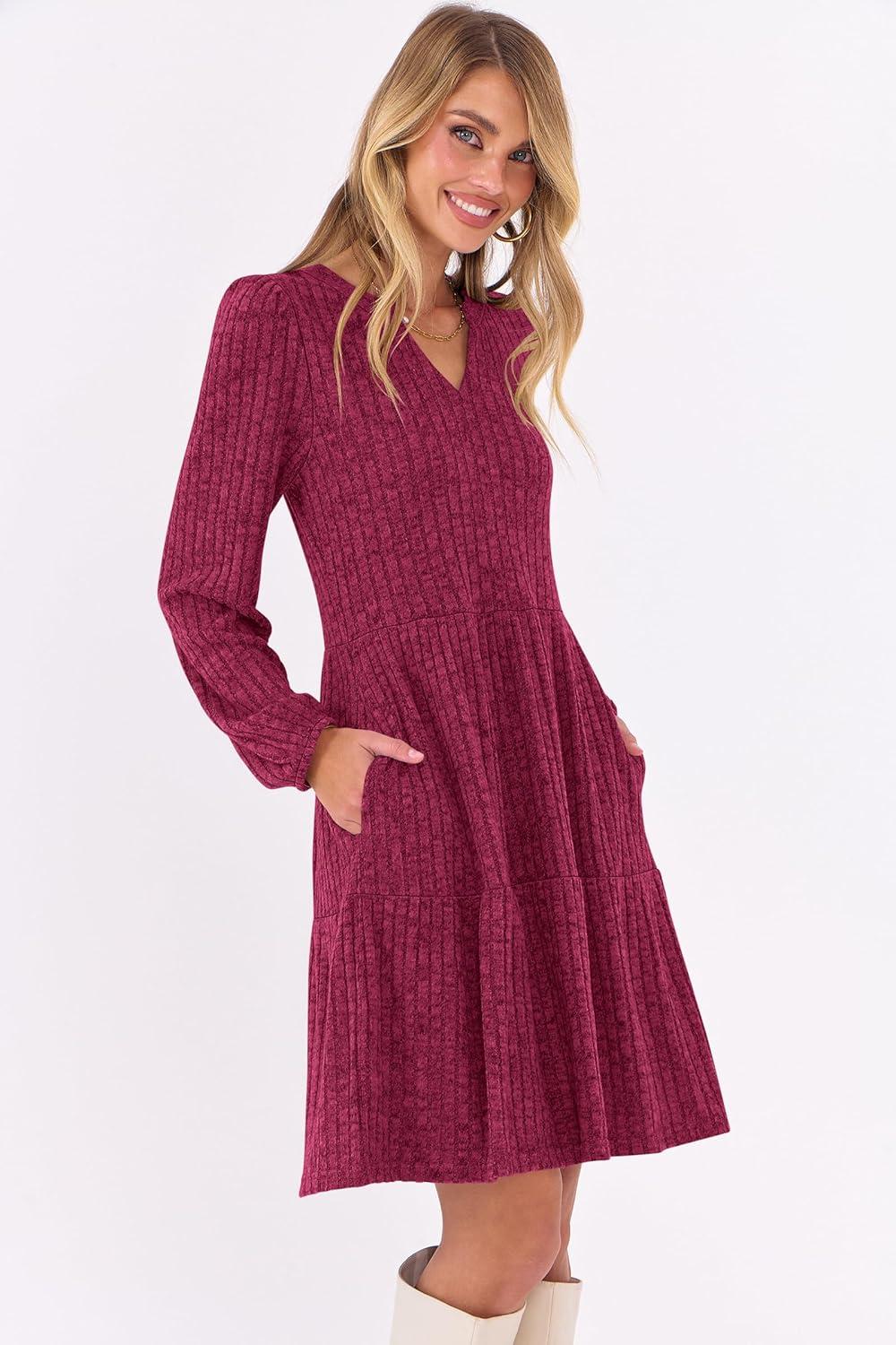 ANRABESS Long Sleeve Dress for Women Fall Fashion Outfits 2025 Casual V Neck Ribbed Knit Short Sweater Dresses with Pockets(Wine Red)