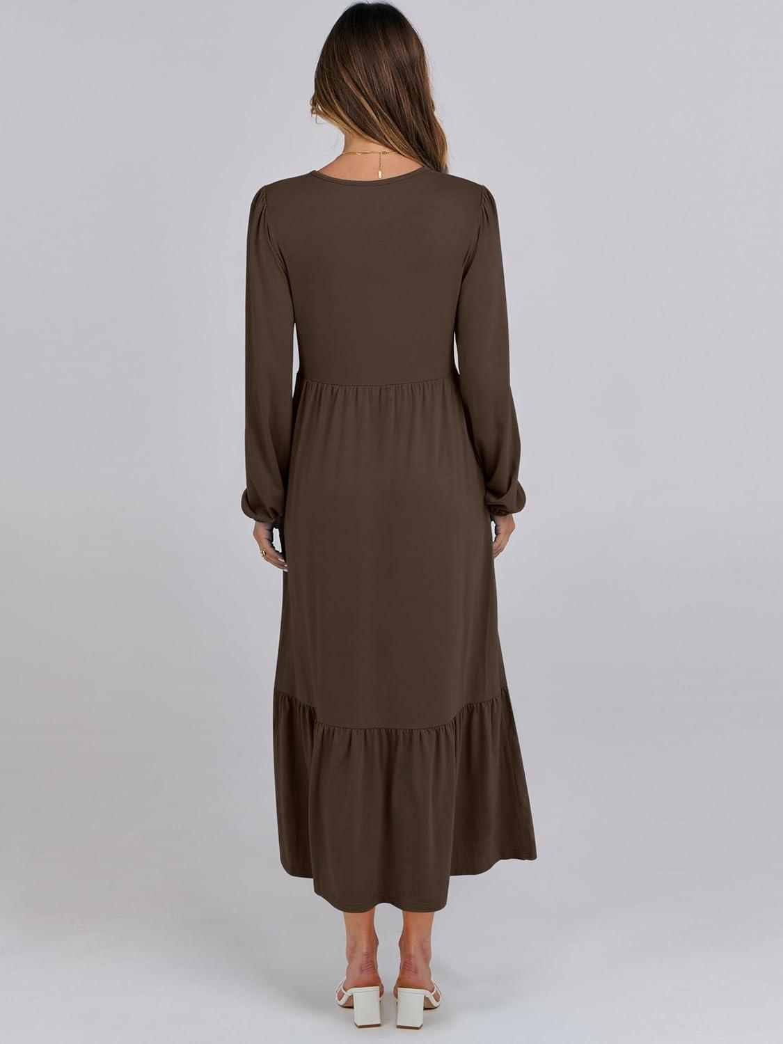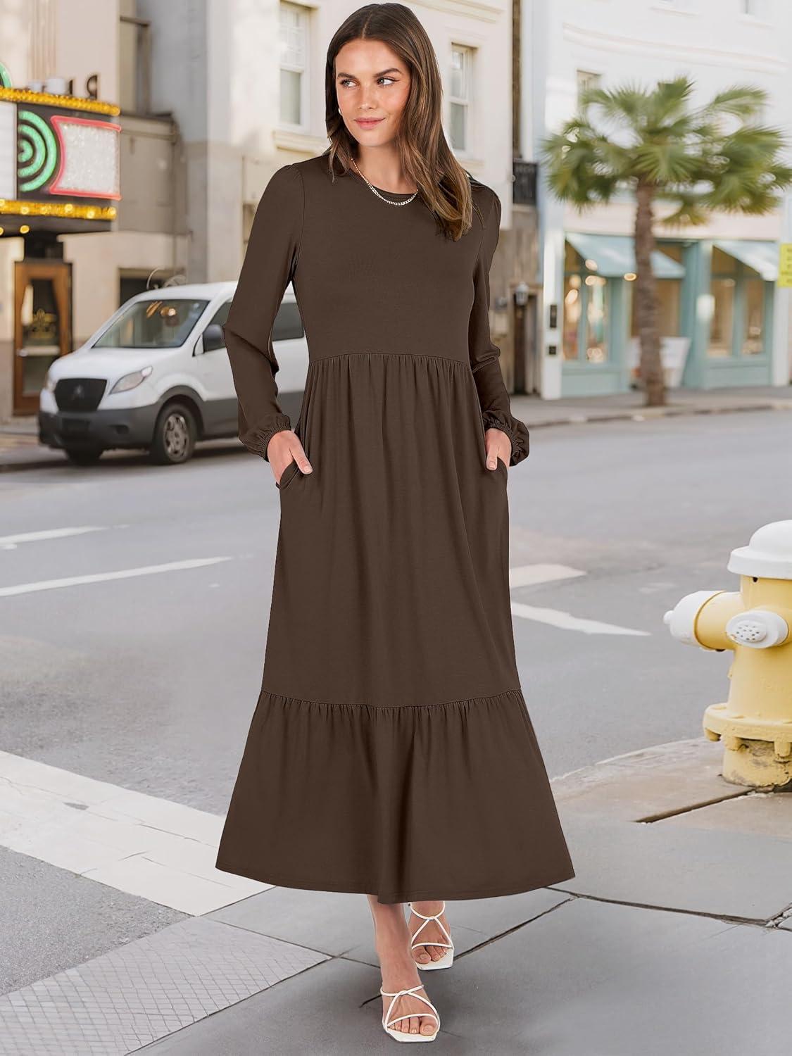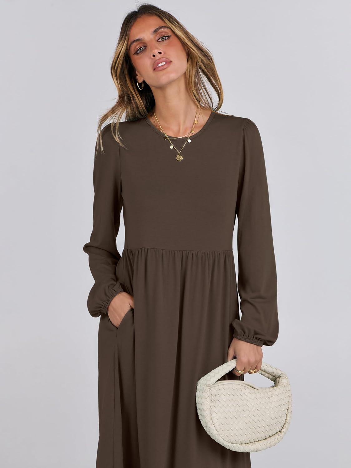 ANRABESS Long Sleeve Midi Dresses for Women Casual 2025 Fall Crewneck A Line Tiered Flowy Loose Trendy Dresses with Pockets(Coffee)