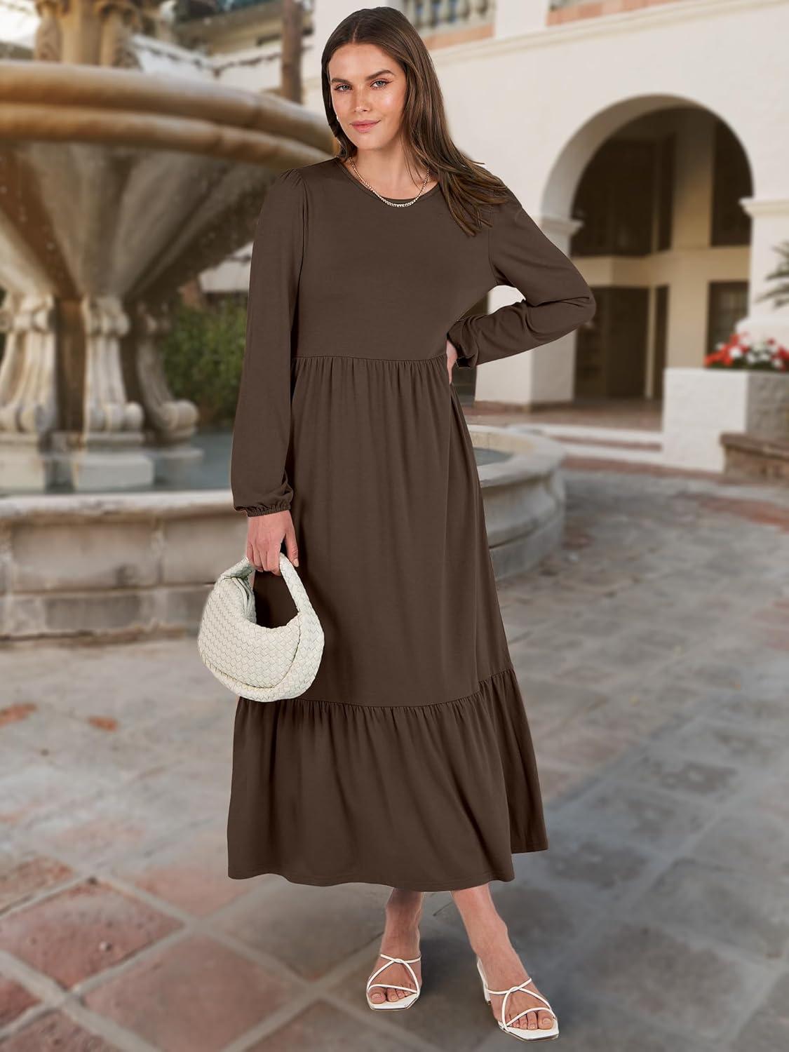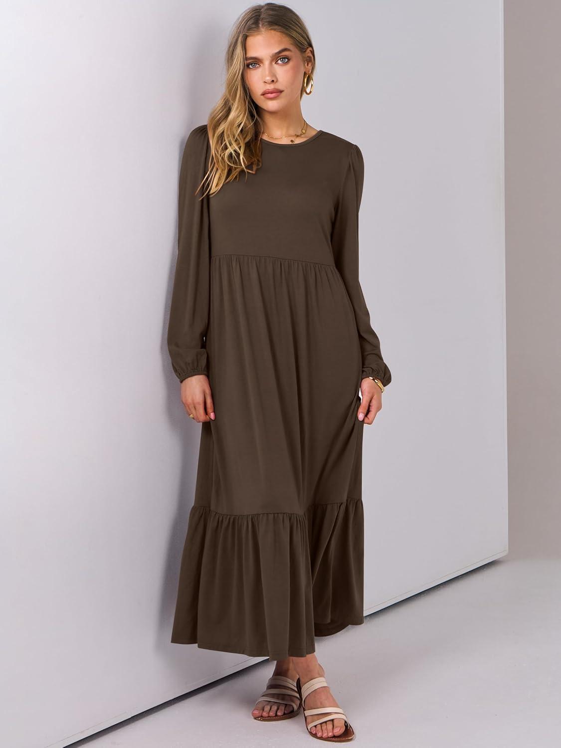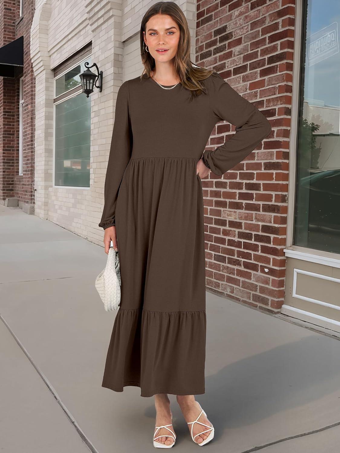 ANRABESS Long Sleeve Midi Dresses for Women Casual 2025 Fall Crewneck A Line Tiered Flowy Loose Trendy Dresses with Pockets(Coffee)