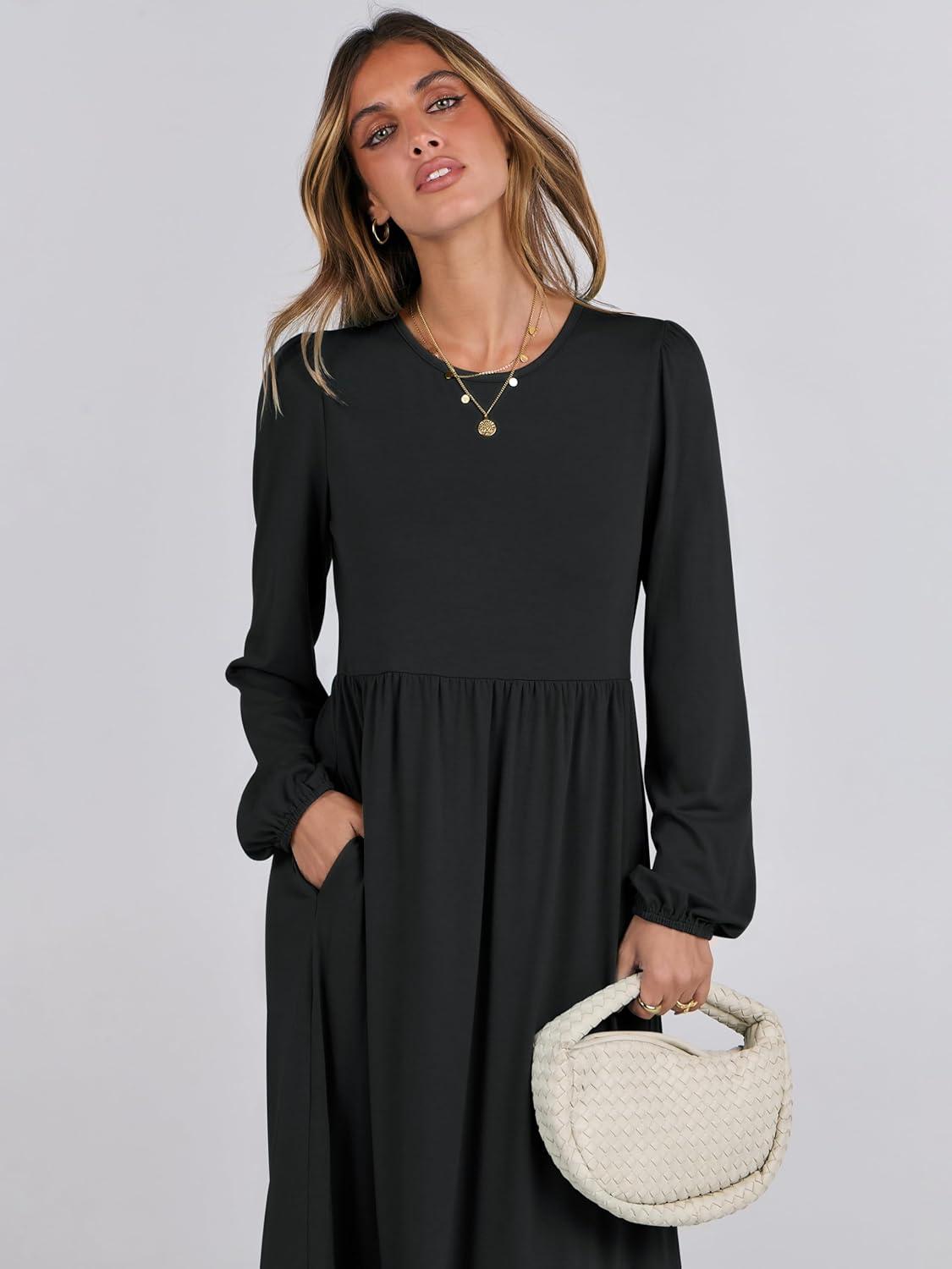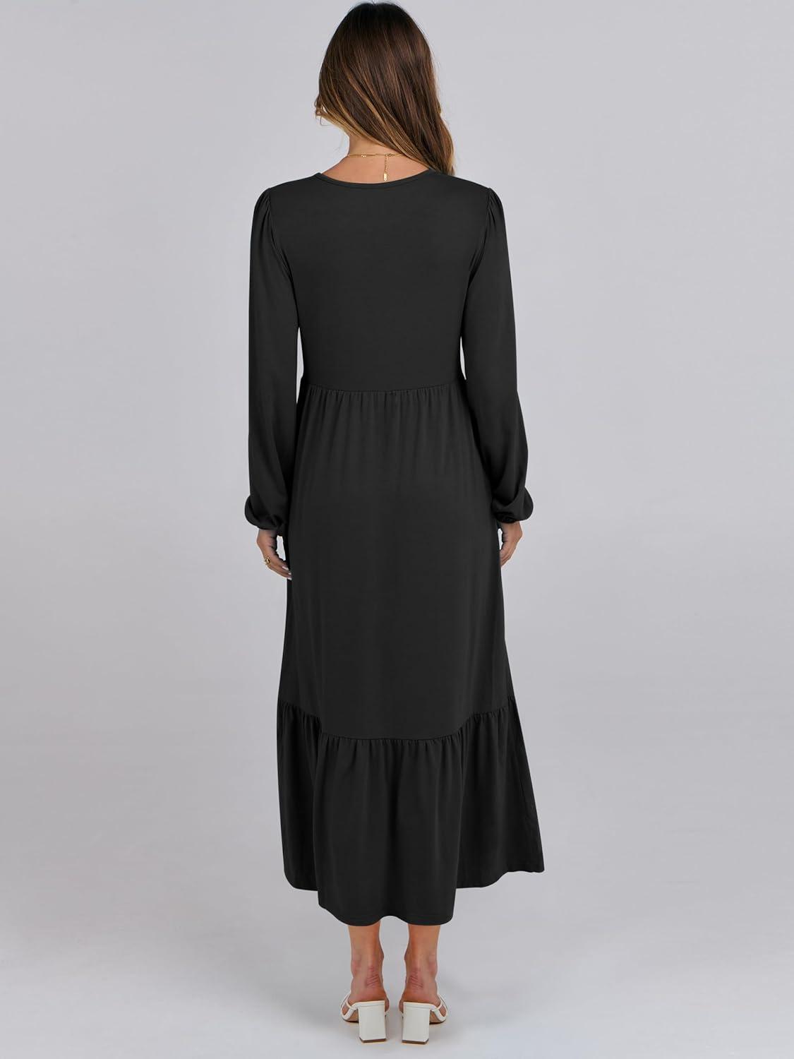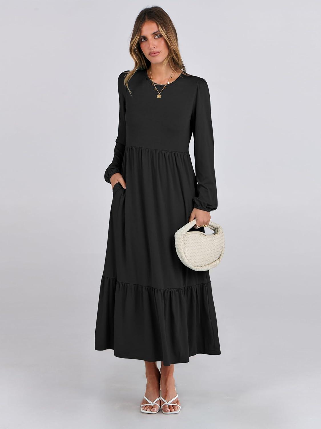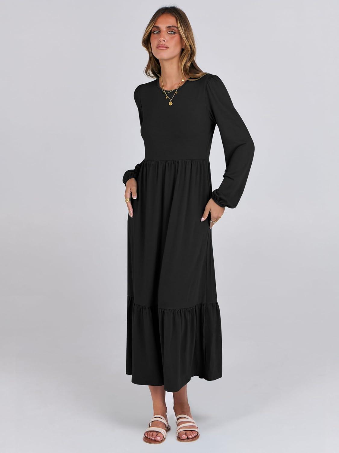 ANRABESS Long Sleeve Midi Dresses for Women Casual 2026 Spring Crewneck A Line Tiered Flowy Loose Trendy Dresses with Pockets(Black)