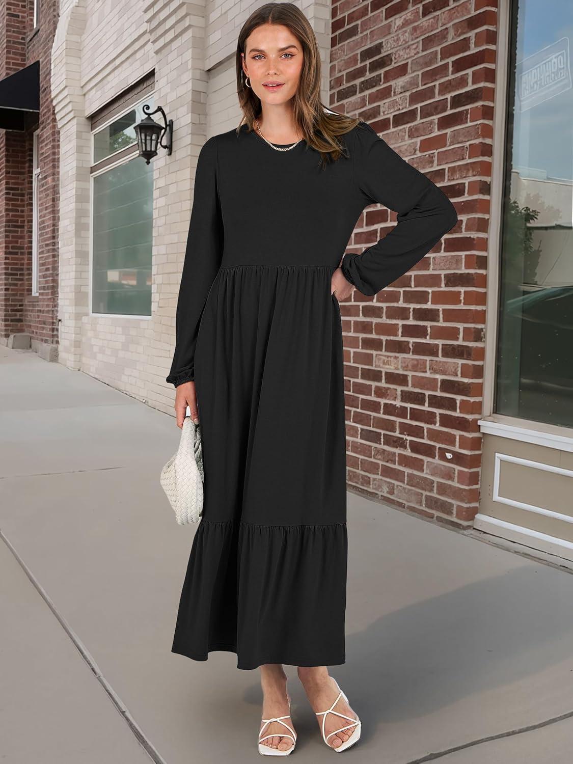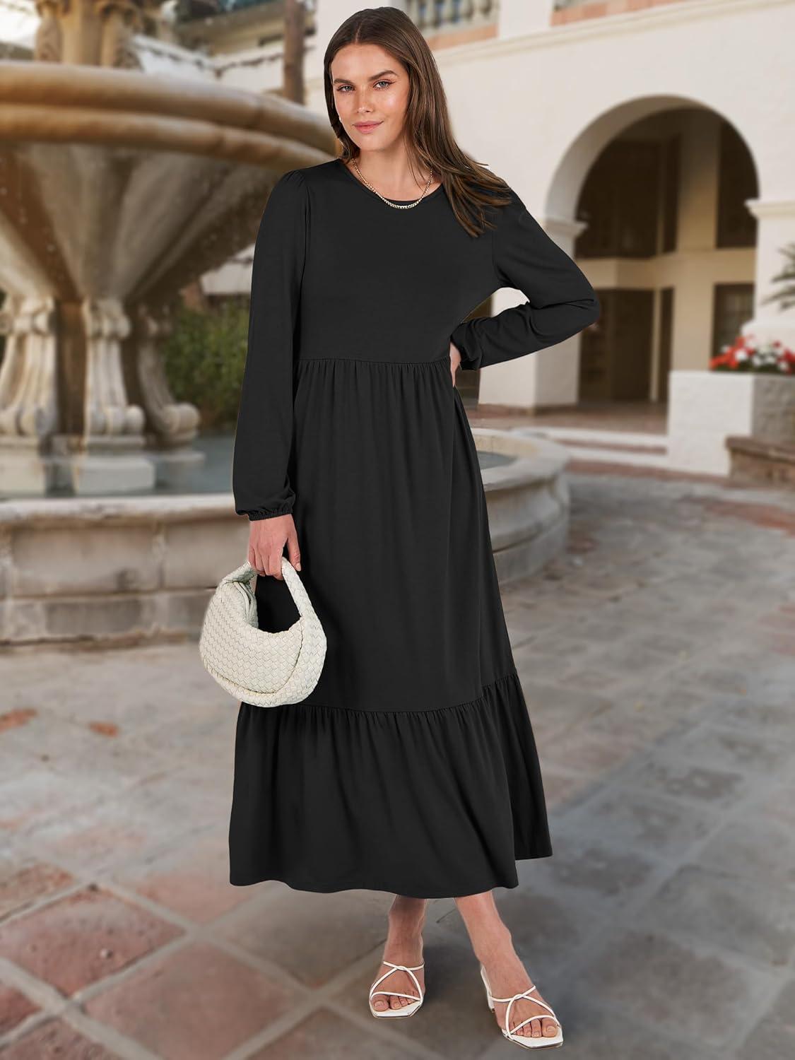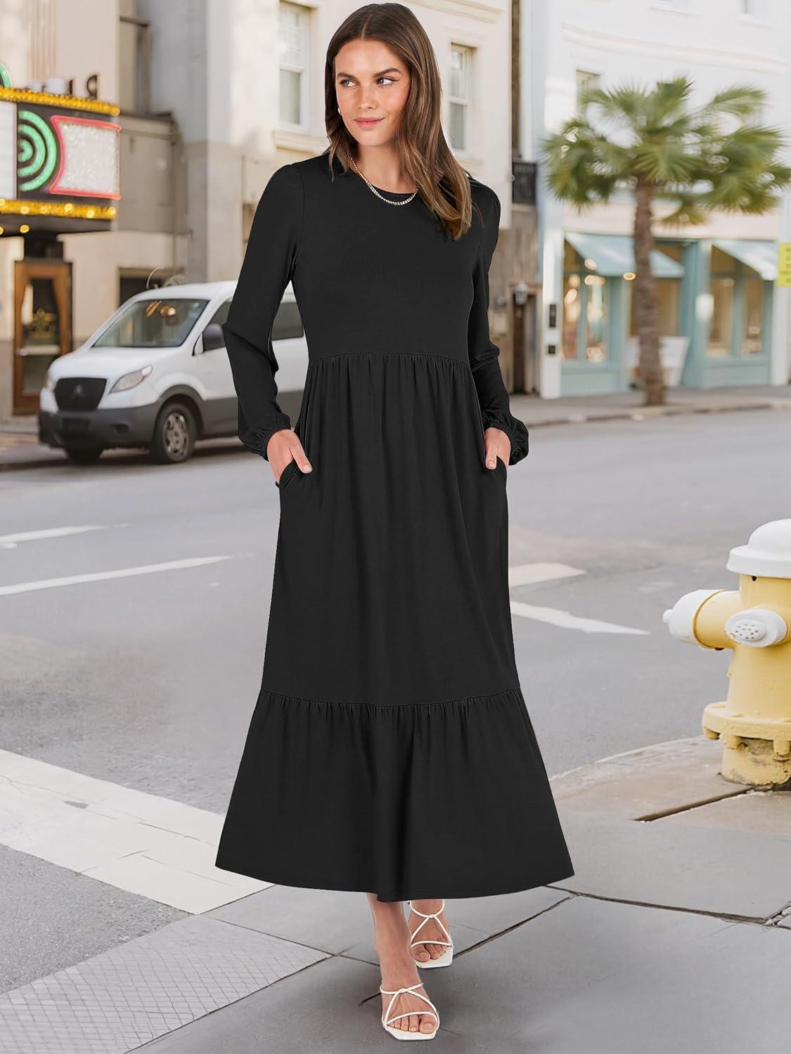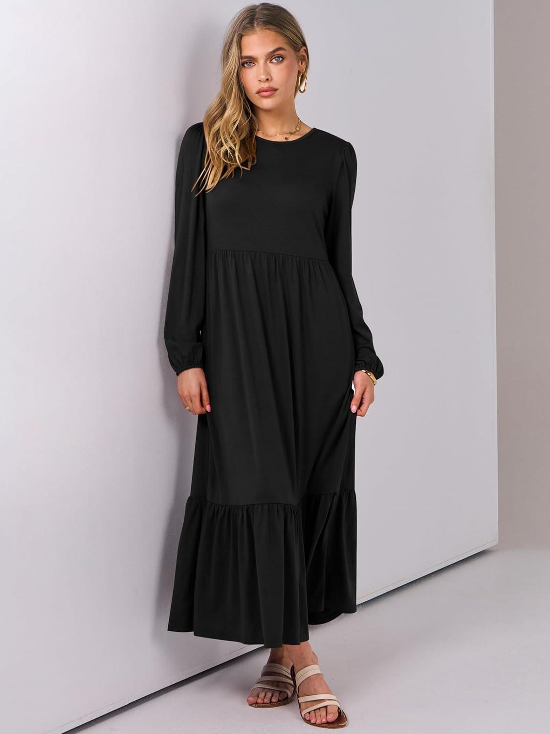 ANRABESS Long Sleeve Midi Dresses for Women Casual 2026 Spring Crewneck A Line Tiered Flowy Loose Trendy Dresses with Pockets(Black)