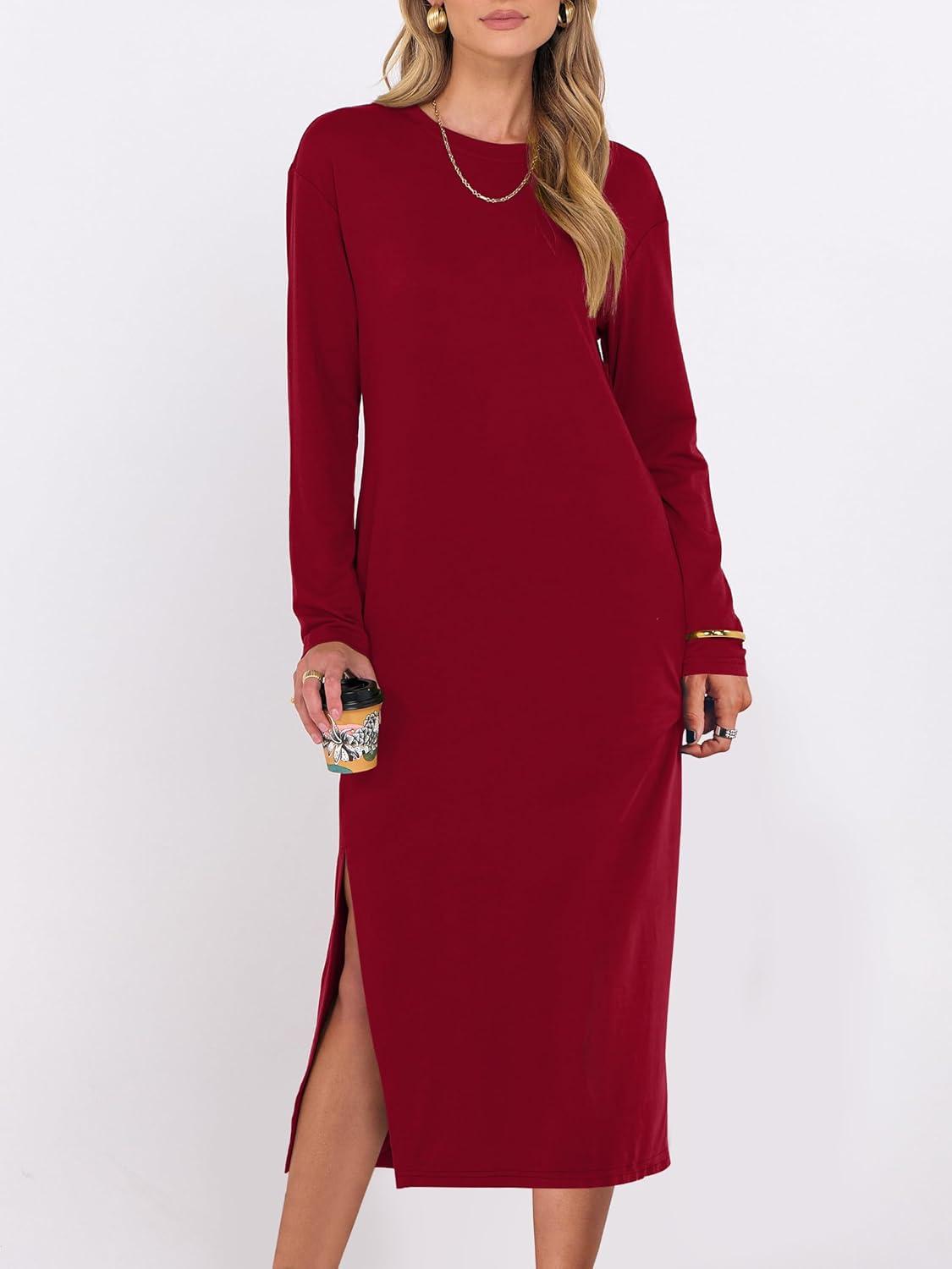ANRABESS Long Sleeve Midi Dresses for Women Fall Fashion Casual Vacation Crewneck Loose Split Striped Long Tshirts Dress(Red)