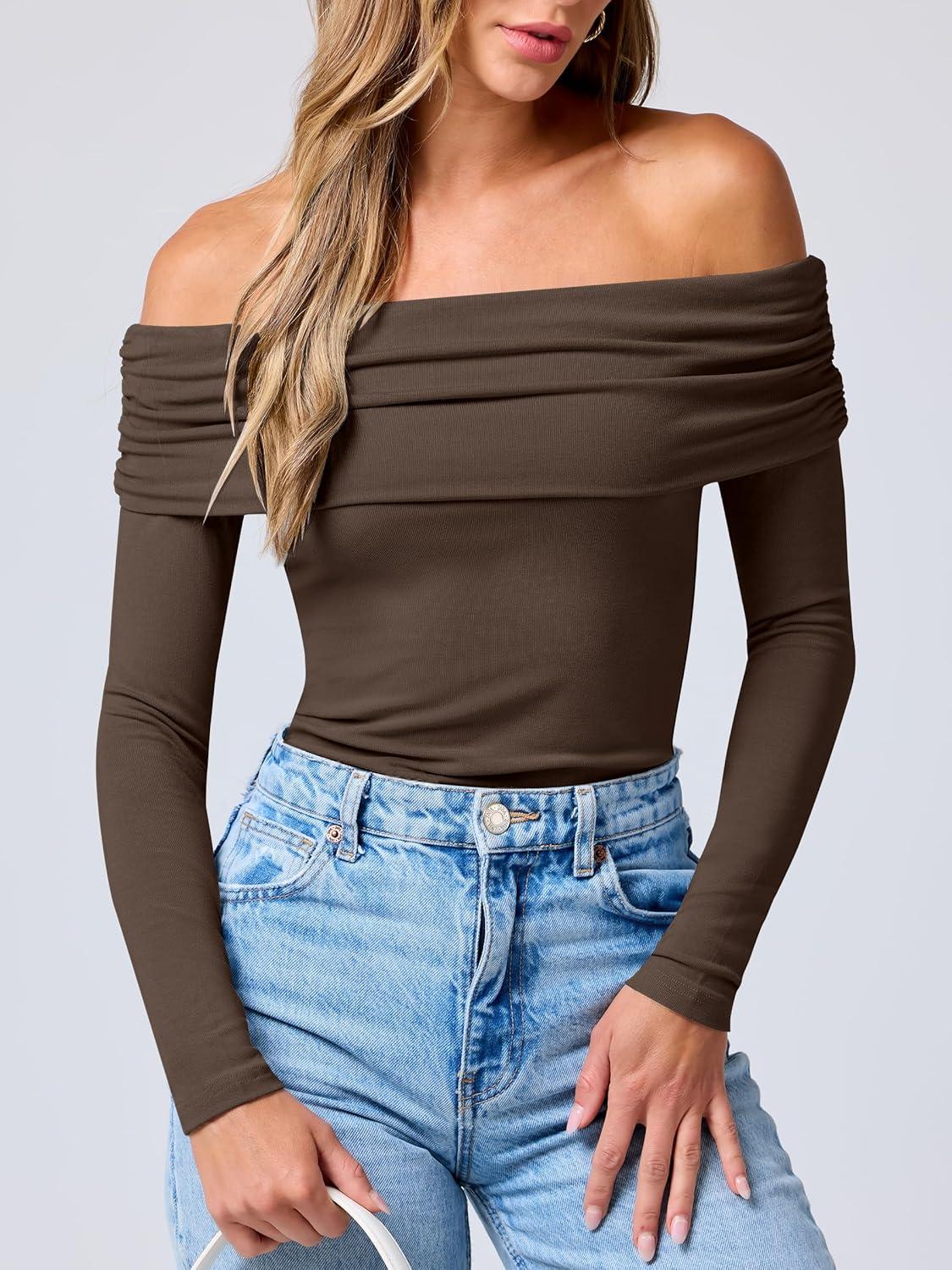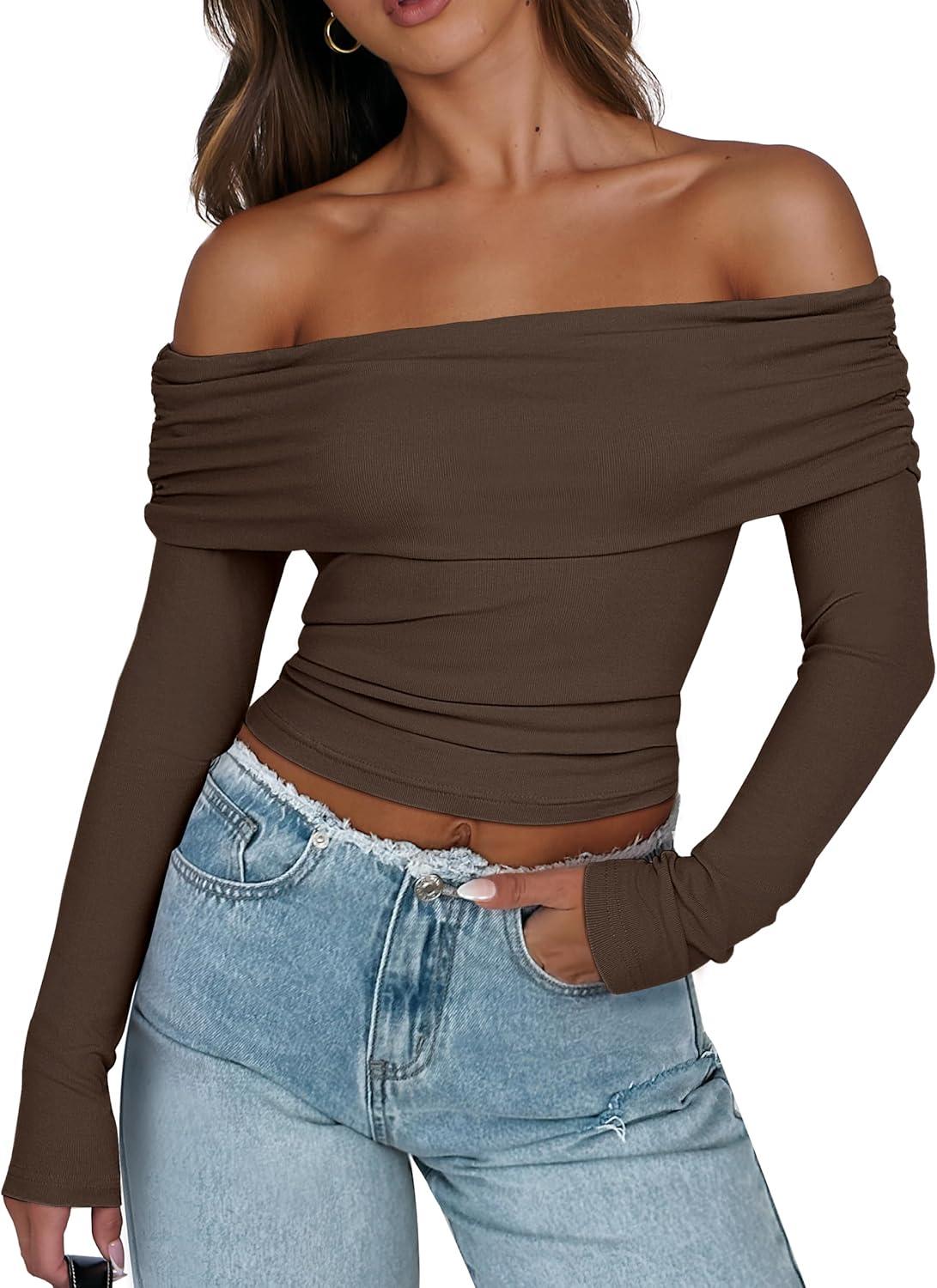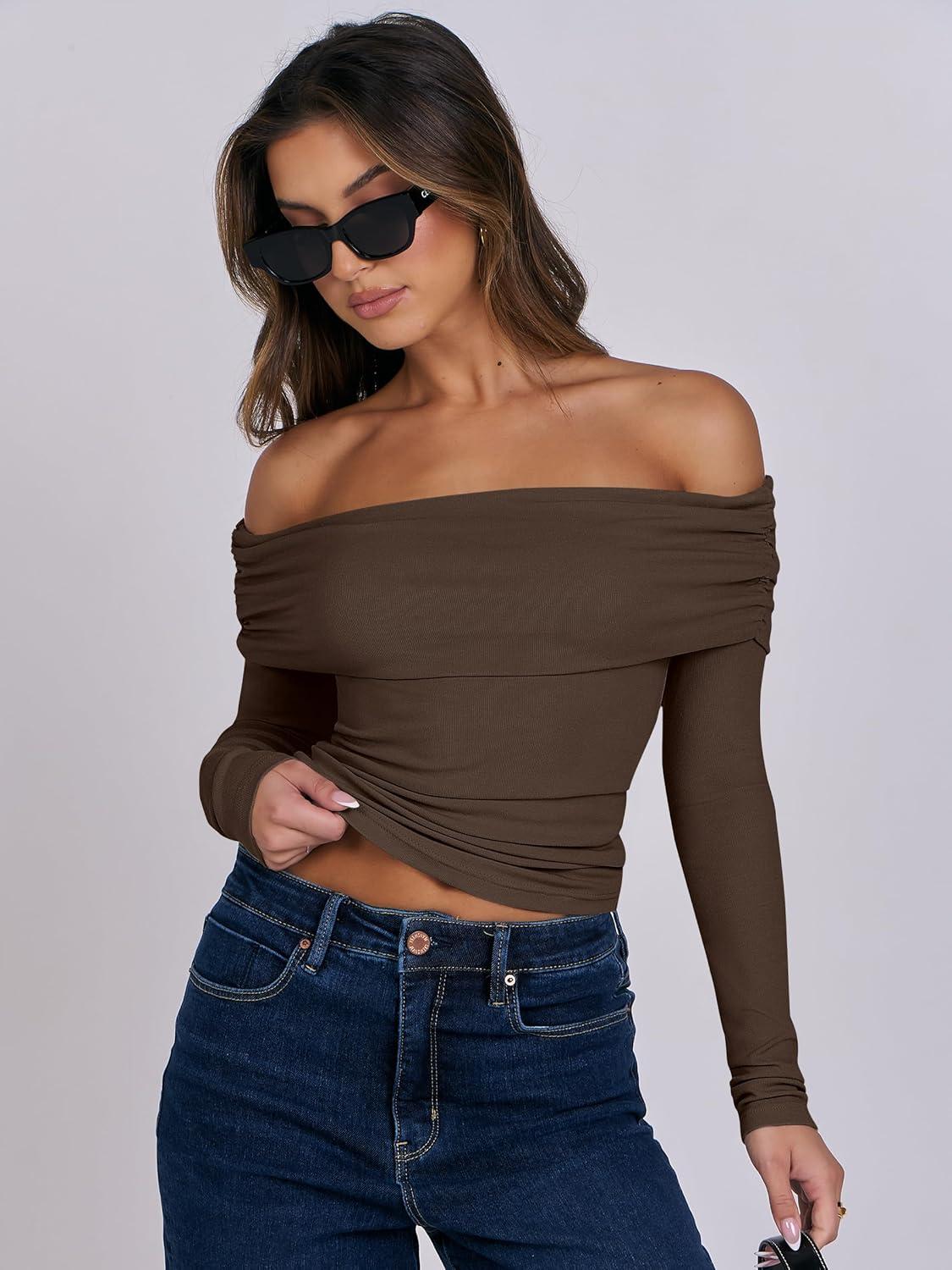 ANRABESS Long Sleeve Shirt for Women 2025 Fall Off Shoulder Slim Fit Tee Top Sexy Going Out Ruched Blouses Y2K Trendy Clothes(Brown)
