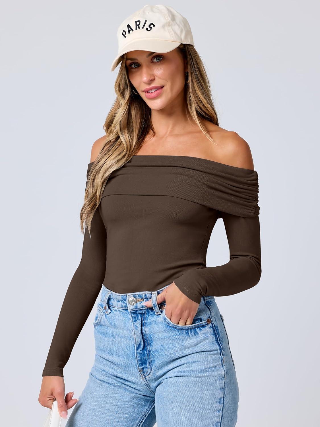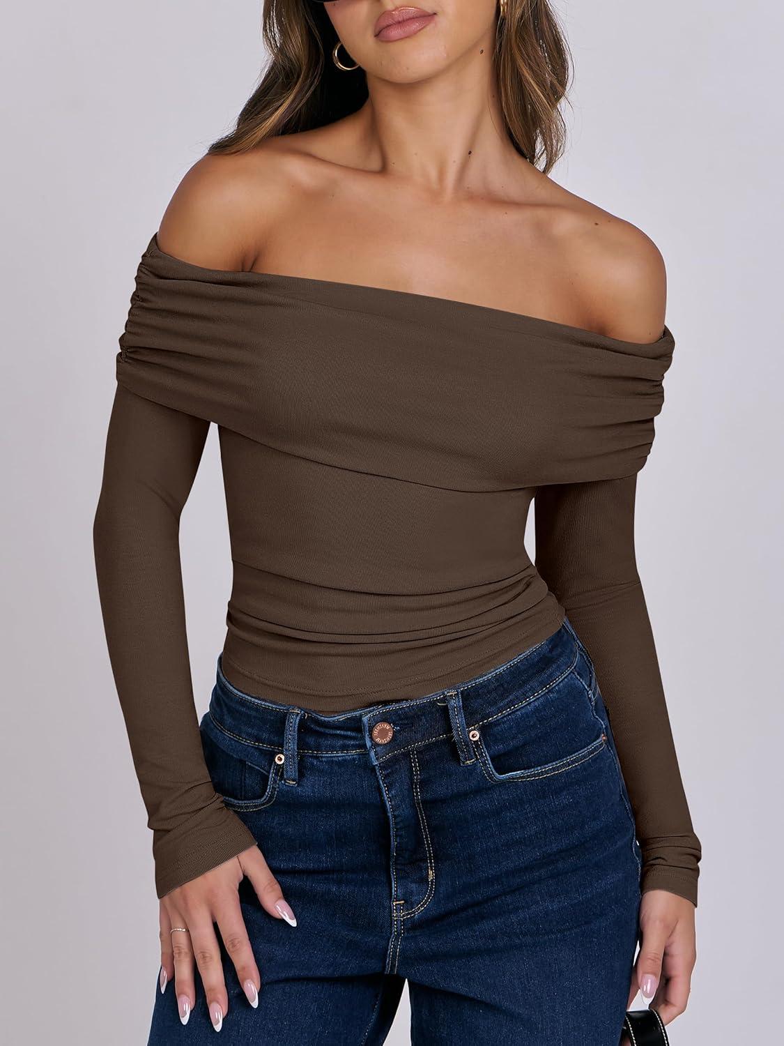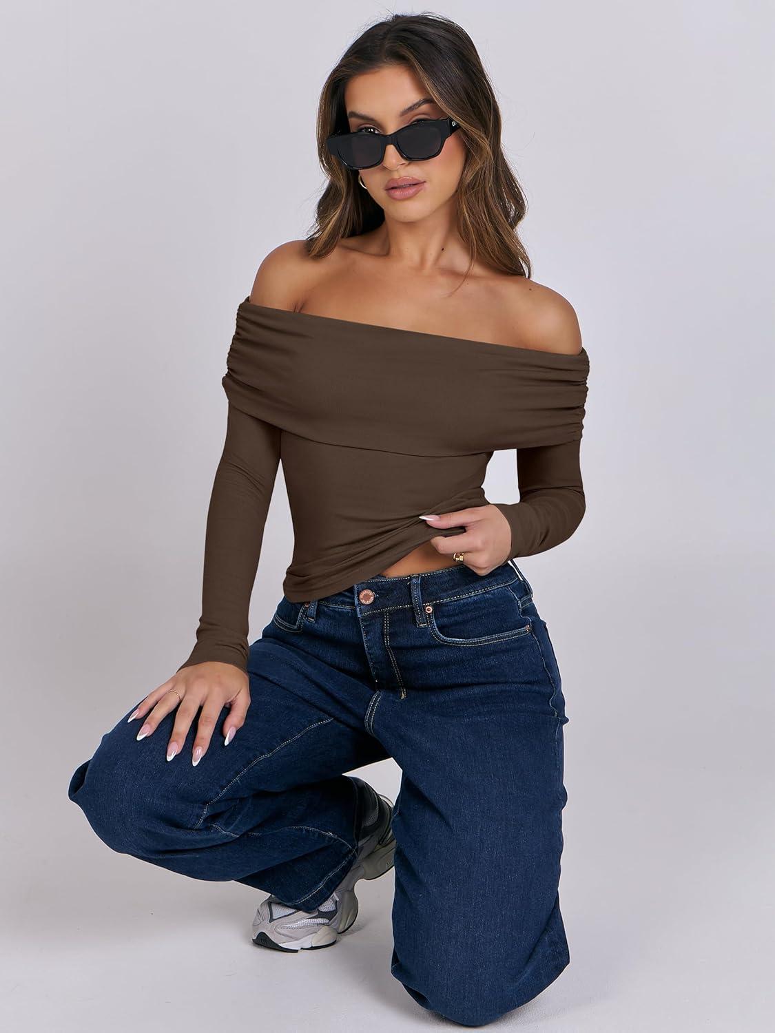 imageANRABESS Long Sleeve Shirt for Women 2025 Fall Off Shoulder Slim Fit Tee Top Sexy Going Out Ruched Blouses Y2K Trendy ClothesBrown
