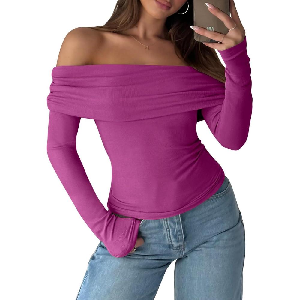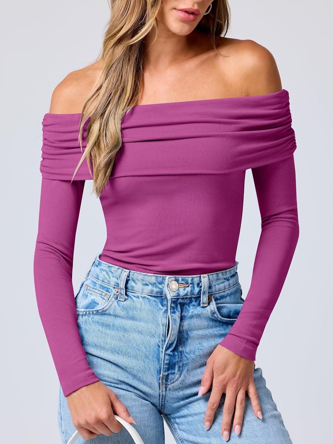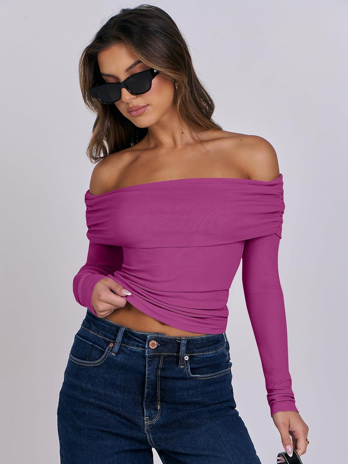 imageANRABESS Long Sleeve Shirt for Women 2025 Fall Off Shoulder Slim Fit Tee Top Sexy Going Out Ruched Blouses Y2K Trendy ClothesHot Pink