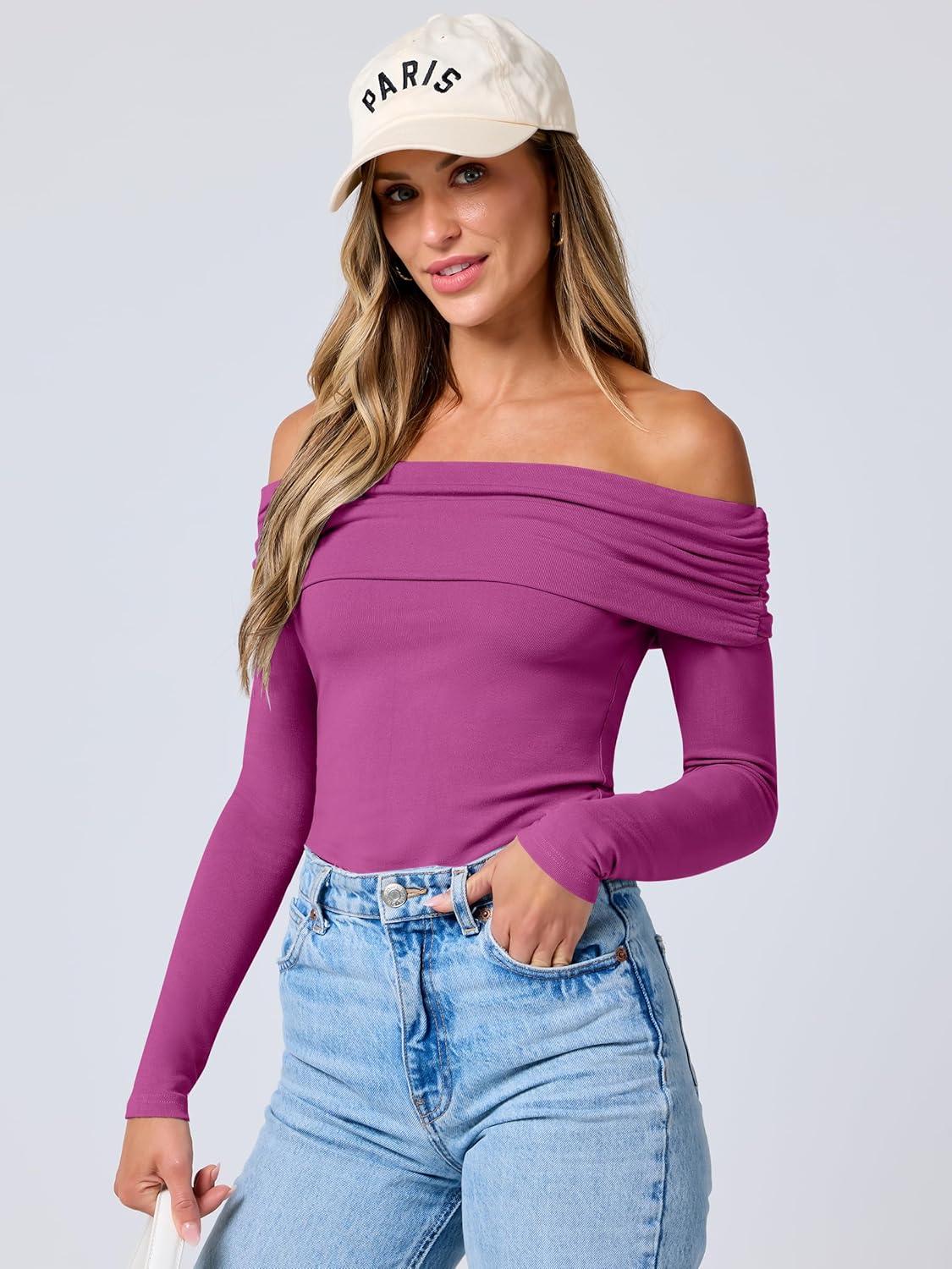 ANRABESS Long Sleeve Shirt for Women 2025 Fall Off Shoulder Slim Fit Tee Top Sexy Going Out Ruched Blouses Y2K Trendy Clothes(Hot Pink)