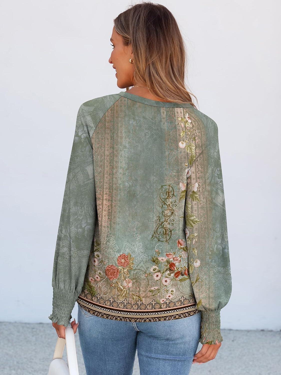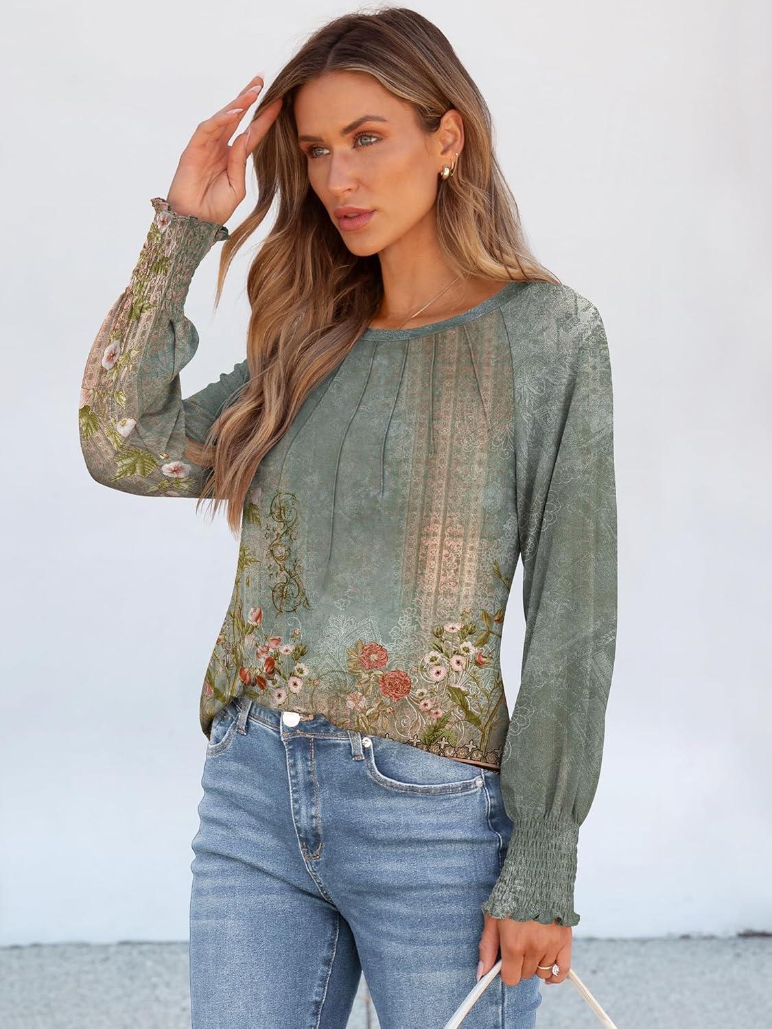 ANRABESS Long Sleeve Shirts for Women 2025 Fall Dressy Casual Tops Pleated Crewneck Loose Basic Blouses Fashion(Floral Print)