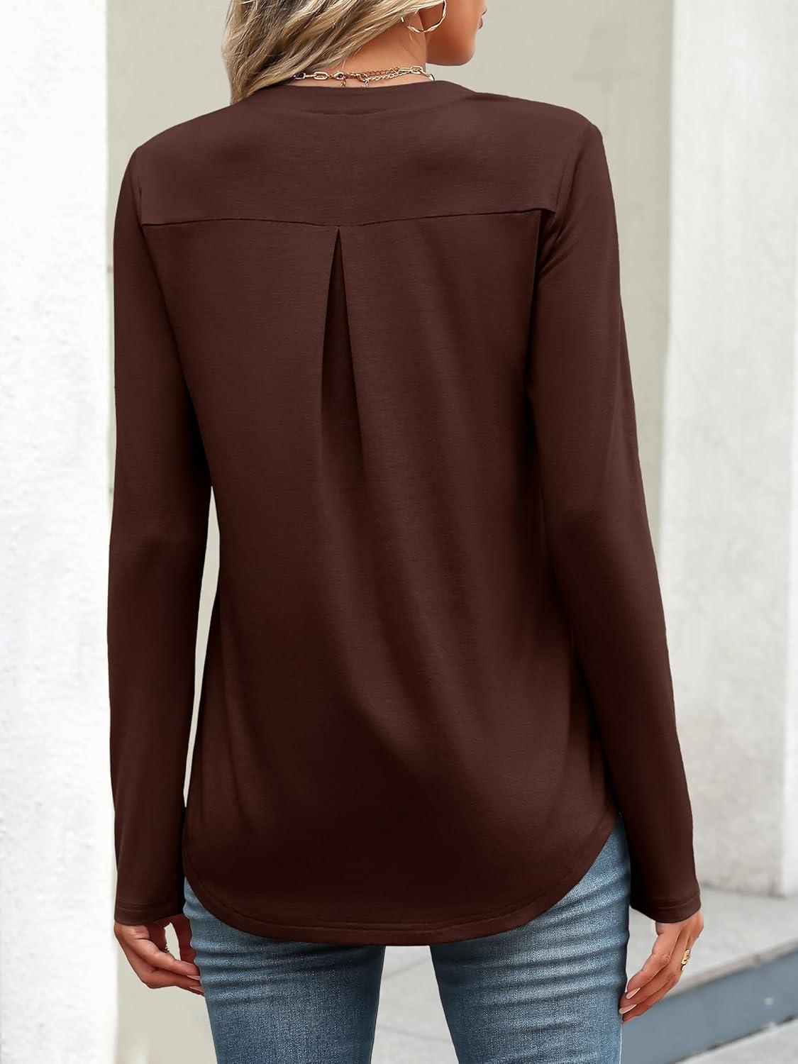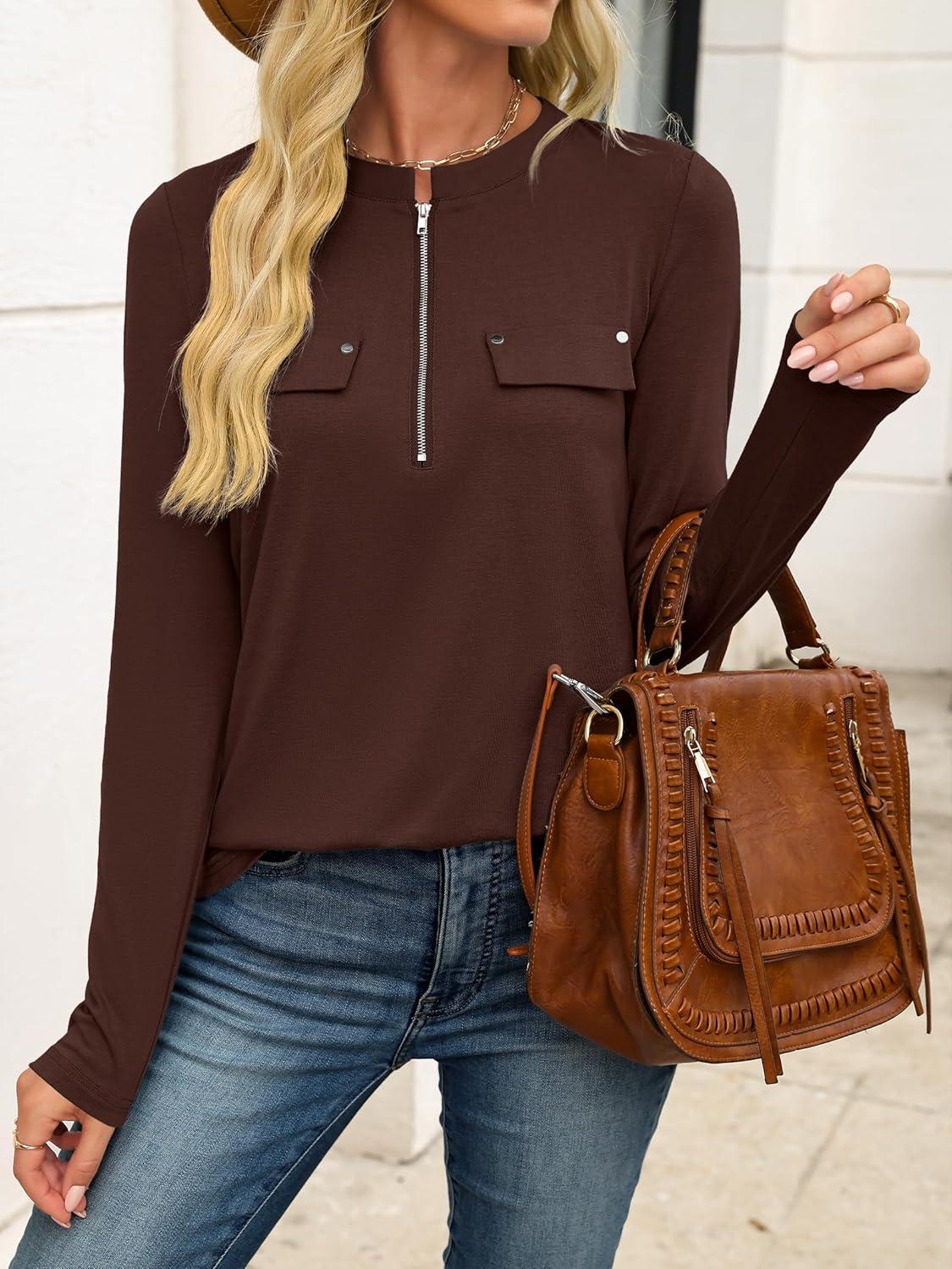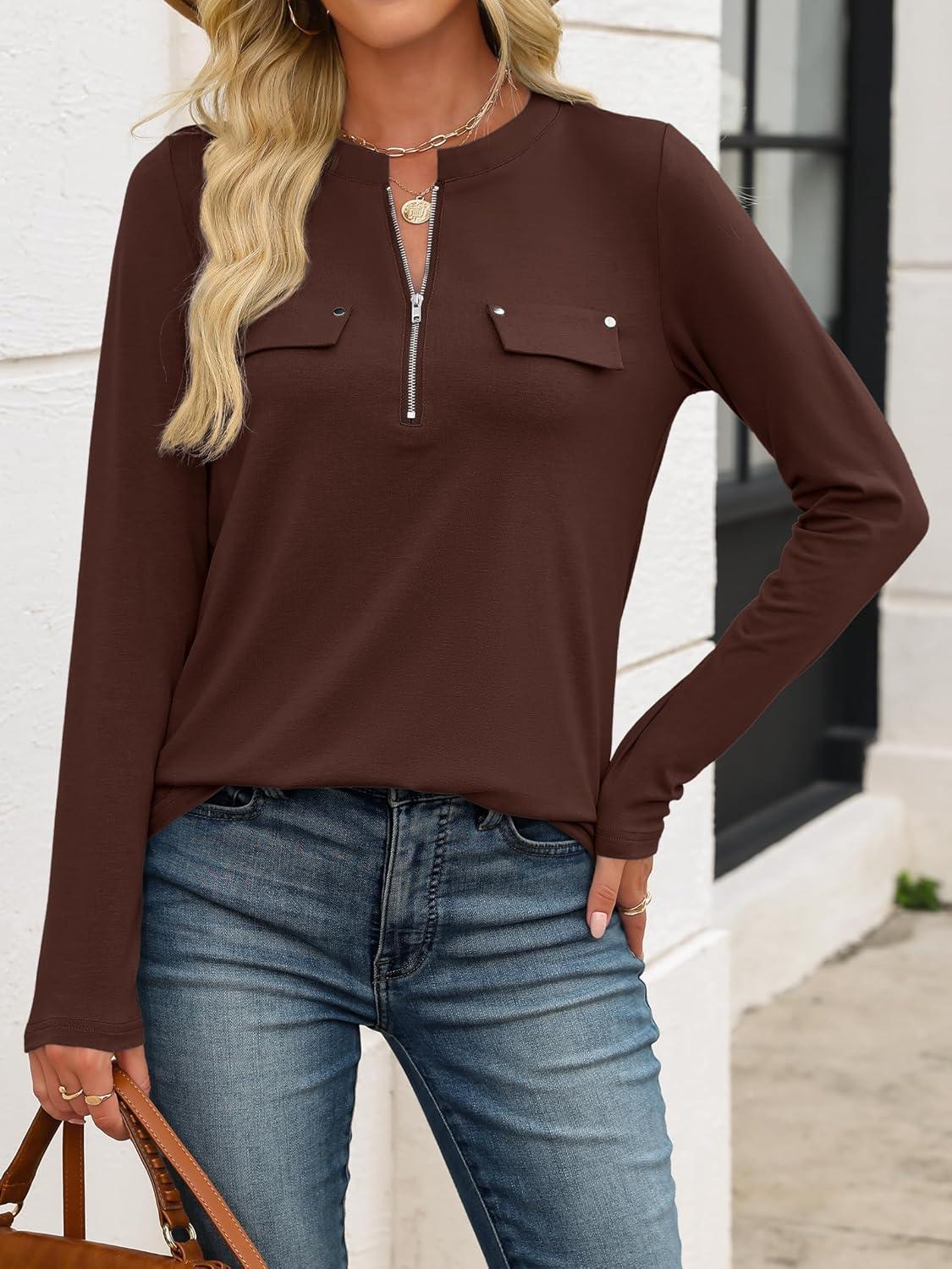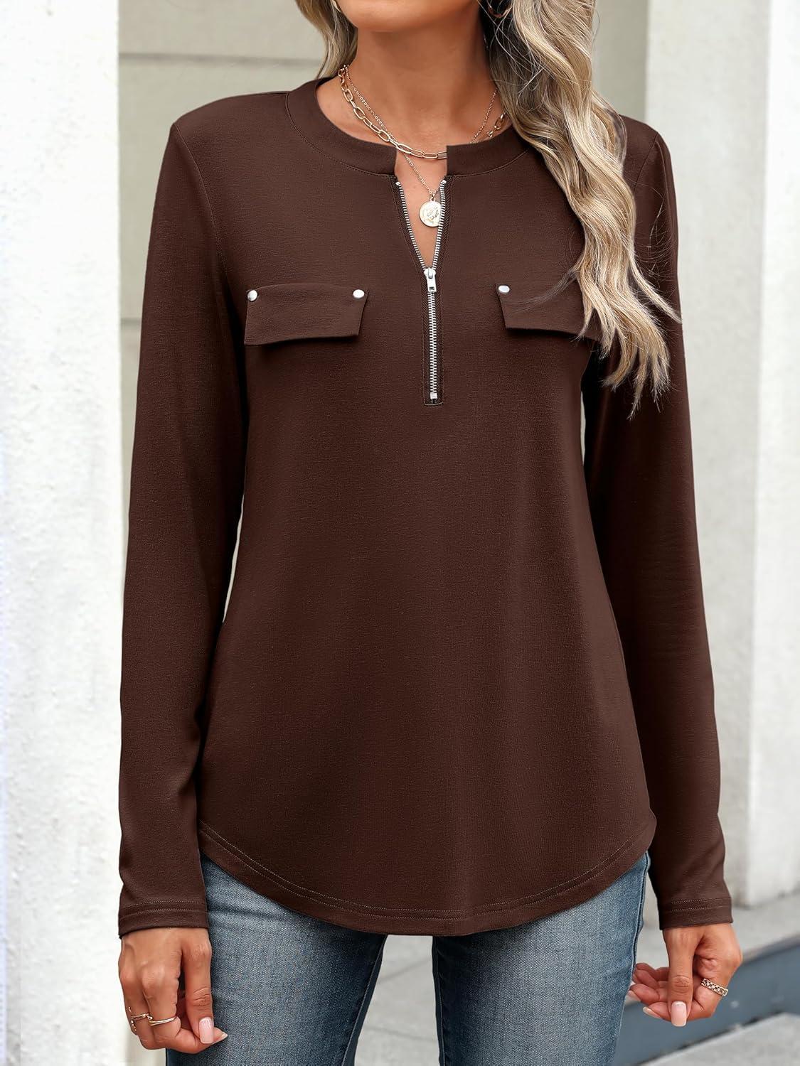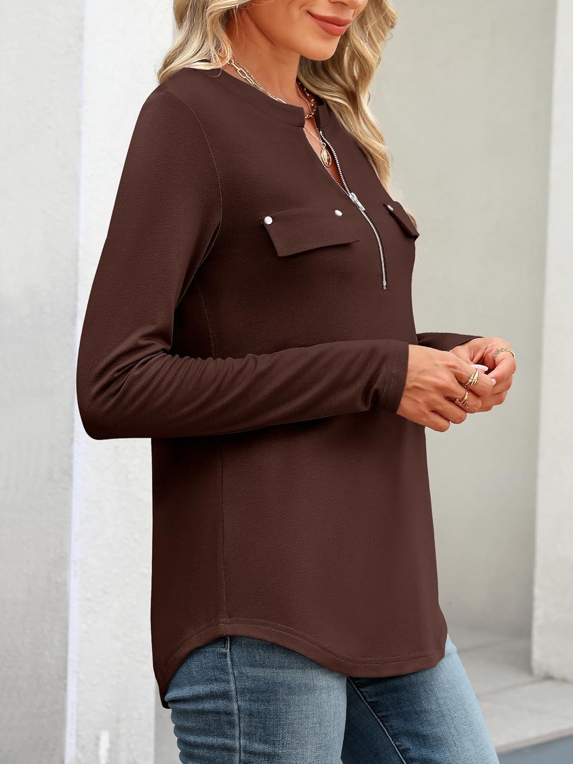 ANRABESS Long Sleeve Shirts for Women Business Dressy Casual Tops V Neck Half Zipper Blouses 2025 Fall Fashion Work Outfits(Brown)