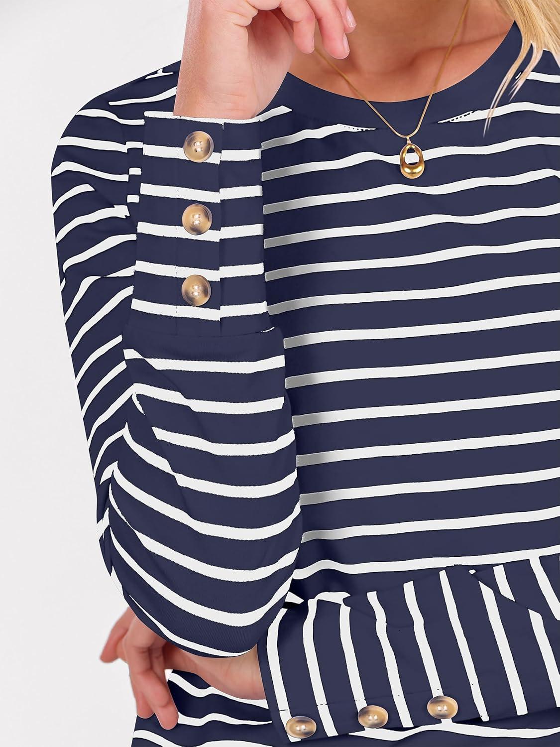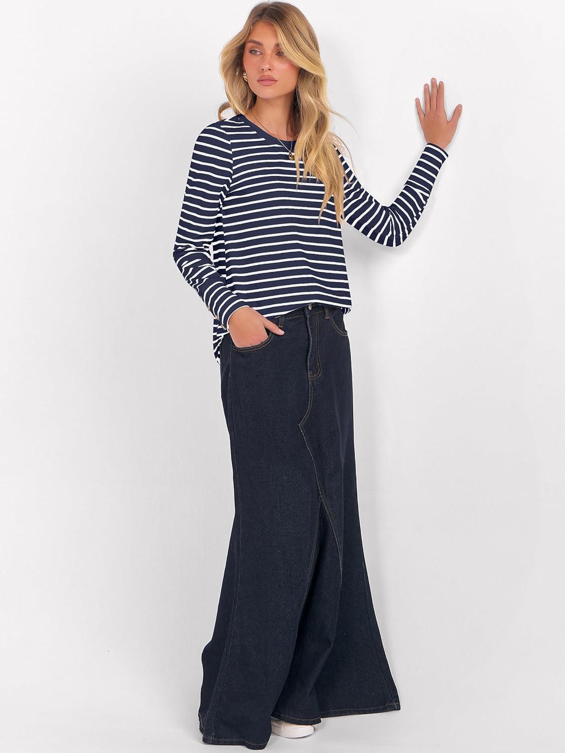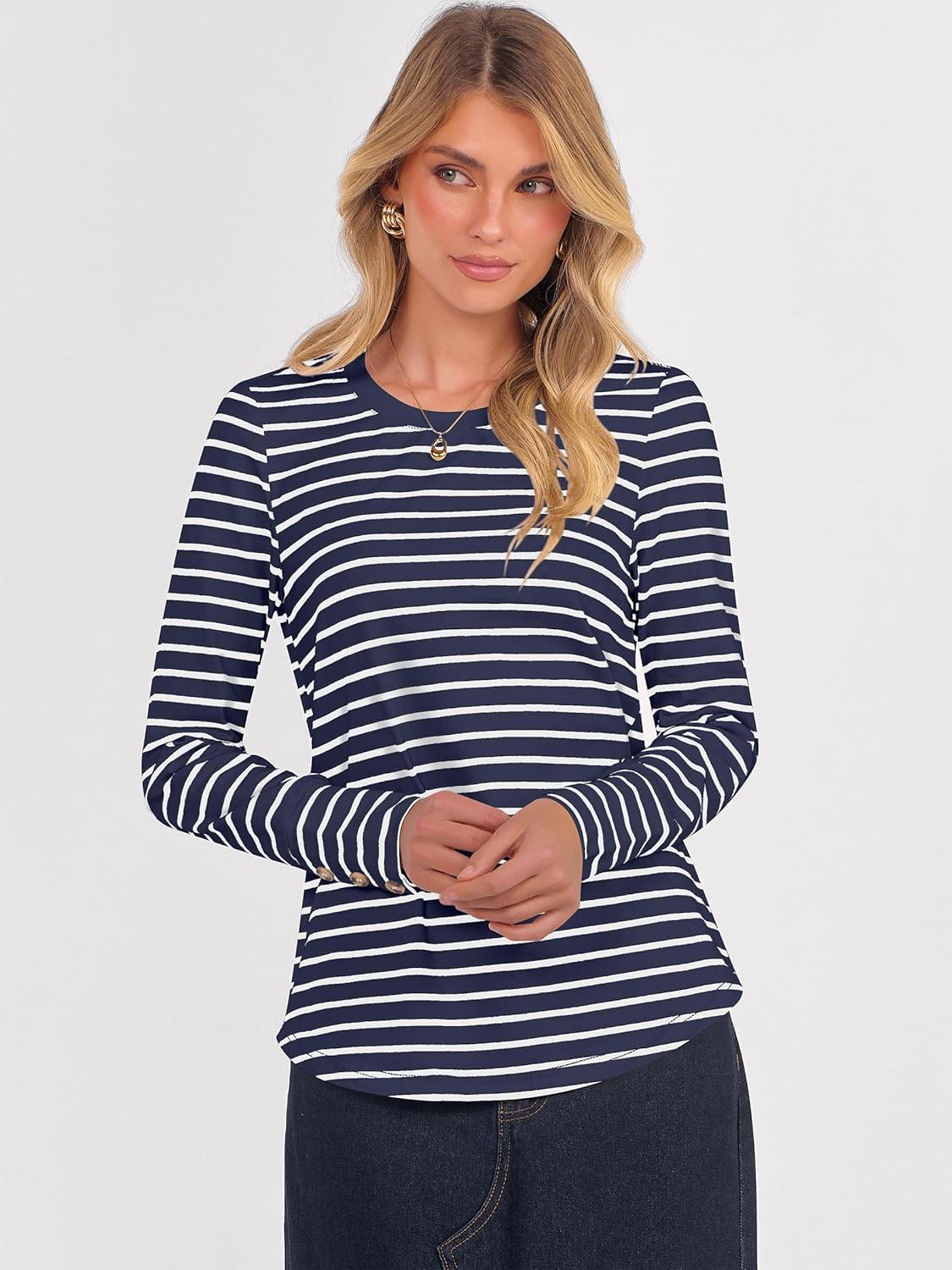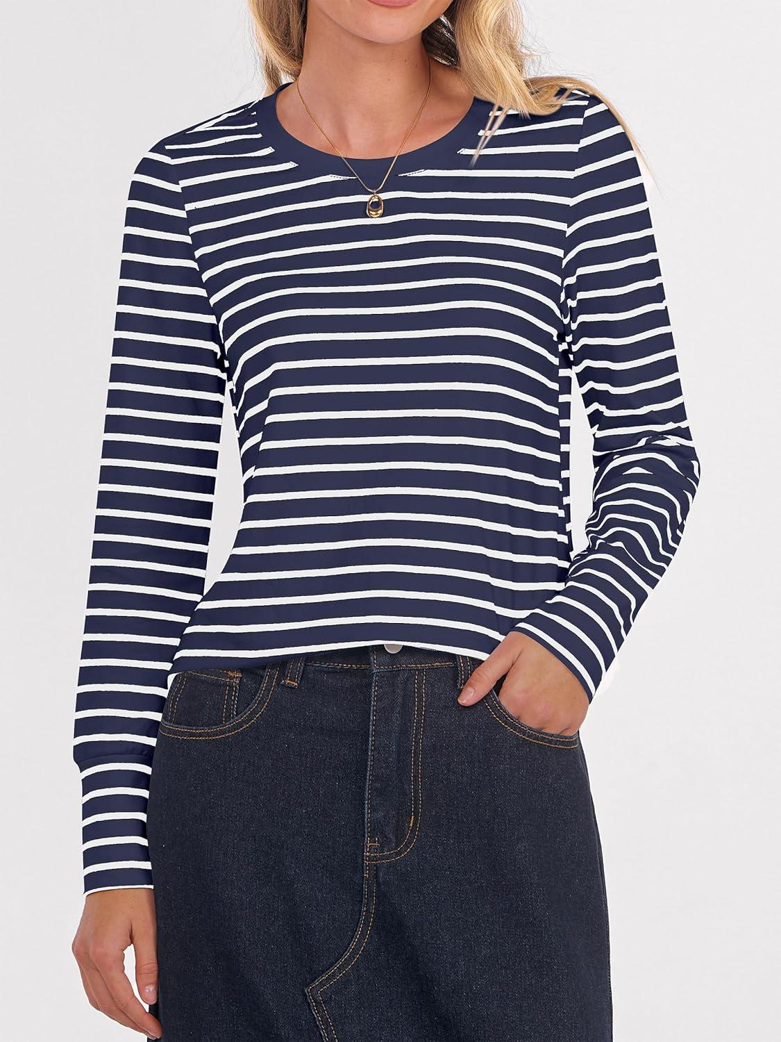 ANRABESS Long Sleeve Shirts for Women Crewneck Basic Tee Striped Tops 2025 Fall Casual Loose Fit T Shirts Fashion Outfits(Blue White Stripe)