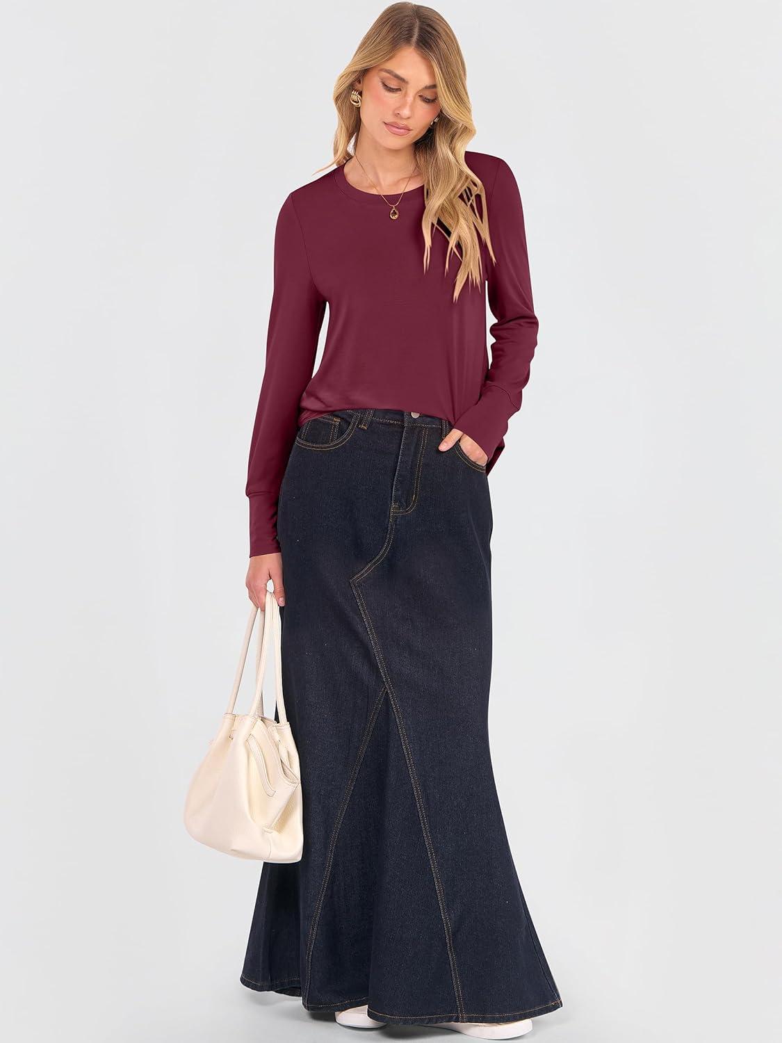 ANRABESS Long Sleeve Shirts for Women Crewneck Basic Tee Striped Tops 2025 Fall Casual Loose Fit T Shirts Fashion Outfits(Burgundy)