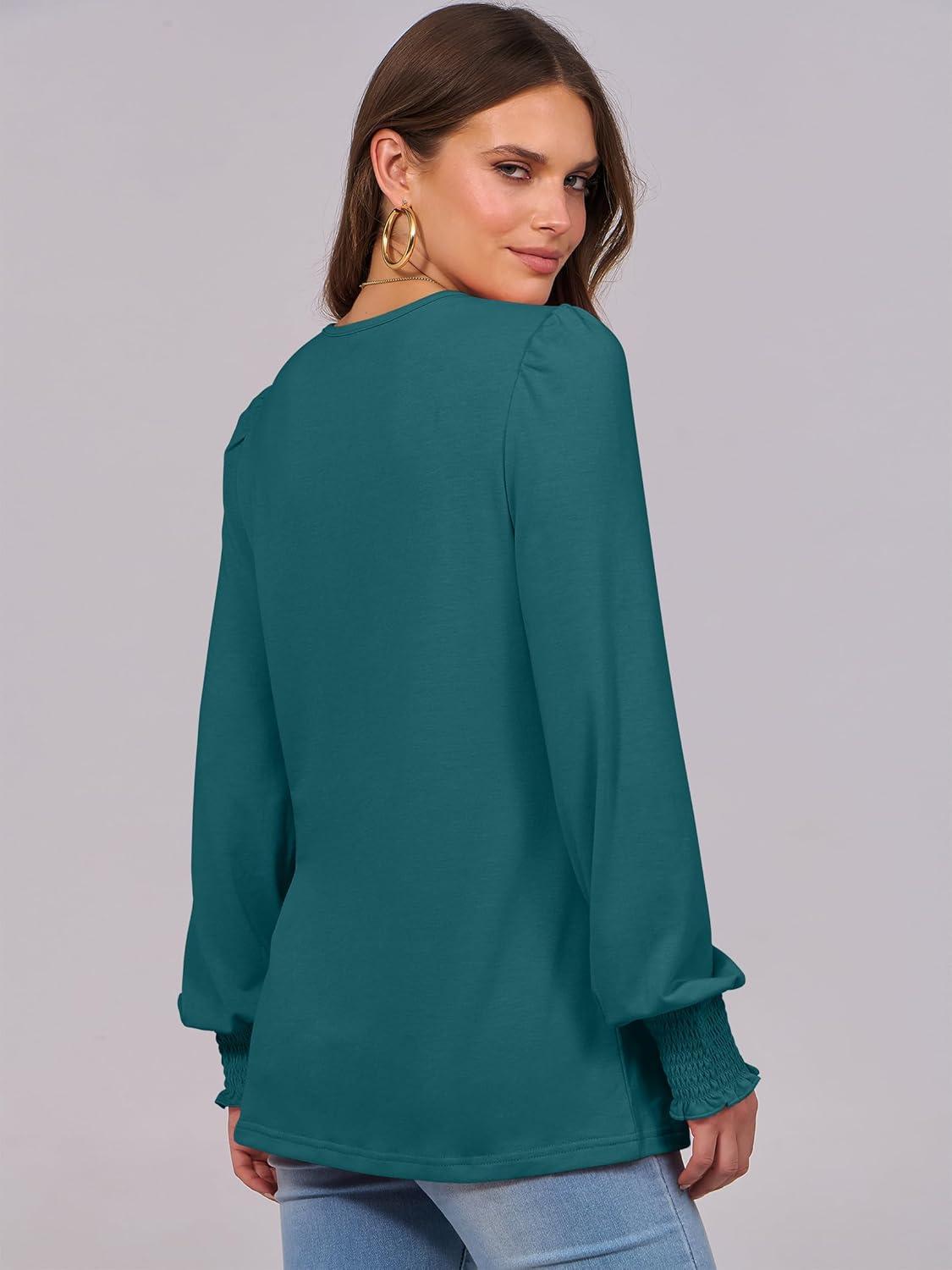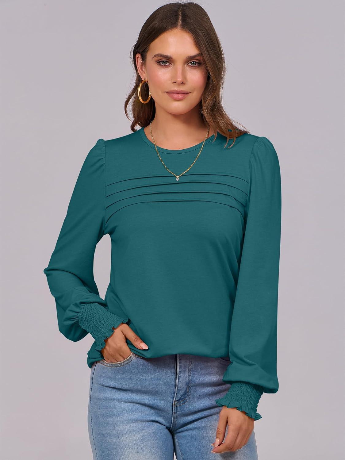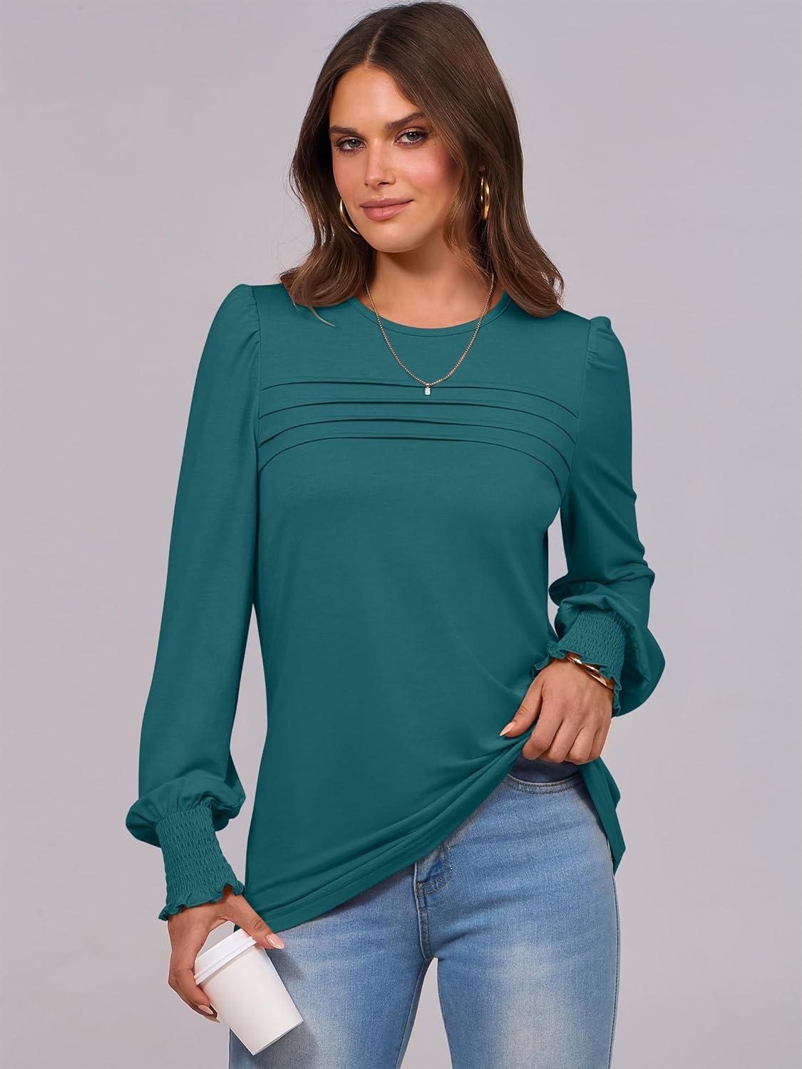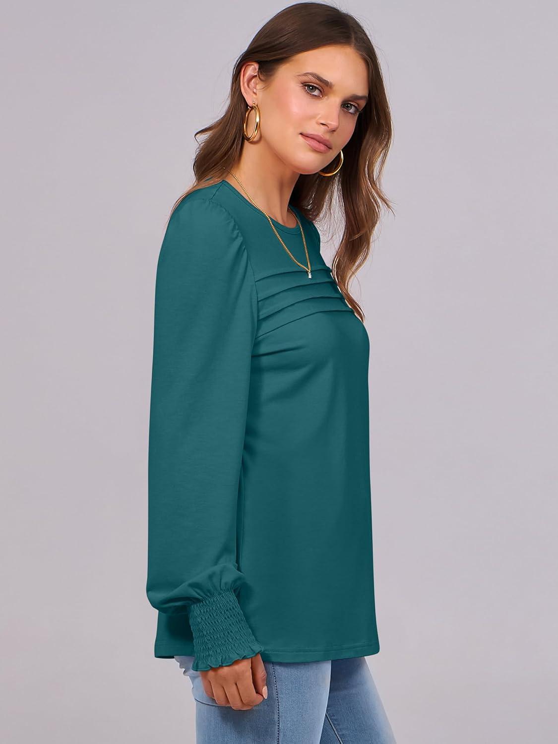 ANRABESS Long Sleeve Shirts for Women Fall Fashion 2025 Dressy Casual Blouses Trendy Pleated Tunic Tops Outfits(Blue Green)