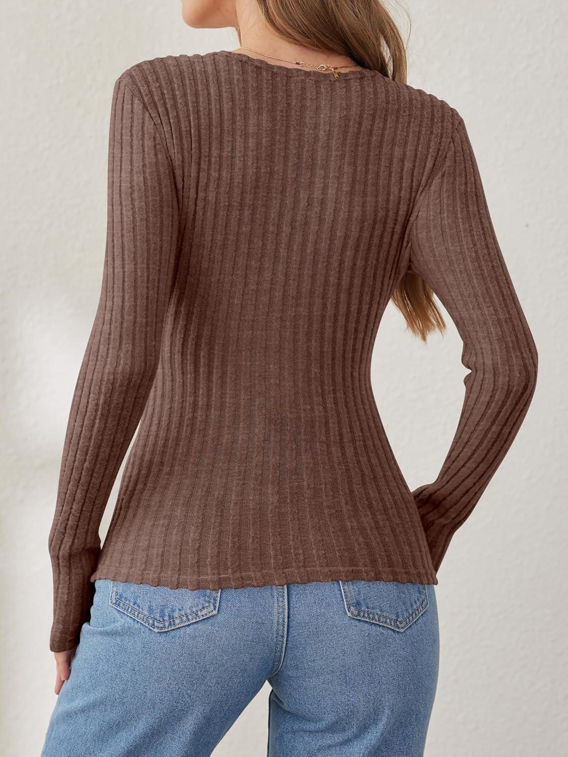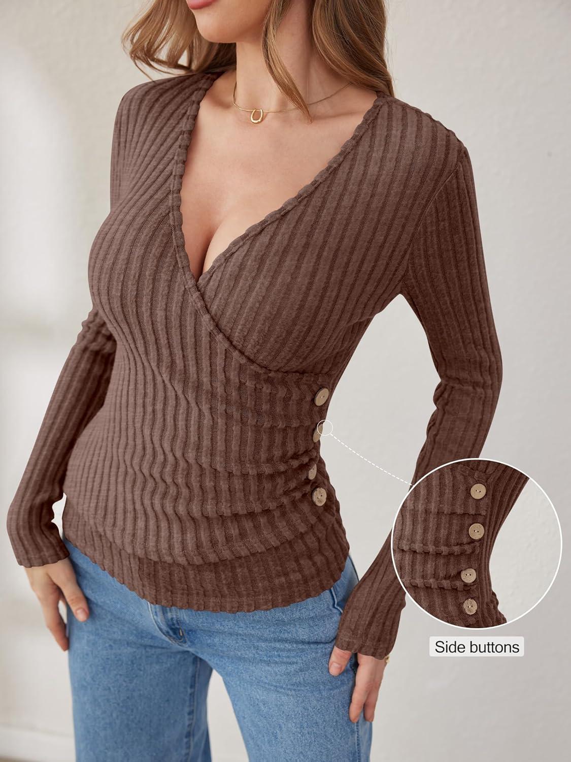 ANRABESS Long Sleeve Shirts for Women Sexy Sweater V Neck Ribbed Knit Slim Fit Wrap Top 2025 Fall Casual Fashion Clothes(Brown)