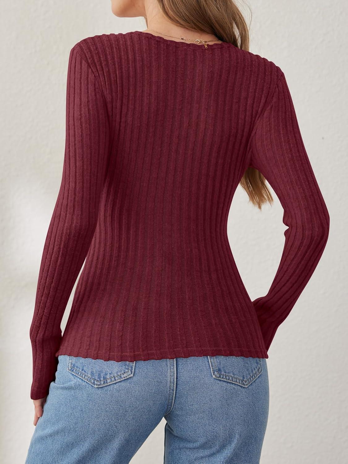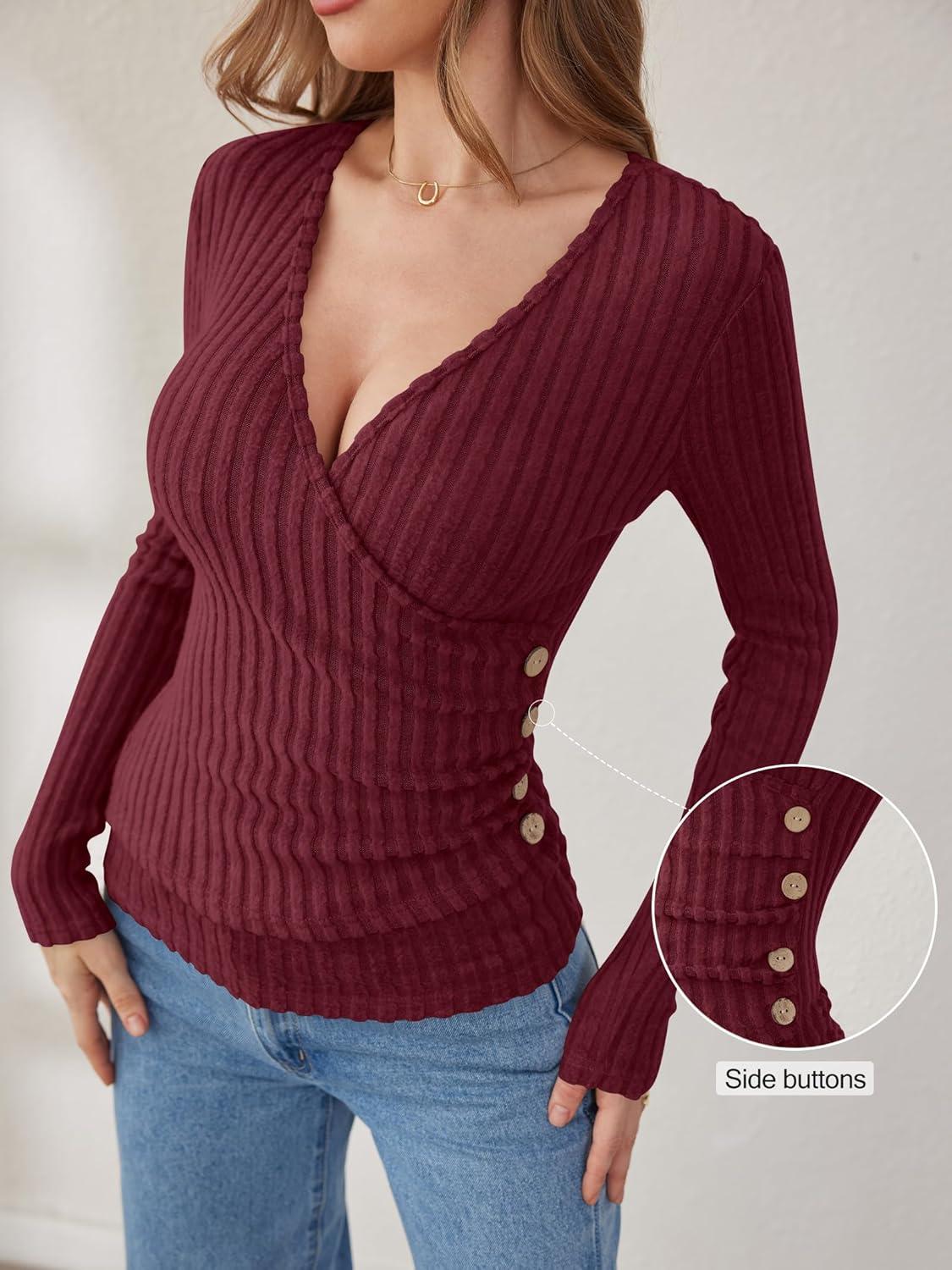 ANRABESS Long Sleeve Shirts for Women Sexy Sweater V Neck Ribbed Knit Slim Fit Wrap Top 2025 Fall Casual Fashion Clothes(Burgundy)