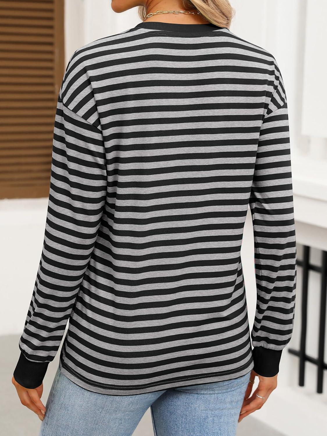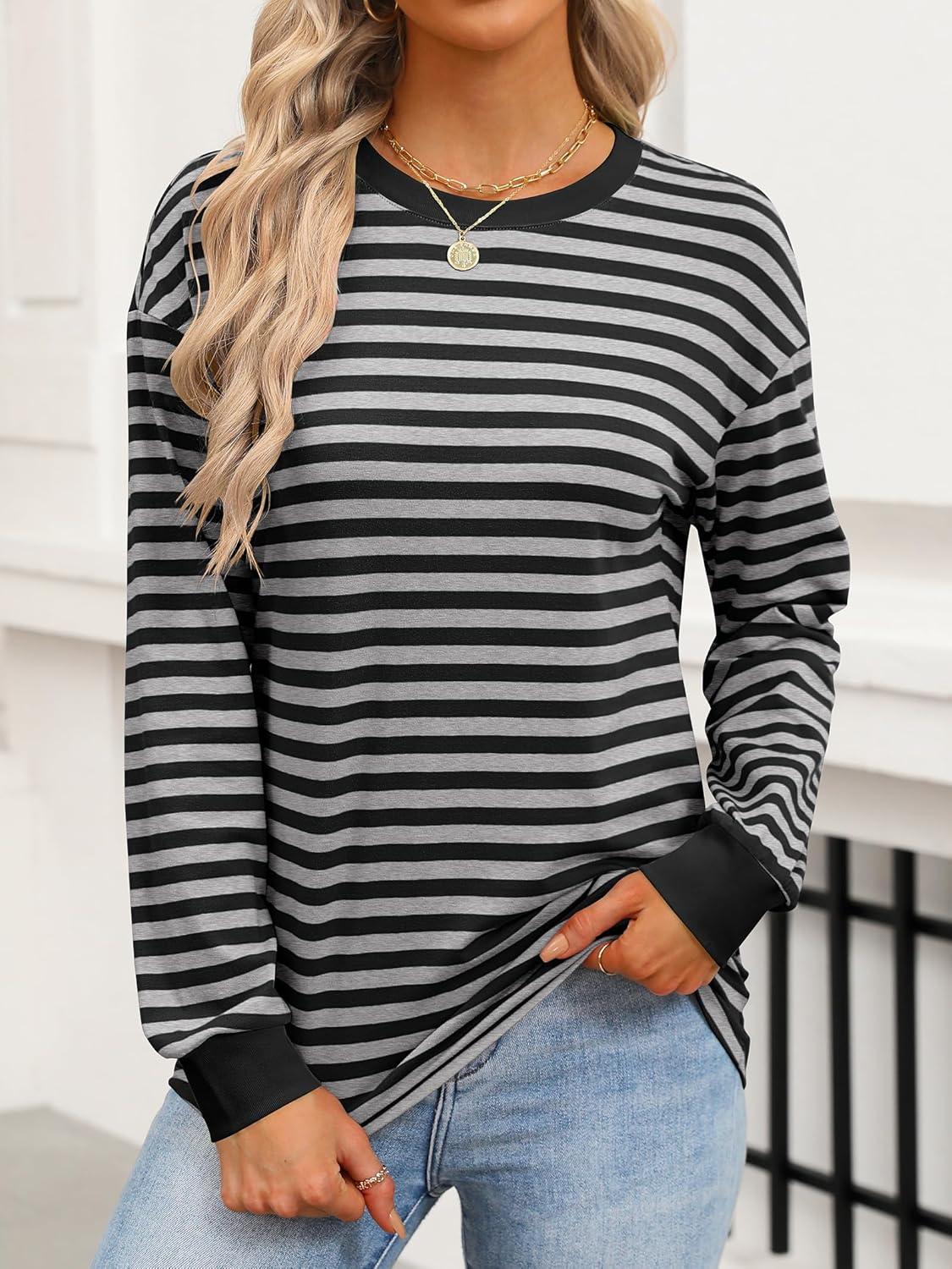 ANRABESS Long Sleeve Shirts for Women Striped Crewneck Loose Fit Tunic Tops 2025 Fall Color Block T-Shirt(Grey Stripes Combo)