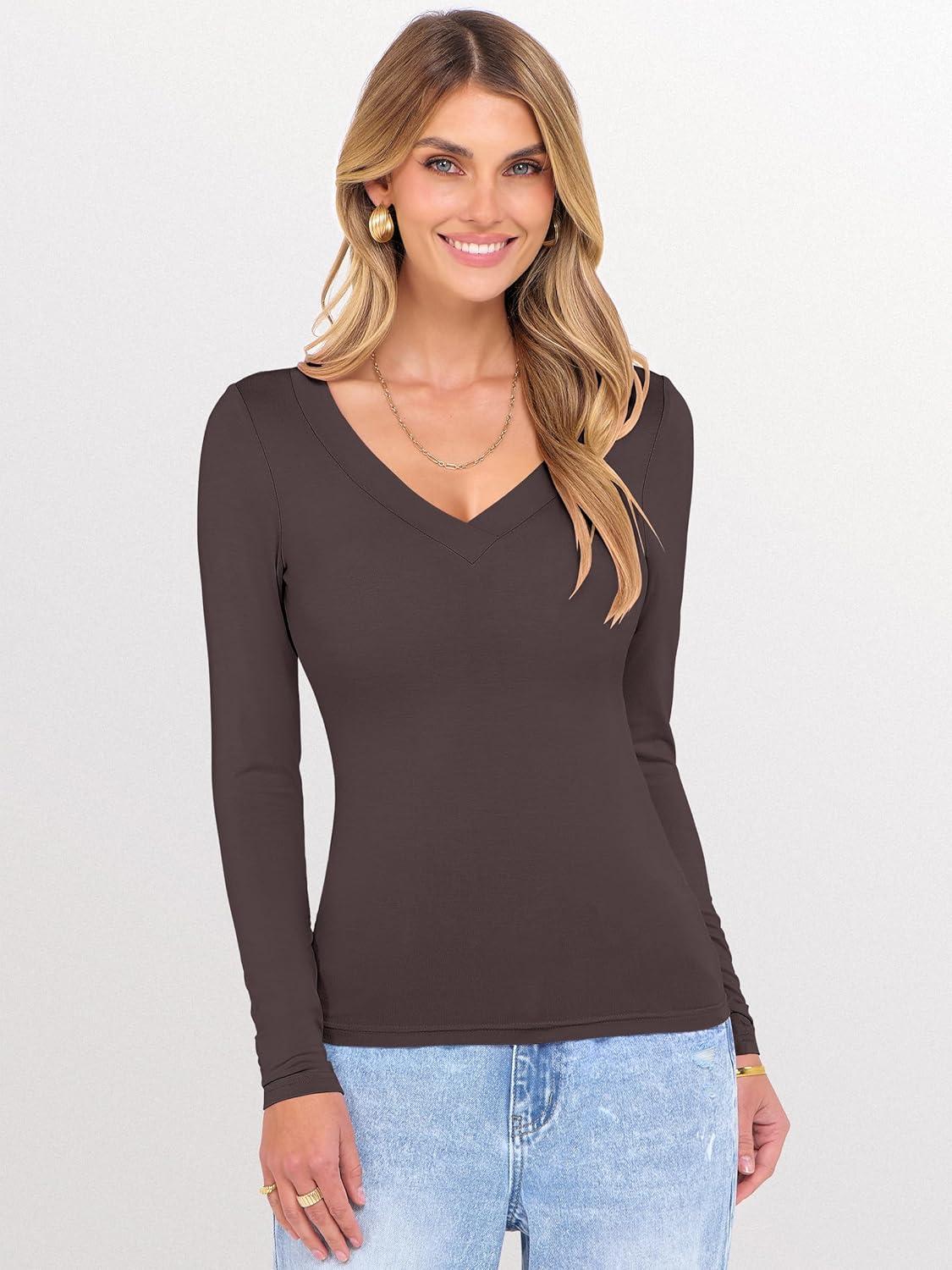 ANRABESS Long Sleeve Shirts for Women V Neck Basic Tees Top Casual Going Out Tshirt Workout Outfits 2025 Fall Fashion Clothes(Dark Brown)